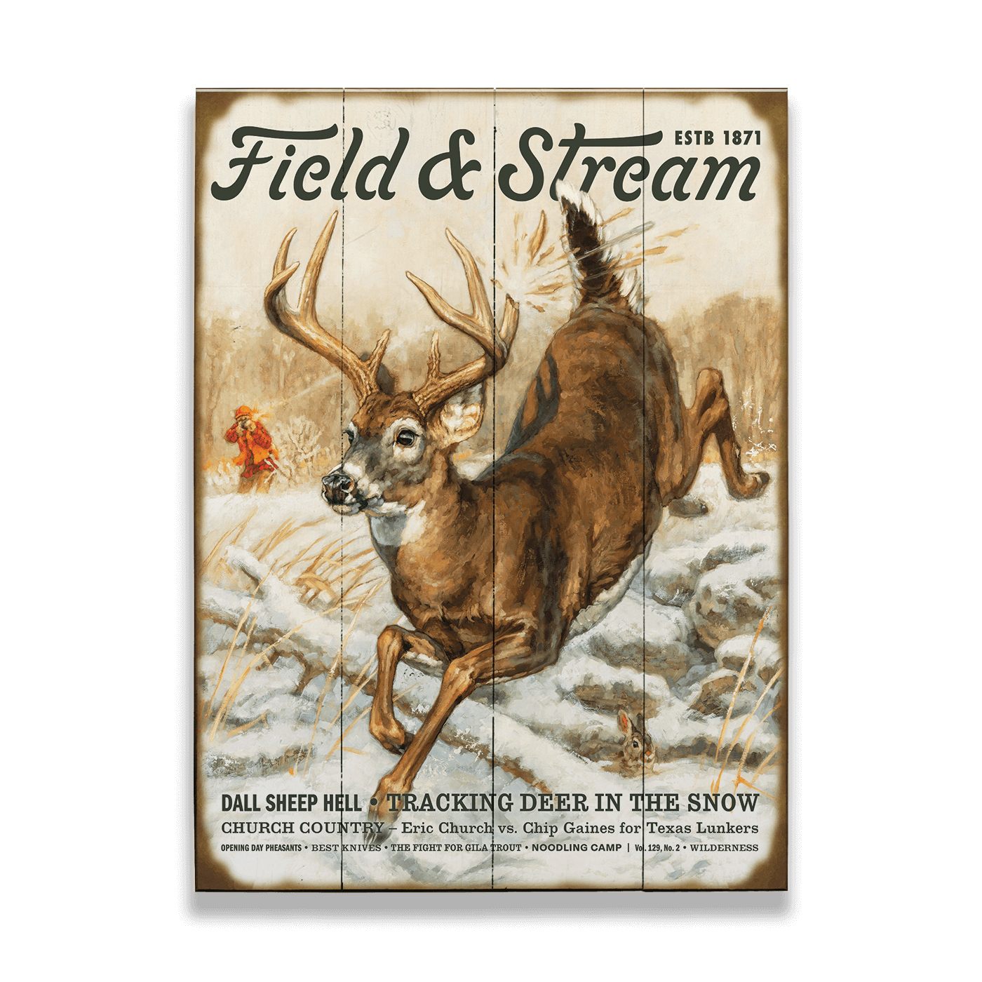 Feel the tension of a narrow escape in this striking Field and Stream cover. A buck bursts through snowy brush, eyes wide and legs driving forward as a hunter fires in the distance. One antler tip shatters—a near miss turned into a moment of survival. The broken tine, scattered snow, and urgent motion capture the razor-thin line between the hunted and the free. A powerful tribute to the unpredictability and intensity of the winter chase, perfect for lodge decor or collectors of classic sporting art.