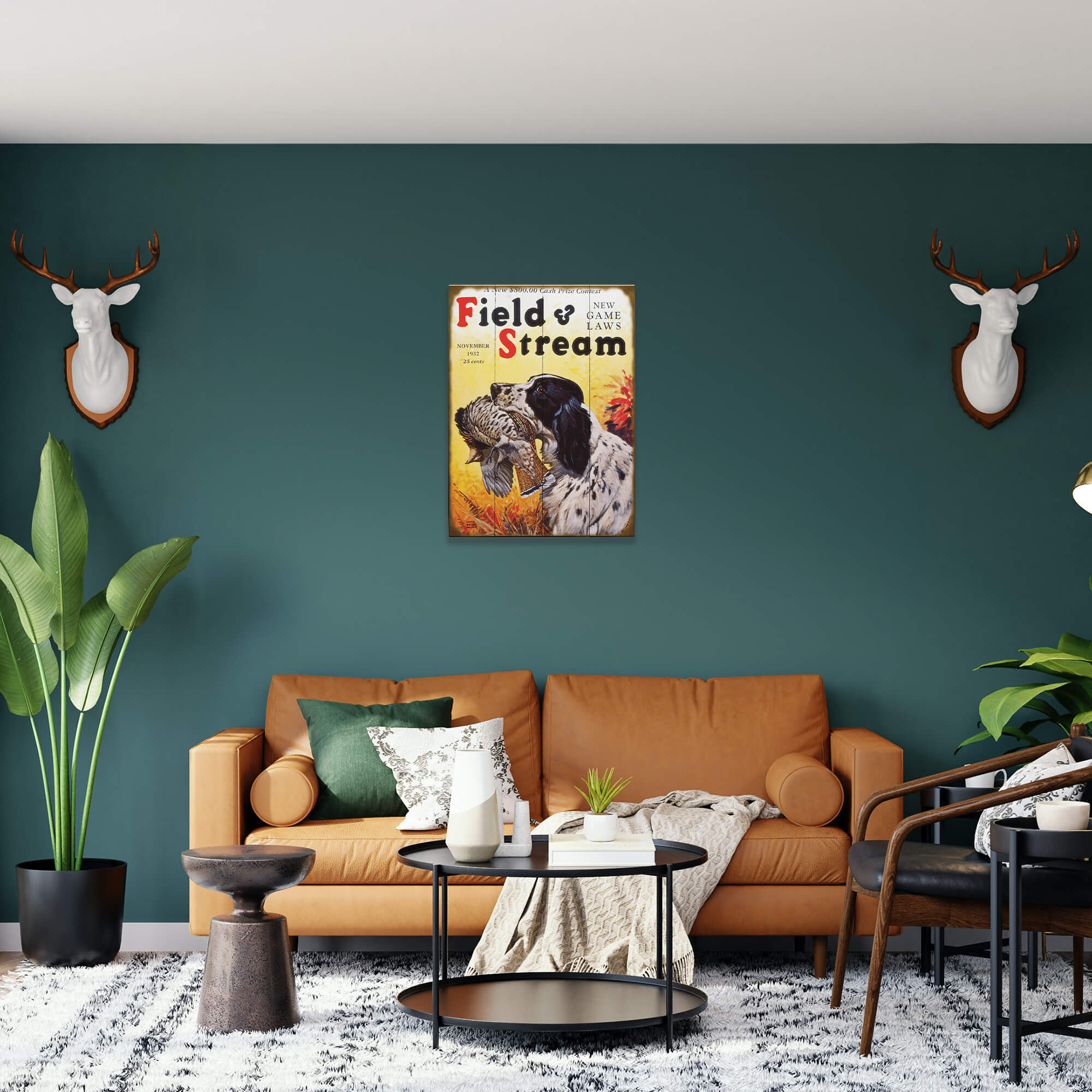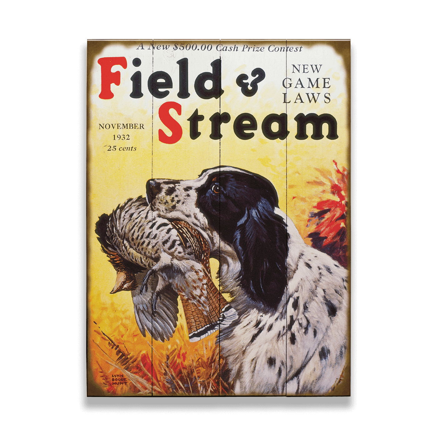 Honor the bond between hunter and companion with this Field and Stream cover from November 1932. Featuring a loyal bird dog holding a freshly retrieved game bird, this vintage illustration captures the pride and precision of a successful upland hunt. Set against a golden backdrop of autumn grasses, the artwork evokes both sporting tradition and the quiet loyalty of a trusted field partner—ideal for rustic decor, sporting lodges, or collectors of classic outdoor imagery.