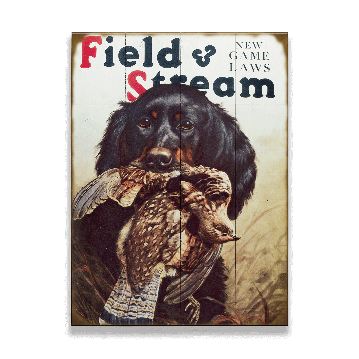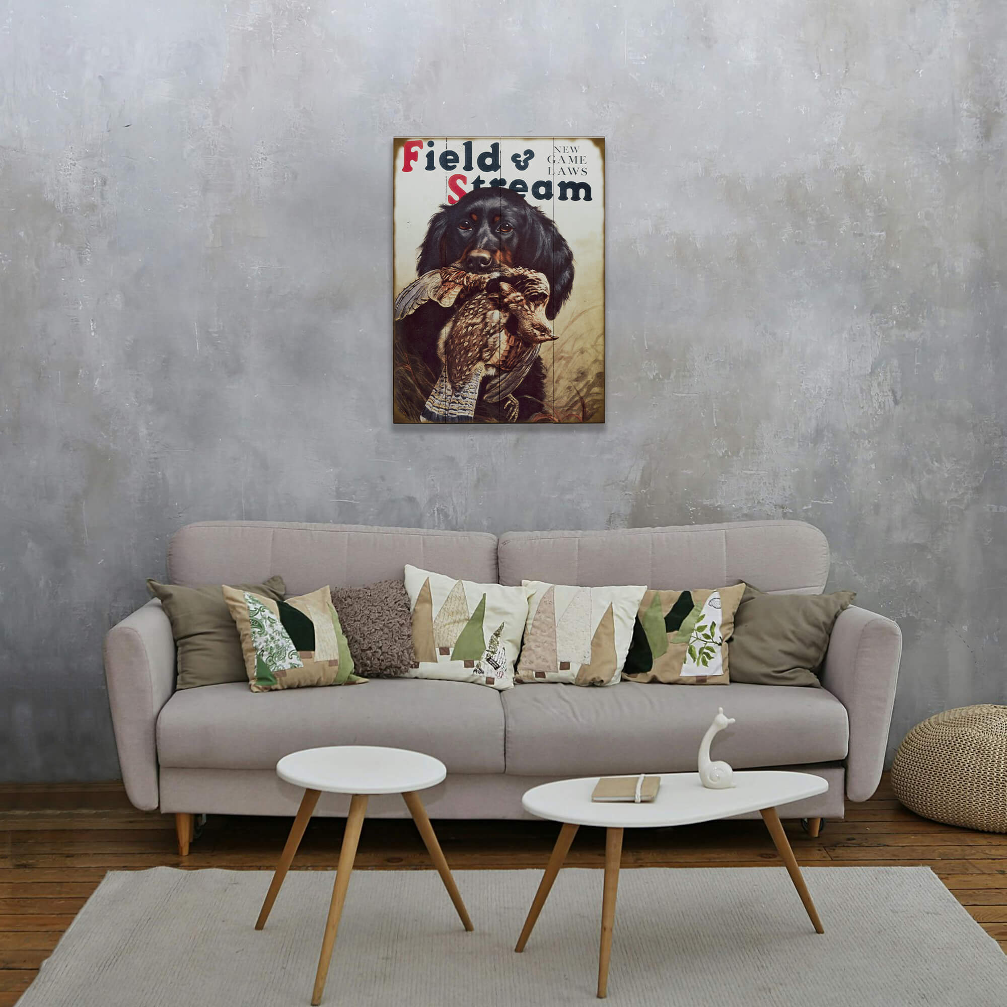 Honor the bond between hunter and dog with this Field and Stream cover from November 1934. A loyal spaniel gazes forward, gently holding a freshly retrieved game bird, eyes calm and steady with purpose. The rich detail and direct composition capture the quiet pride of a seasoned field companion—one that knows the rhythm of the upland hunt. Ideal for sporting lodges, bird hunting camps, or any space that celebrates tradition, teamwork, and the devotion of a good dog.