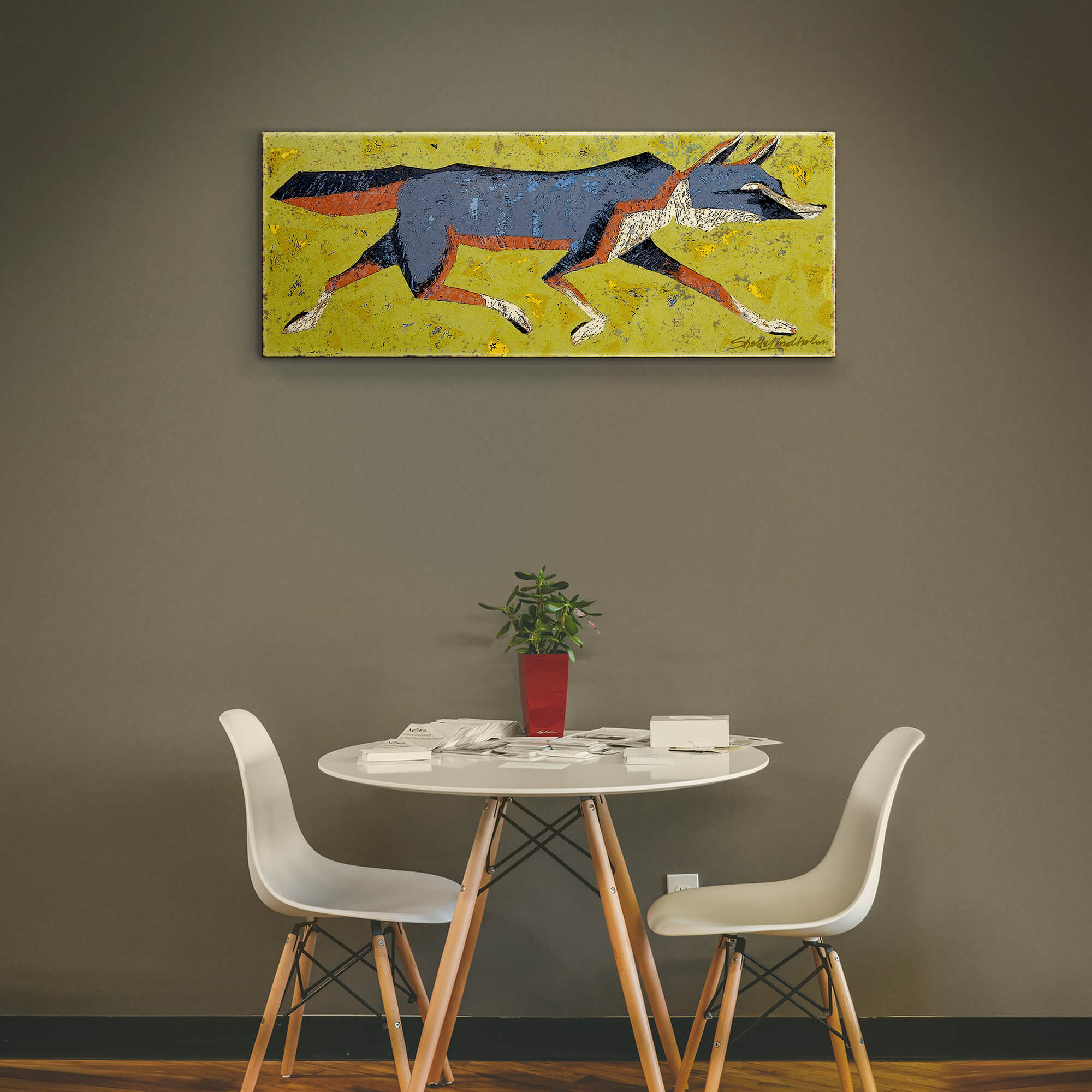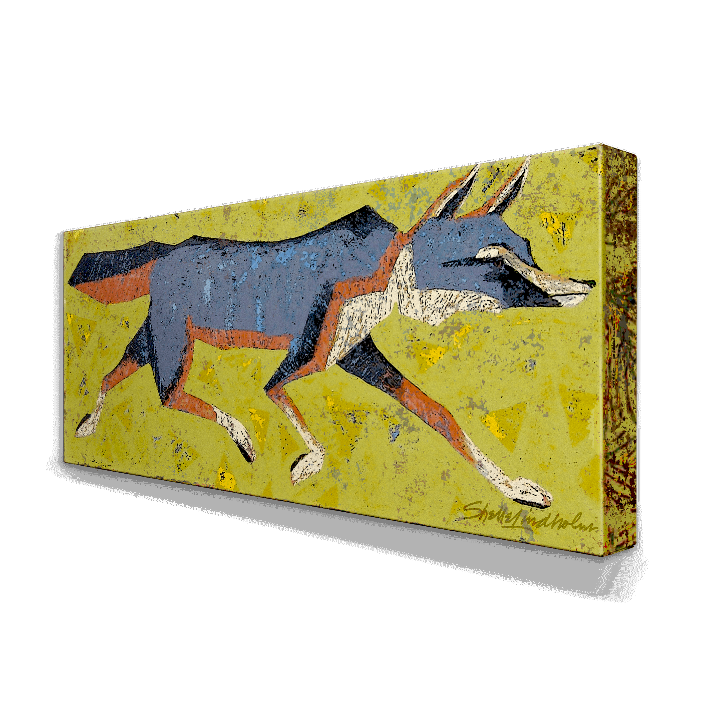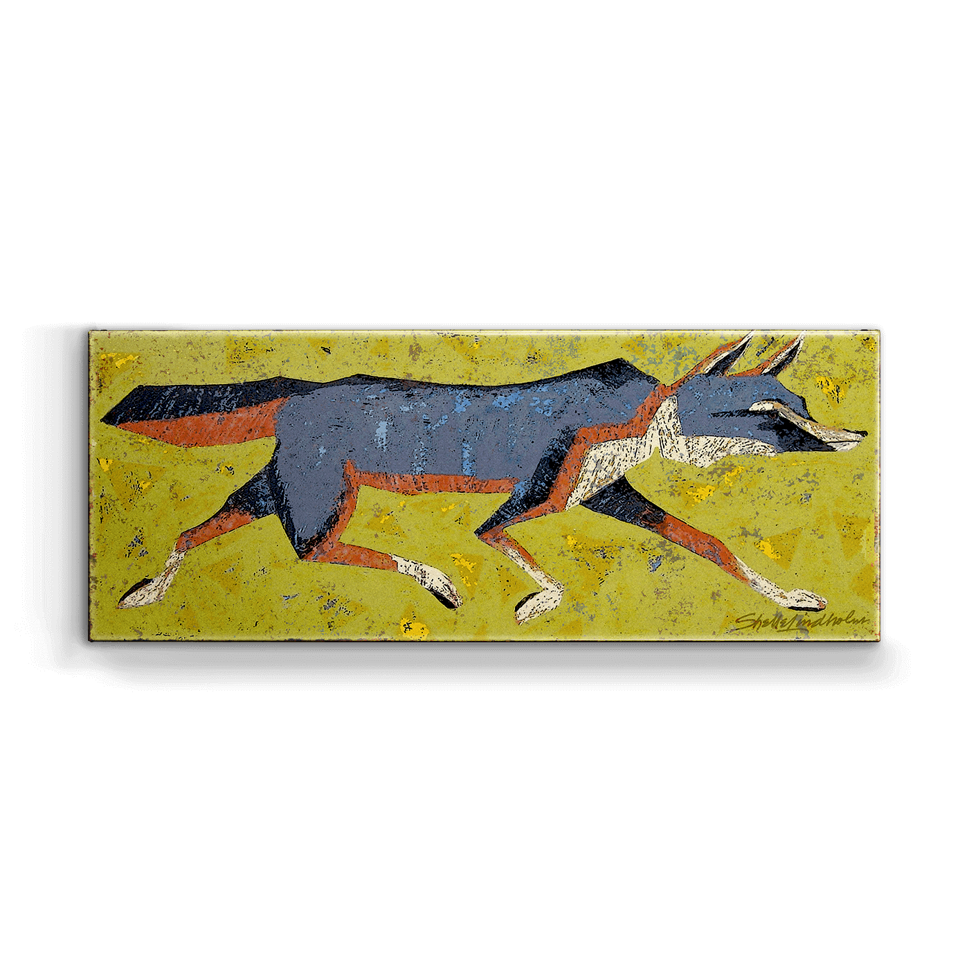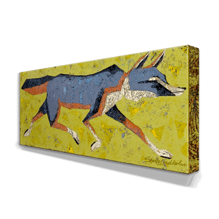 "Grey Fox" is a captivating artwork that portrays the graceful agility of a grey fox in motion, set against a vibrant yellow background sprinkled with abstract marks. The artwork's minimalist style, with sharp geometric shapes forming the fox's body, offers a modern take on animal portraiture. The cool grey tones of the fox contrast strikingly with the warm background, highlighting the animal's swift movement and elegant form. This piece is perfect for those who love wildlife depicted in a contemporary artistic style, making it an ideal choice for modern home decor or as a standout piece in an art collection.