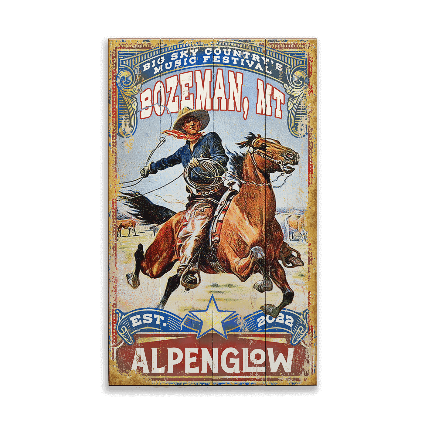 Bring home the spirit of the West with this special edition Alpenglow Festival sign, bursting with motion and Americana flair. A fearless cowboy charges forward, expertly wielding a lasso, capturing the energy and tradition that define Bozeman, Montana’s beloved celebration. Patriotic red, white, and blue accents frame the bold typography, while nostalgic scrollwork pays tribute to the festival’s roots. With its weathered finish and vintage rodeo style, this piece is a standout for collectors, music lovers, or anyone drawn to the bold character of Big Sky Country.