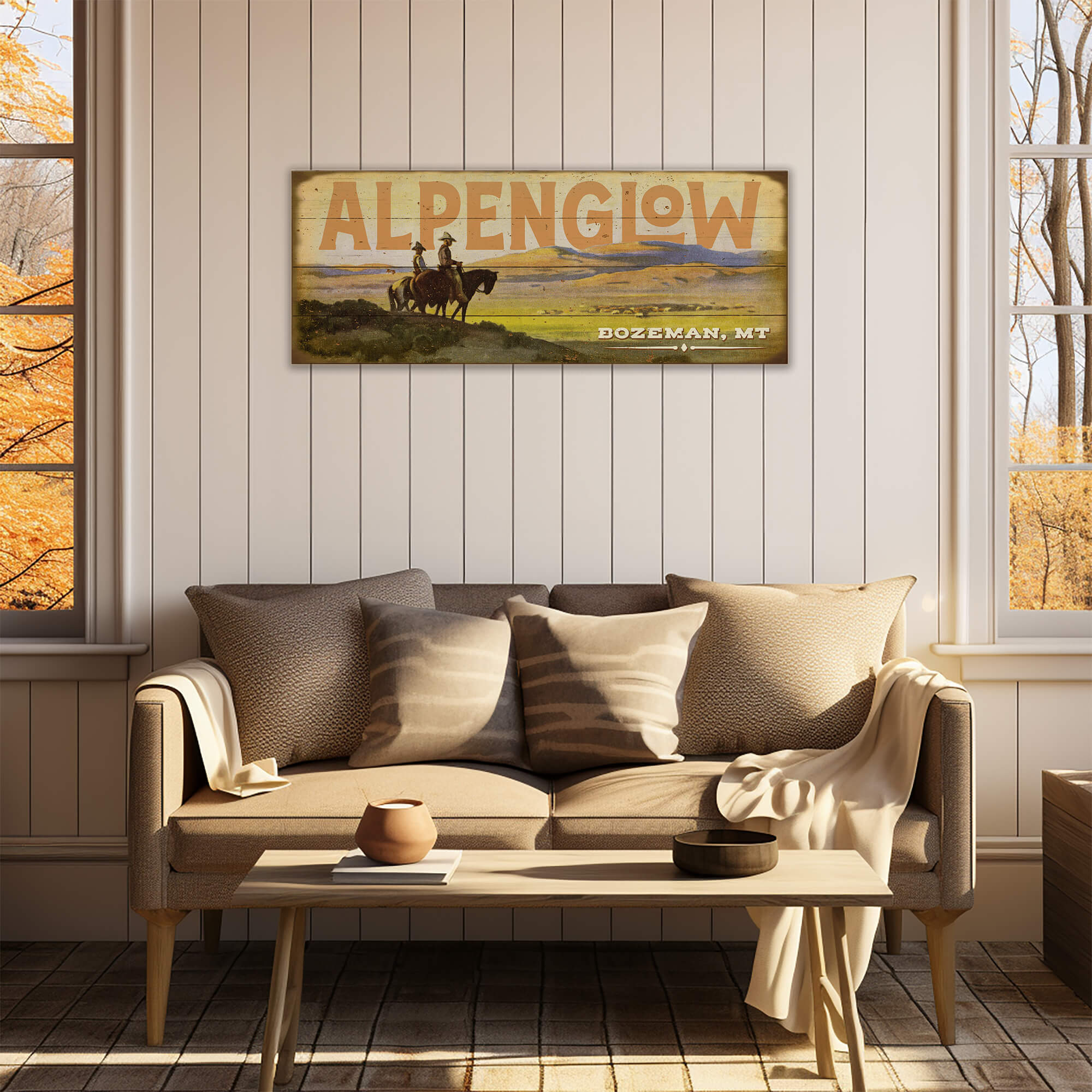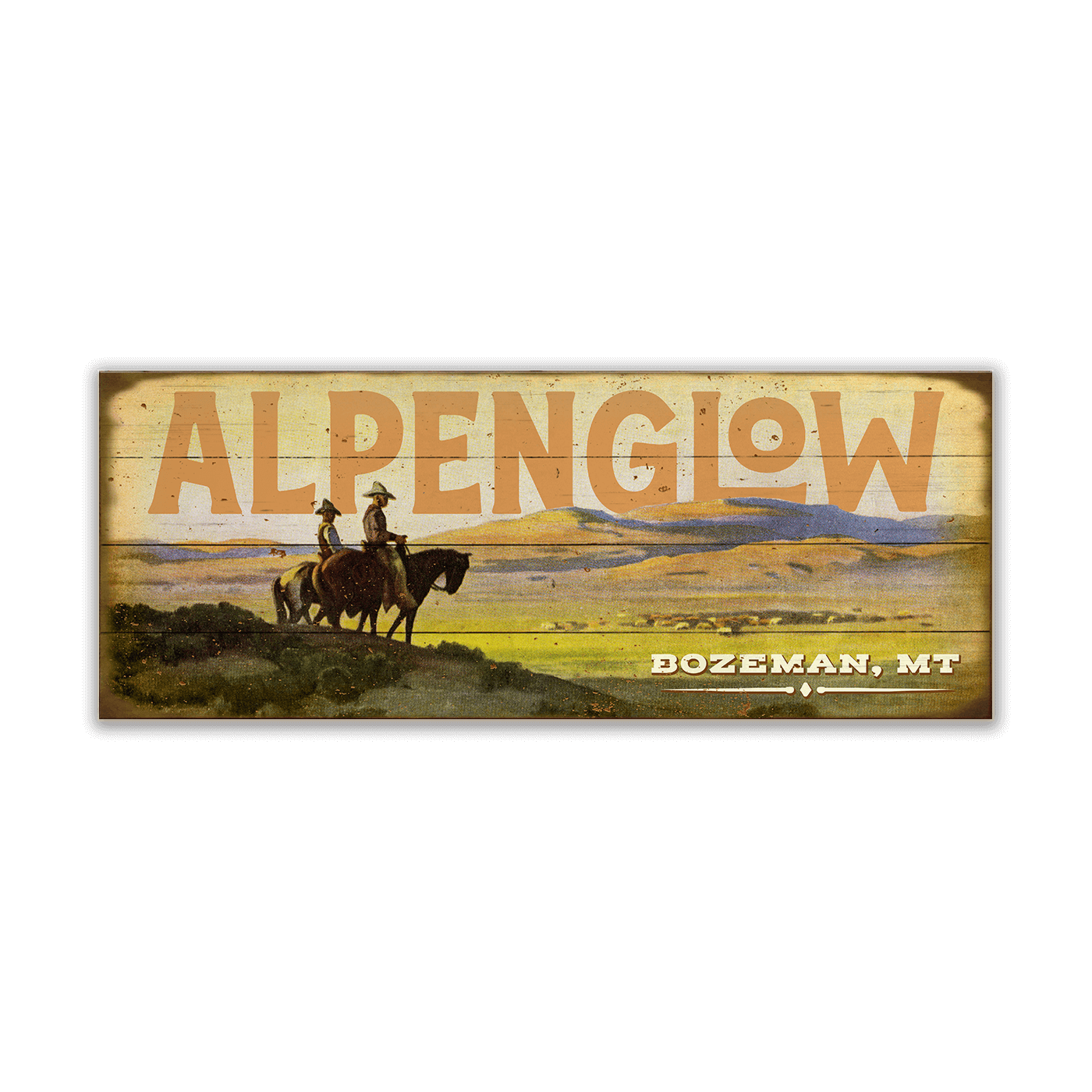 Capture the quiet majesty of the West with this nostalgic special edition Alpenglow Festival sign, featuring two riders on horseback overlooking a sunlit valley. The soft, golden tones and vintage-style lettering evoke the peaceful beauty of wide-open spaces and the timeless connection between land and tradition. With its classic composition and weathered finish, this piece is a warm tribute to frontier heritage and the enduring spirit of Big Sky Country. It’s a fitting accent for homes, cabins, or gathering spaces that celebrate Western landscapes and culture.