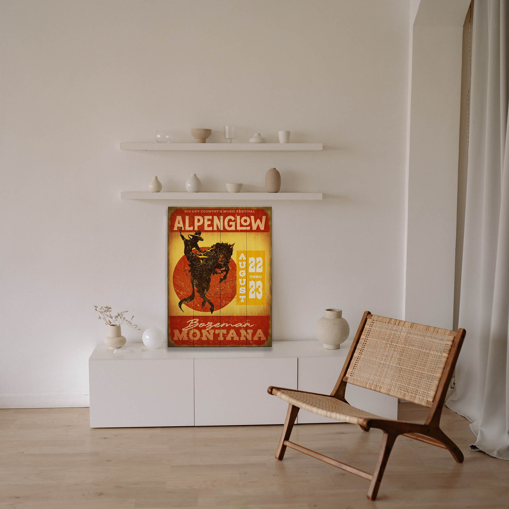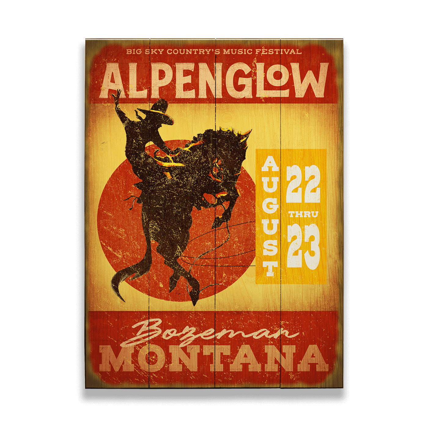 Embrace the bold energy of Big Sky Country with this special edition Alpenglow Festival sign, featuring a silhouette of a bronc rider against a blazing red sun. The bold typography and warm, weathered tones highlight the festival’s 2025 dates and its Montana roots. With a rugged aesthetic and timeless Western flair, this artwork captures the excitement of the festival’s signature mix of tradition and talent. Celebrating the grit, skill, and untamed energy of the American West, this piece is ideal for rustic decor, music lovers, or anyone who lives for the spirit of summer in the West.