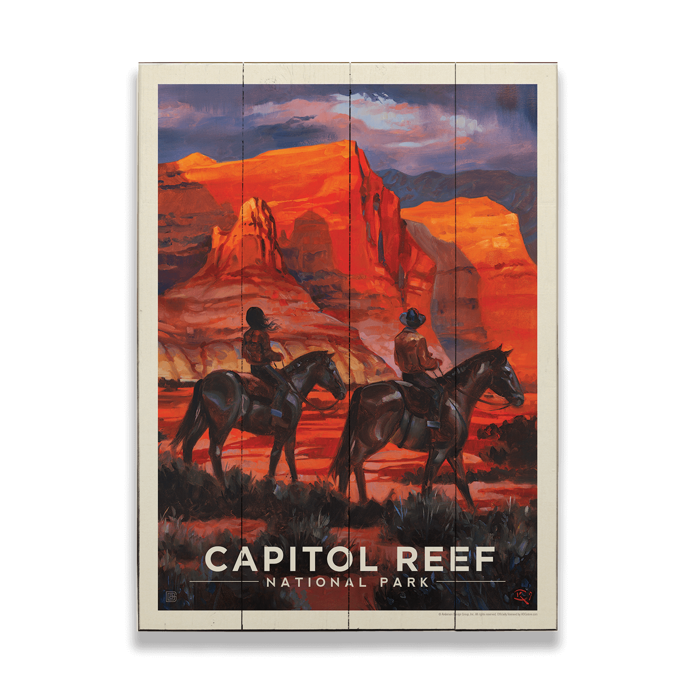 Ride into the heart of Utah’s red rock country with this vivid artwork of Capitol Reef National Park. Two horseback riders pause beneath towering cliffs, their silhouettes framed by the park’s fiery sandstone formations and dramatic desert sky. Known for its striking geological features, including the massive Waterpocket Fold, Capitol Reef offers a rugged landscape shaped by time and erosion. This piece captures the spirit of exploration and the timeless beauty of the American West, making it a bold tribute to one of the Southwest’s most awe-inspiring parks.