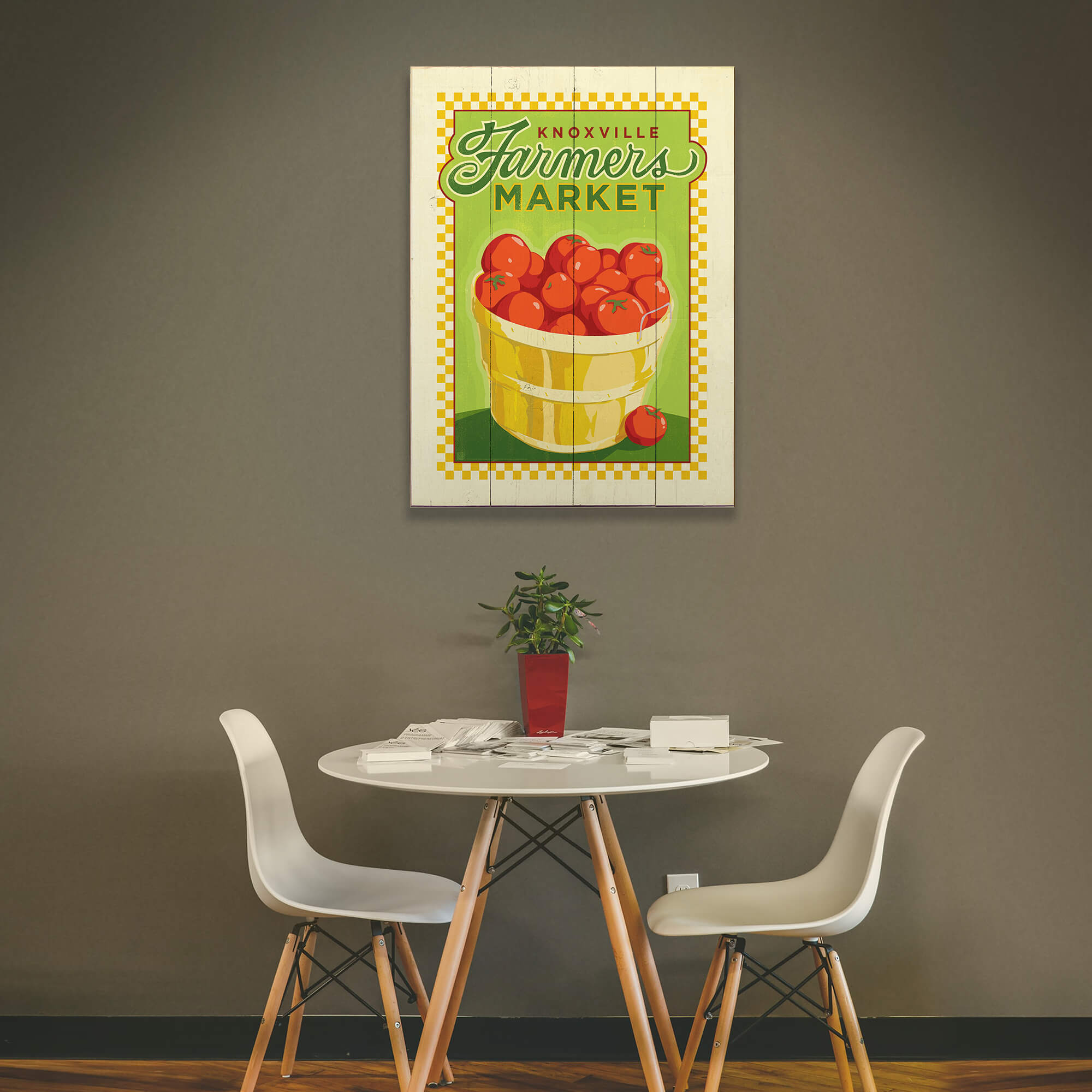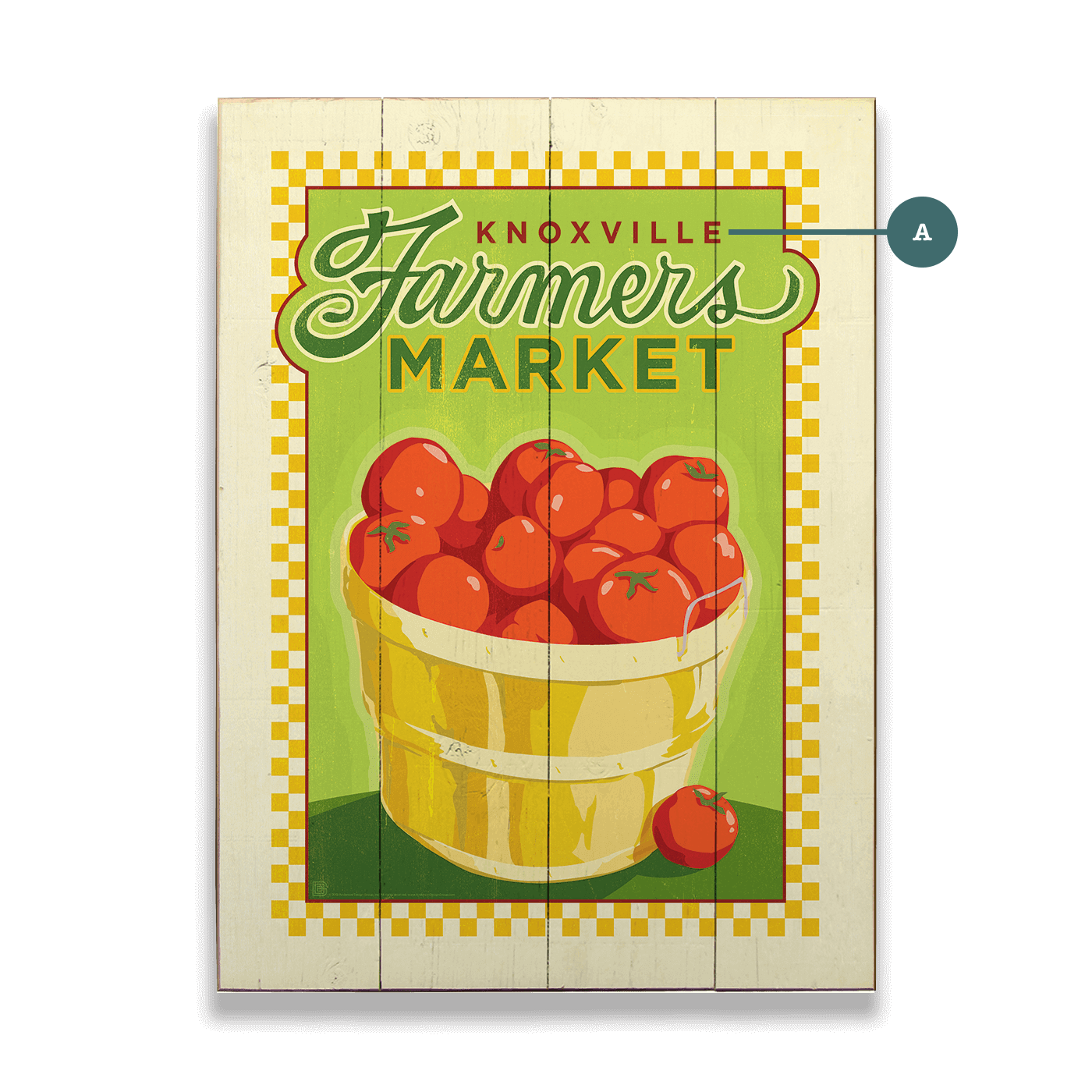 Savor the fresh, local flavor of the local Farmers Market with this delightful artwork, ripe with the charm of Southern hospitality. A bushel of juicy tomatoes takes center stage, symbolizing the bounty of quality produce available. This vintage-style design, with its vibrant colors and rustic checkered border, captures the essence of community and the joys of farm-to-table shopping.