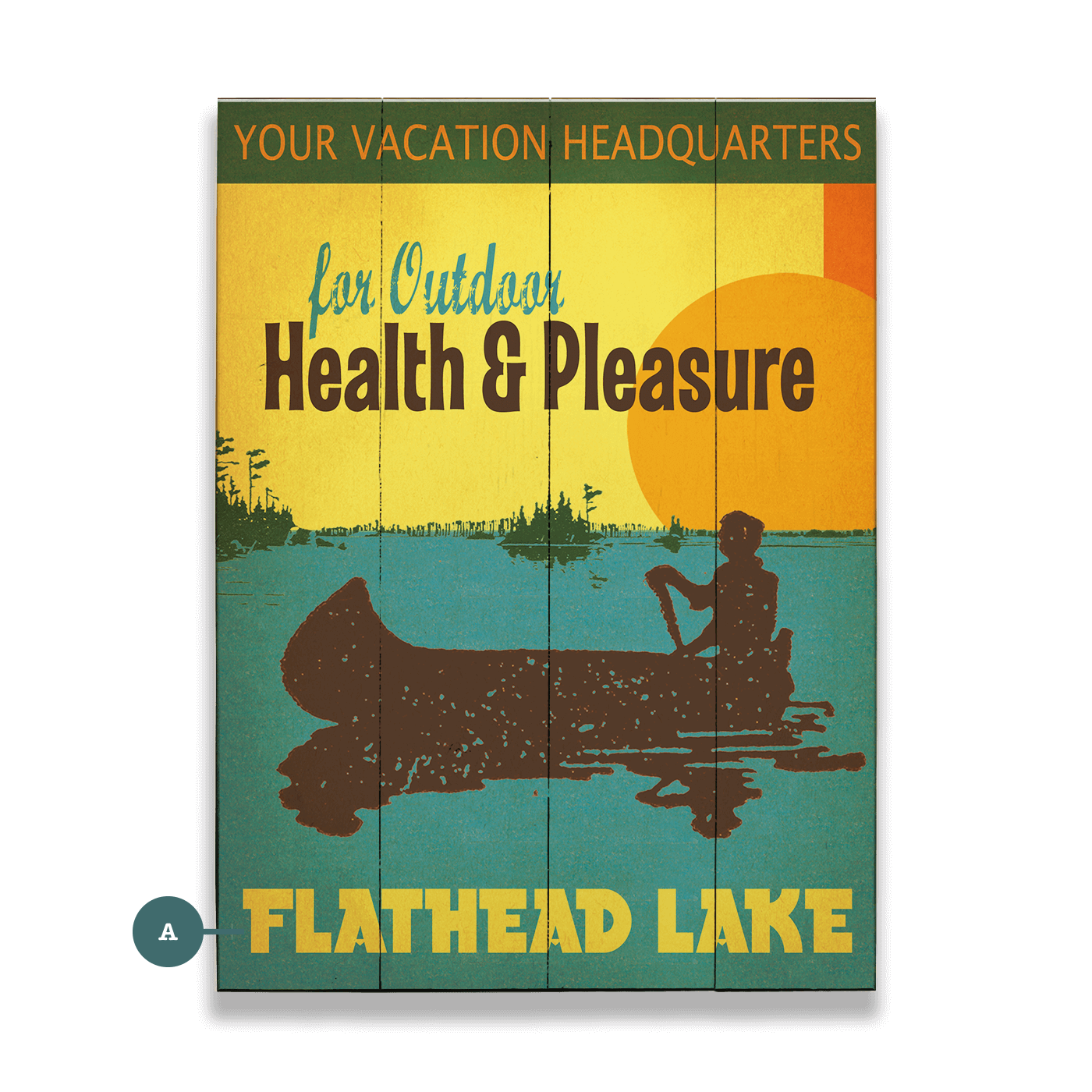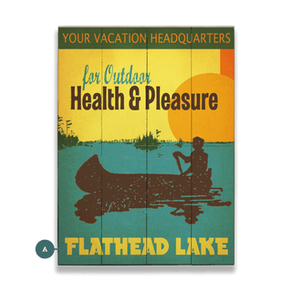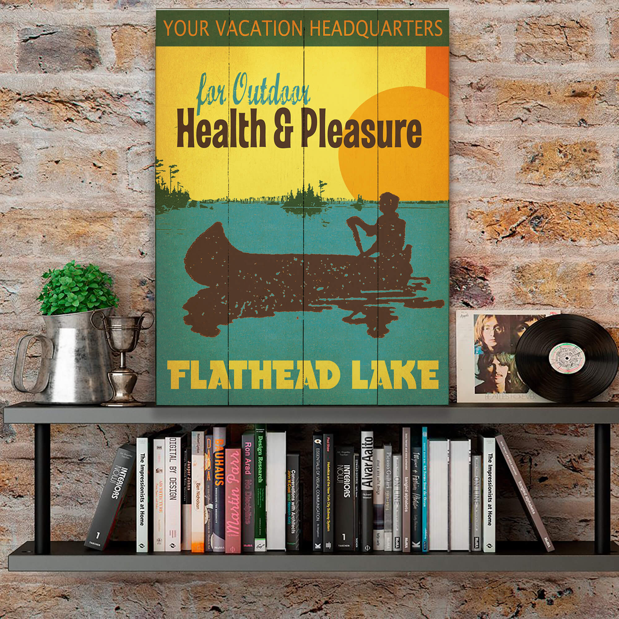 Embrace the spirit of adventure with this vintage print, promoting the joys of outdoor activities for health and pleasure. The artwork features a captivating sunset scene with silhouettes of trees and a figure leisurely floating in water, encapsulating the essence of relaxation and natural beauty. This piece is perfect for anyone who appreciates the call of the outdoors and the promise of rejuvenation amidst nature.