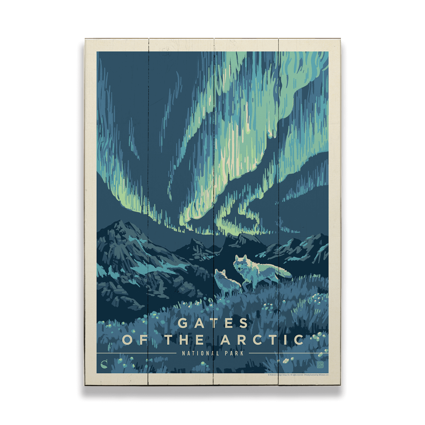 Witness nature’s most ethereal display with this stunning artwork of Gates of the Arctic National Park. Two arctic wolves stand beneath a sky alive with the Northern Lights, their forms illuminated by waves of shimmering green and blue. Set in one of the most remote wilderness areas in the U.S., the park is a haven for wildlife and a canvas for the Arctic’s celestial wonders. With no roads or marked trails, it offers pure solitude and unfiltered connection to the rhythms of the land and sky. This piece captures the quiet drama and raw beauty of life beyond the Arctic Circle.