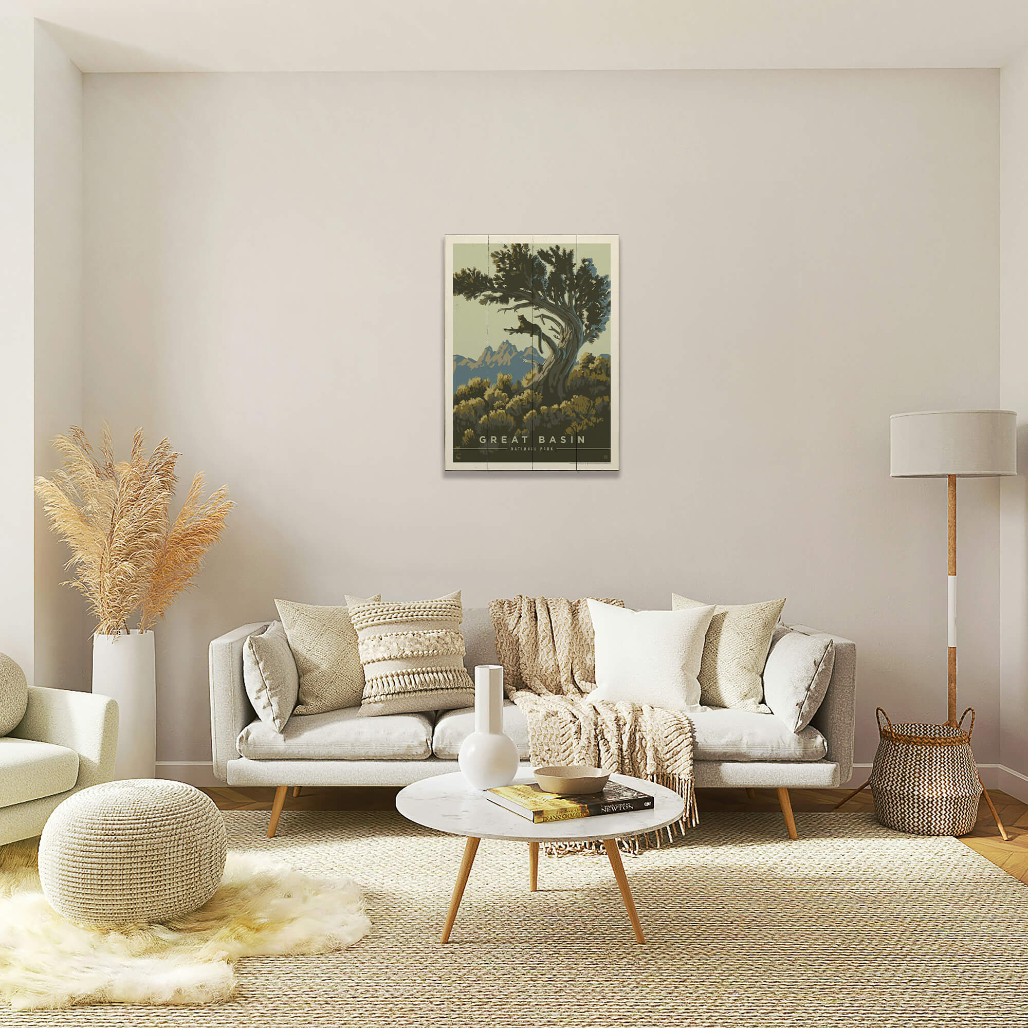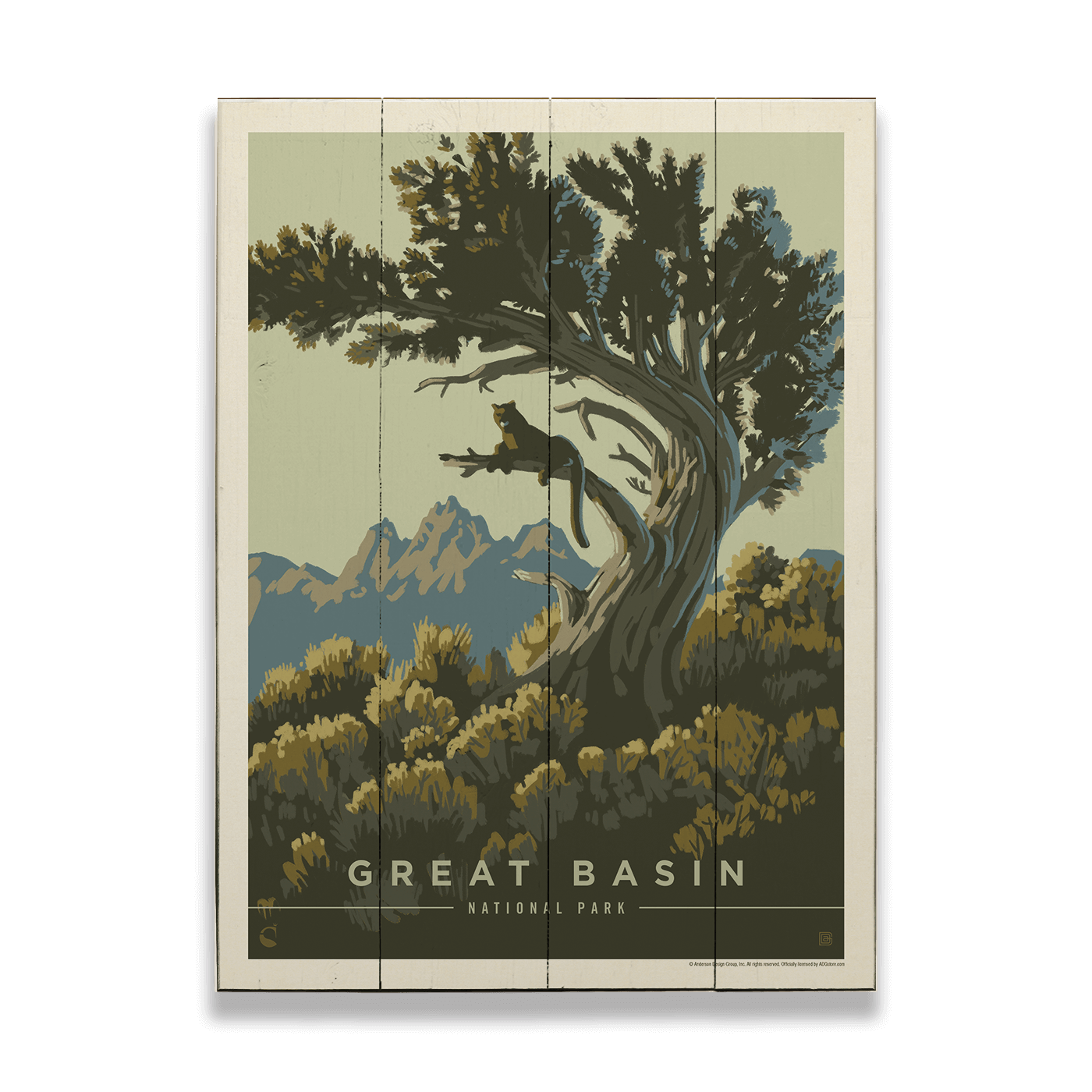 Celebrate the solitude and wild beauty of the high desert with this captivating artwork of Great Basin National Park. A mountain lion rests in the twisted limbs of an ancient juniper, overlooking rugged peaks and sagebrush-studded hills. Tucked away in eastern Nevada, the park is home to bristlecone pines—some of the oldest living trees on Earth—along with caves, alpine lakes, and star-filled skies. This piece captures the park’s quiet drama and rich biodiversity, where desert and mountain meet in striking harmony.