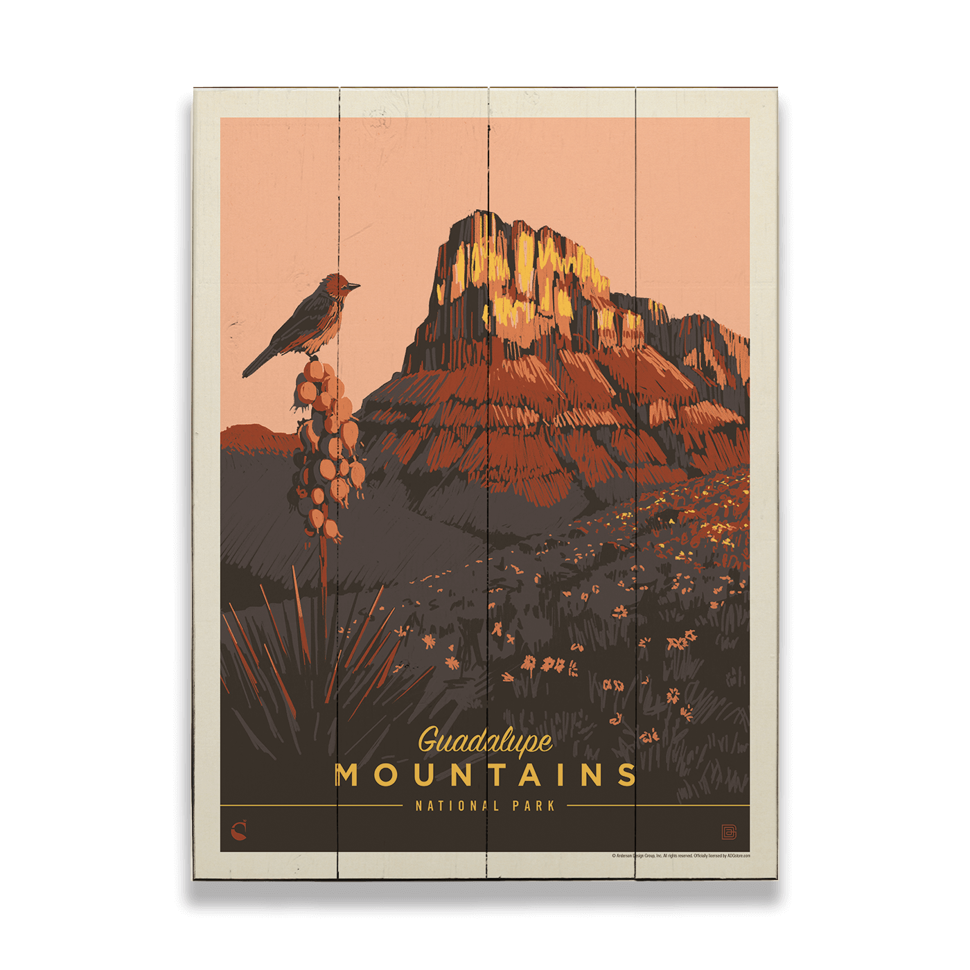 Celebrate the rugged splendor of West Texas with this warm-toned artwork of Guadalupe Mountains National Park. A lone bird perches on a blooming yucca, overlooking a shadowed desert floor that leads to the dramatic cliffs of El Capitan—one of the park’s most iconic landmarks. Known for its striking geology and some of the highest peaks in Texas, the park offers a stunning mix of desert, canyon, and forest landscapes. This piece captures the quiet resilience and beauty of the Chihuahuan Desert, where wildlife, wildflowers, and stone all share the spotlight.