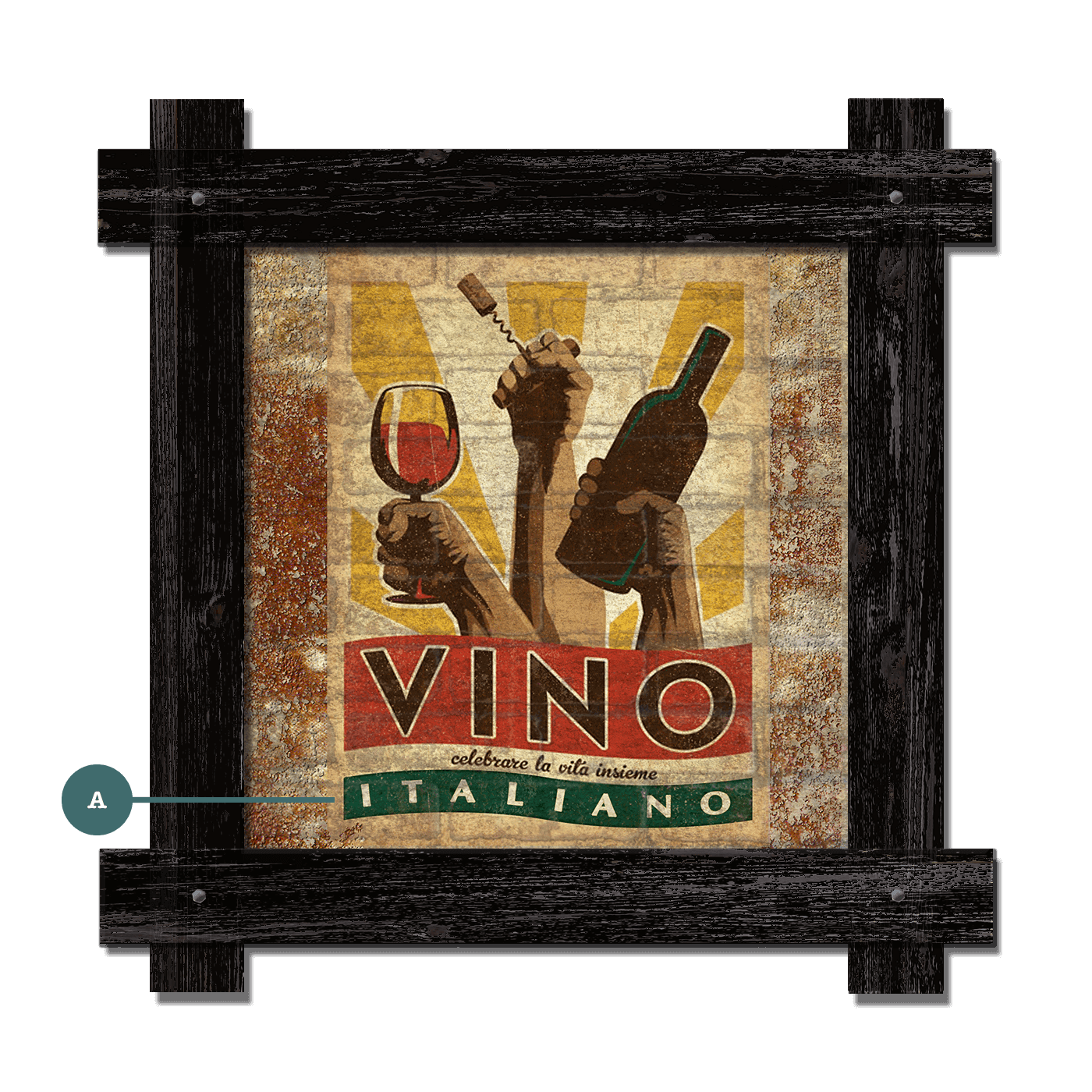 The artwork is encased in a robust black frame, reminiscent of reclaimed wood, which adds depth and character to the piece. The background boasts a textured brick-like design, giving the impression of an old-world wine cellar.
