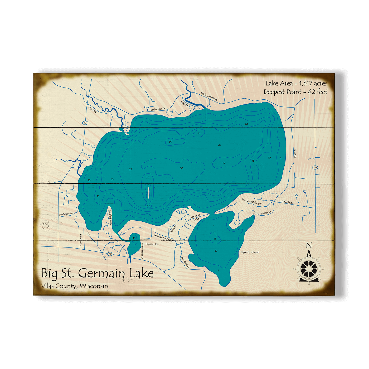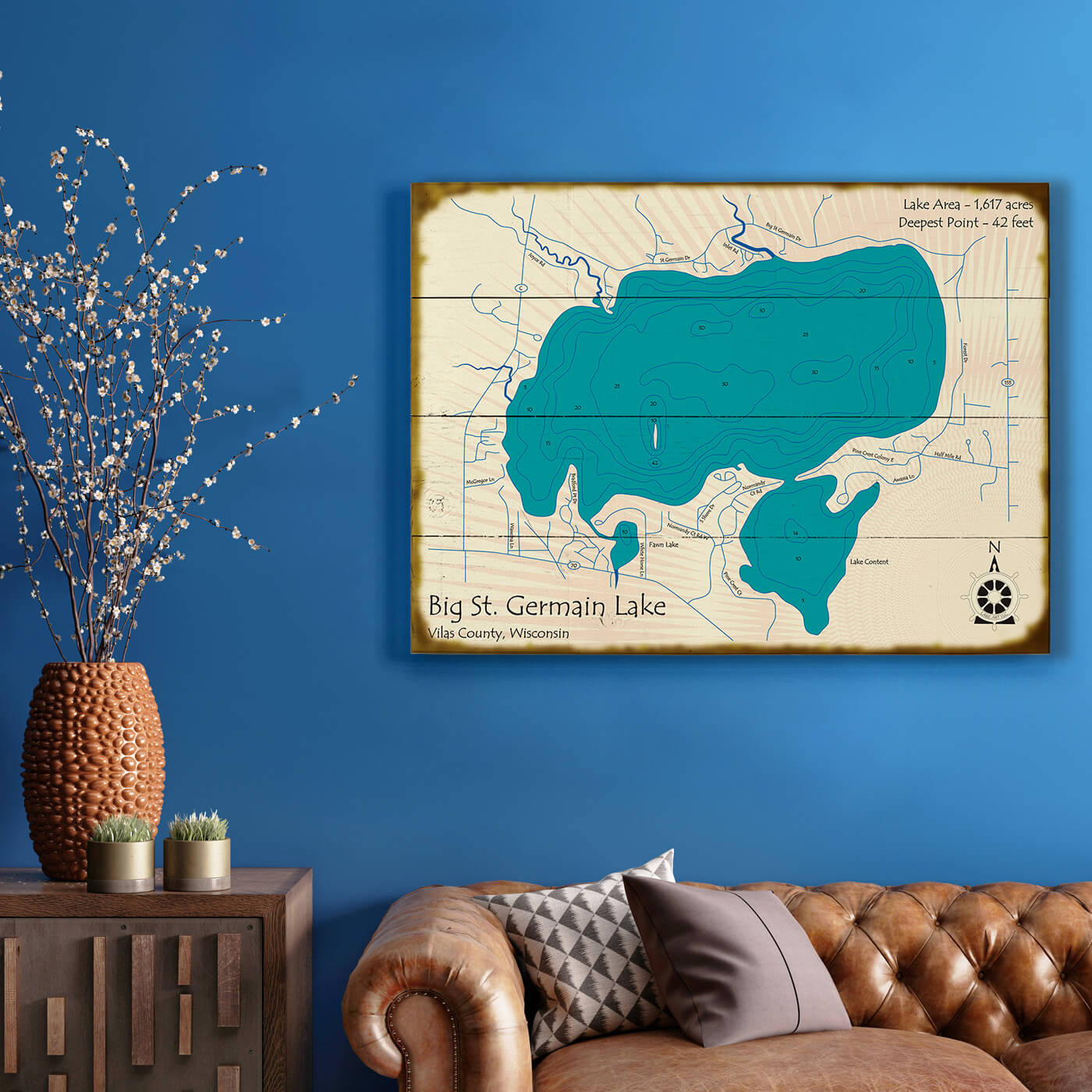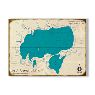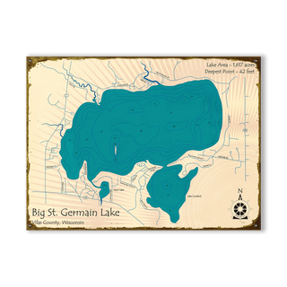 Introducing our stunning vintage map of Big St Germain Lake, Wisconsin - a fisherman's paradise and a top-rated destination for anglers in Wisconsin. Our map showcases the lake's 1,617 acres of crystal clear water, dotted with various species of fish, including musky, walleye, and bass. With its vibrant aqua blue color and vintage-style distressing, our map is a beautiful addition to any lake house, cabin, or home decor.