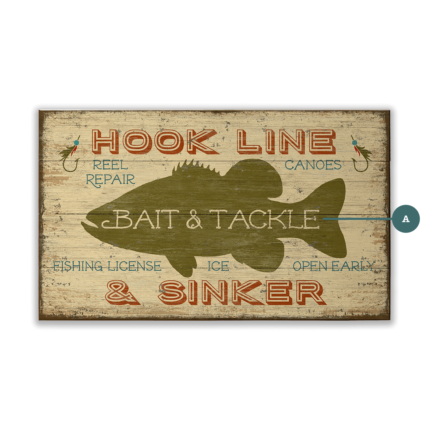 Reel in rustic charm with this vintage-style bait and tackle sign, featuring bold lettering, a classic fish silhouette, and fishing fly accents. Retro lettering highlights the essential services of reel repair, fishing licenses, and canoe rentals, giving it the feel of an old roadside shop that’s been serving anglers for generations. Ideal for cabins, lodges, garages, or any space that celebrates the laid-back rhythm of fishing life and the joy of a well-stocked tackle box.