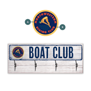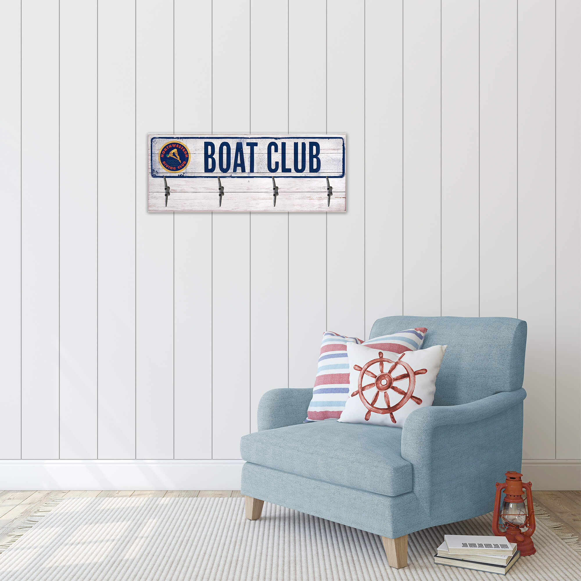 Elevate your nautical decor with this striking Boat Club coat rack, designed for those who embrace life on the water. Featuring a weathered, maritime-inspired design, this piece blends vintage charm with practical functionality. The distressed whitewashed wood background enhances the bold navy lettering, creating a classic coastal aesthetic. Four sturdy cleat-style hooks offer convenient storage for keys, hats, or boating essentials. With a customizable emblem, this sign can be tailored to reflect your personal connection to the water—whether it's sailing, diving, or simply enjoying the breeze on deck. Perfect for a lake house, beach retreat, or any space that calls for a bit of nautical nostalgia, this piece is a must-have for boating enthusiasts and seaside adventurers alike.