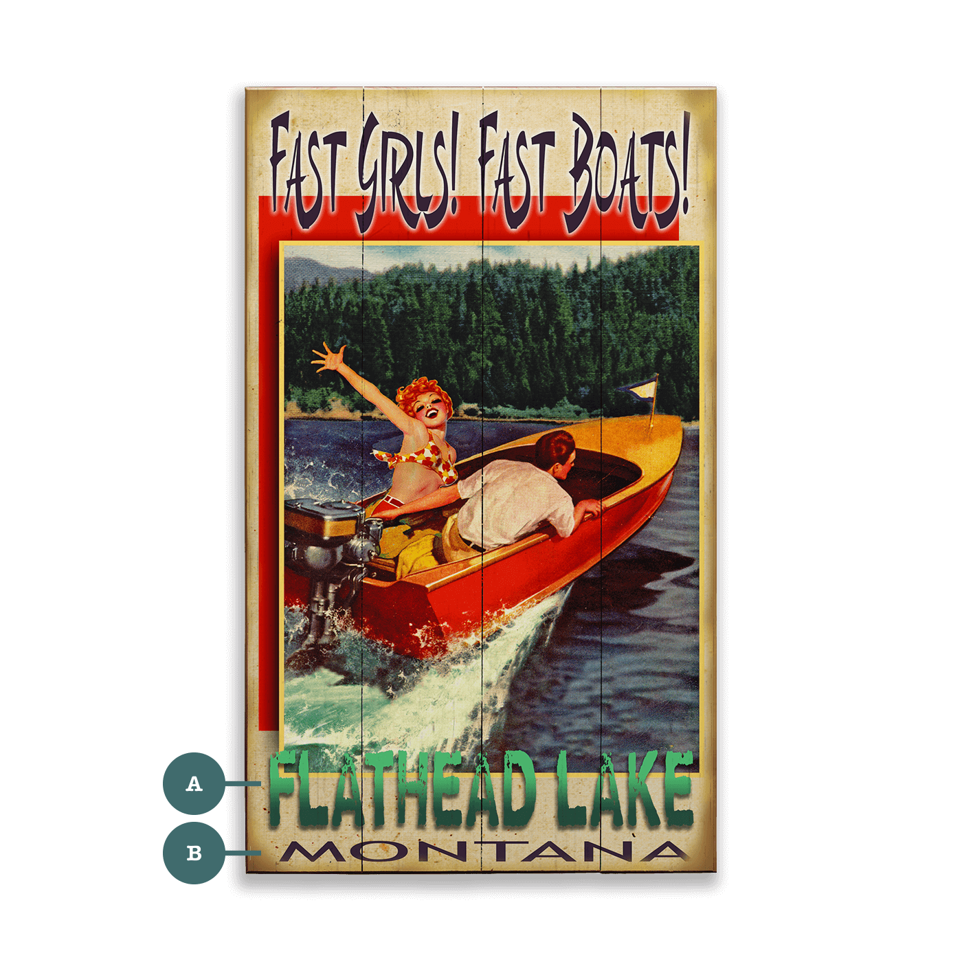 Buckle up for a blast of retro summer fun with this cheeky lakeside sign, featuring a redhead in a patterned swimsuit throwing her arms up in delight as she zips across the water in a vintage wooden speedboat. With bold lettering that reads “Fast Girls! Fast Boats!” and a backdrop of deep green pines and crisp blue waves, this piece channels the freewheeling spirit of classic American summers. Great for lake houses, boat garages, bars, or vacation rentals near the water, this nostalgic design brings a playful, pinup-inspired energy to any space.
