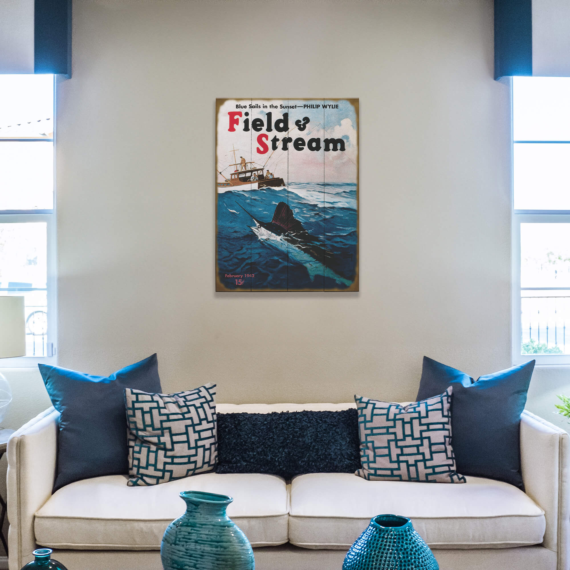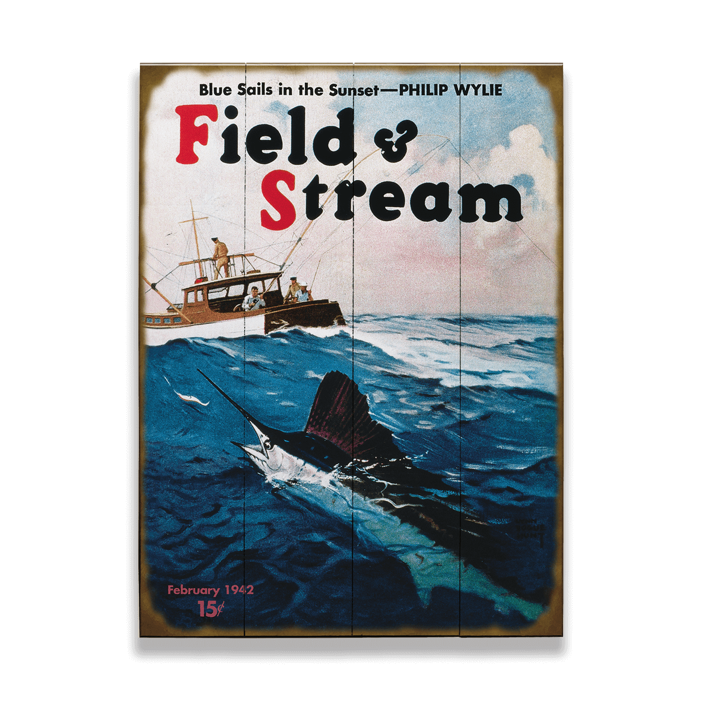 Ride the swells of open water with this Field and Stream cover from February 1942. A sailfish surges beneath the surface, its dorsal fin slicing through the blue as a sportfisher in the background holds fast to the line. The action unfolds against a vast horizon, capturing the raw power and exhilaration of offshore fishing. Ideal for coastal homes, sportfishing lodges, or any angler’s retreat, this piece brings big-game adventure to walls that celebrate salt, speed, and the stories born at sea.