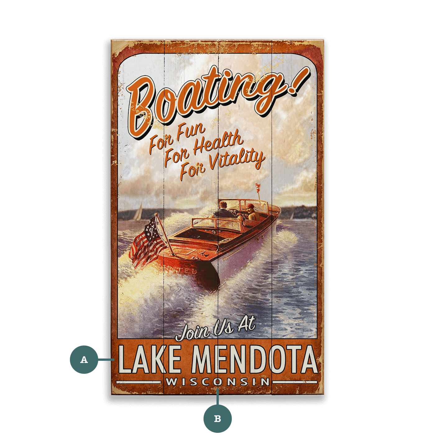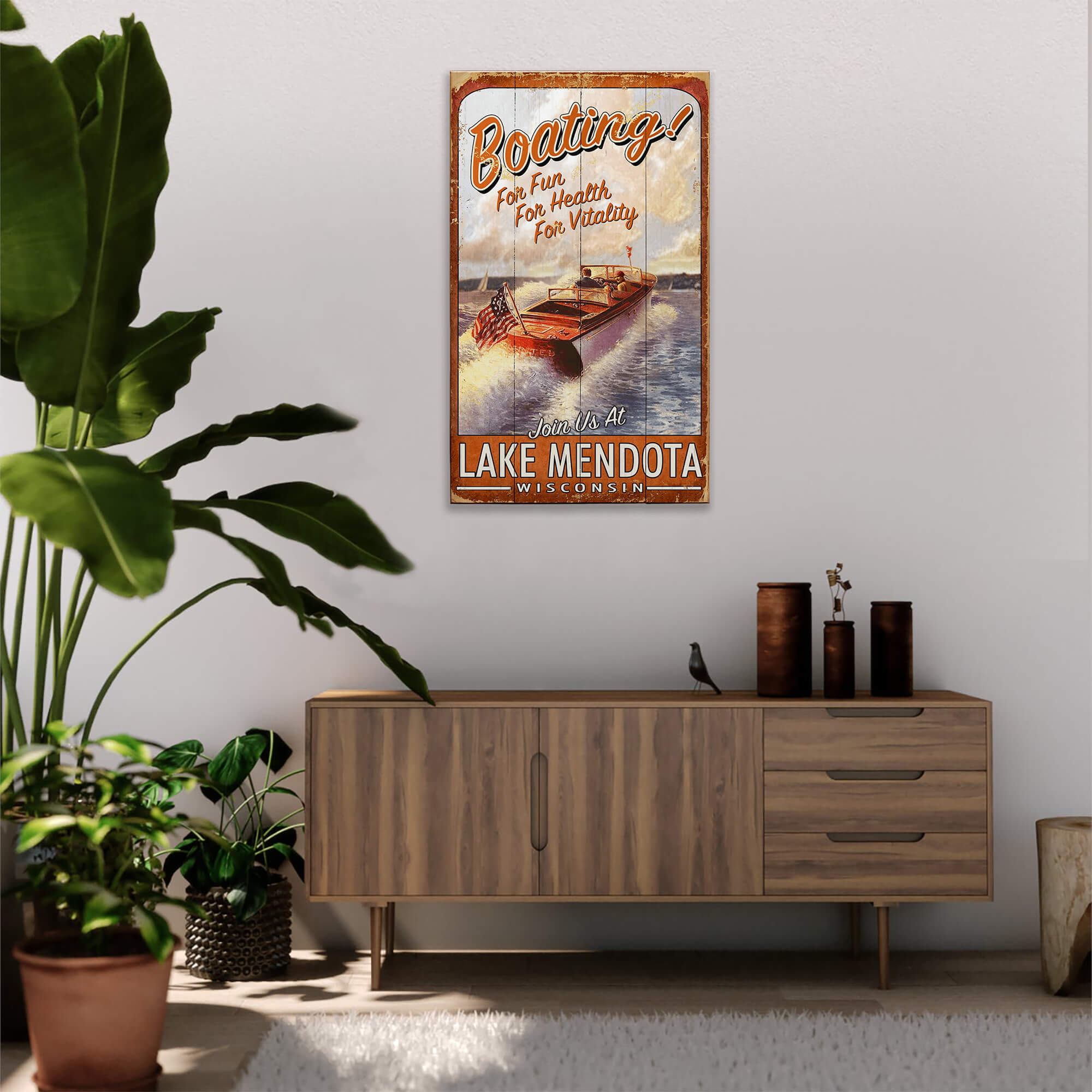 This artwork captures the carefree spirit of classic American boating, featuring a wooden runabout cutting across open water in a warm, nostalgic travel-poster style. Inspired by the timeless appeal of summer days on Lake Mendota, the scene celebrates recreation, relaxation, and life on the water. The location text at the bottom can be customized, making it a perfect fit for commemorating a favorite lake, shoreline town, or boating destination. Ideal for lake homes, cabins, or anyone drawn to classic waterfront nostalgia.