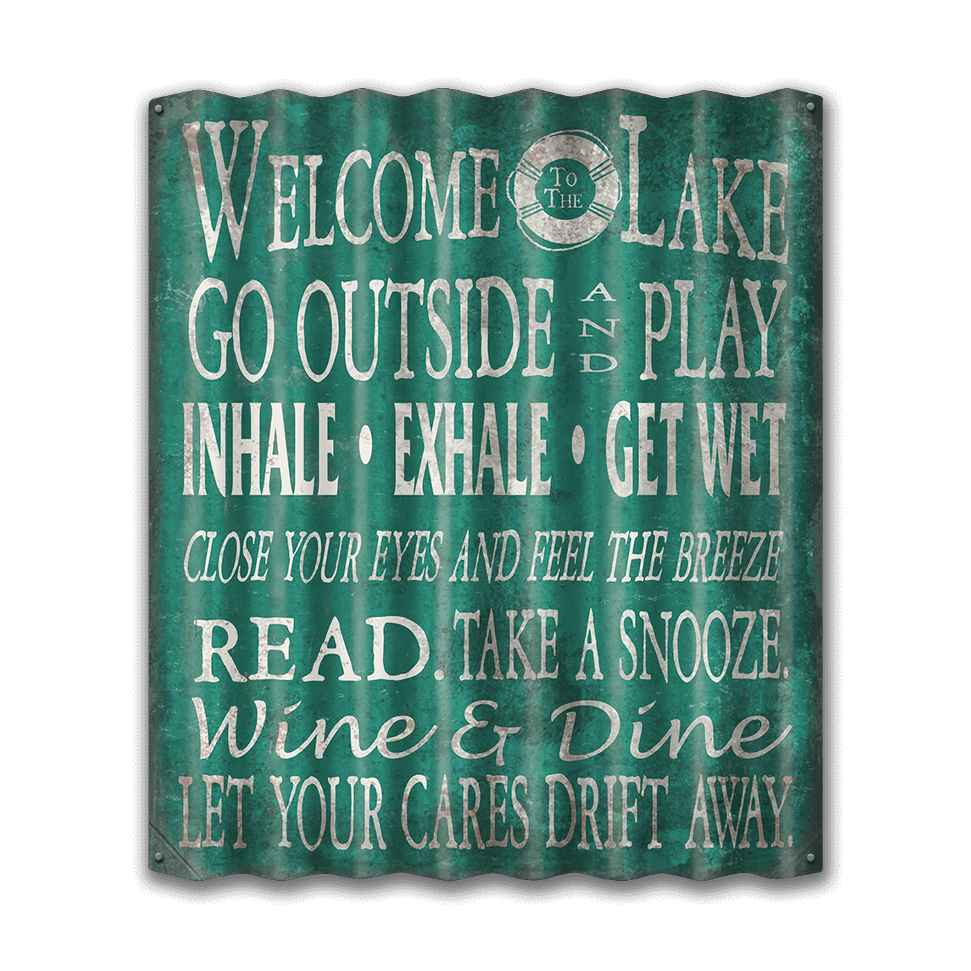 Capture the essence of lakeside living with this beautifully weathered sign, designed to bring a rustic yet inviting charm to any space. Featuring an eye-catching distressed sea-green background and bold white lettering, this piece encourages a carefree, relaxed lifestyle filled with fresh air, adventure, and serenity. The textured, corrugated surface enhances its vintage appeal, making it a perfect addition to cabins, lake houses, or outdoor retreats. Whether displayed on a porch, dock, or indoors as a reminder of tranquil getaways, this sign evokes the joy of unwinding by the water—where worries fade, laughter flows, and every moment feels a little lighter.