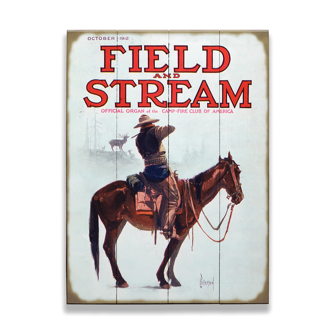 Soak in the stillness of the backcountry with this Field and Stream cover from October 1912. A lone rider pauses atop his horse, rifle raised to target an elk spotted through the morning mist. The soft haze, quiet tension, and timeless silhouette capture the moment when patience meets promise on the trail. A classic tribute to Western wilderness, long rides, and the watchful eyes that know how to find game amidst the fog, this artwork brings a touch of outdoor calm and focus to any space.