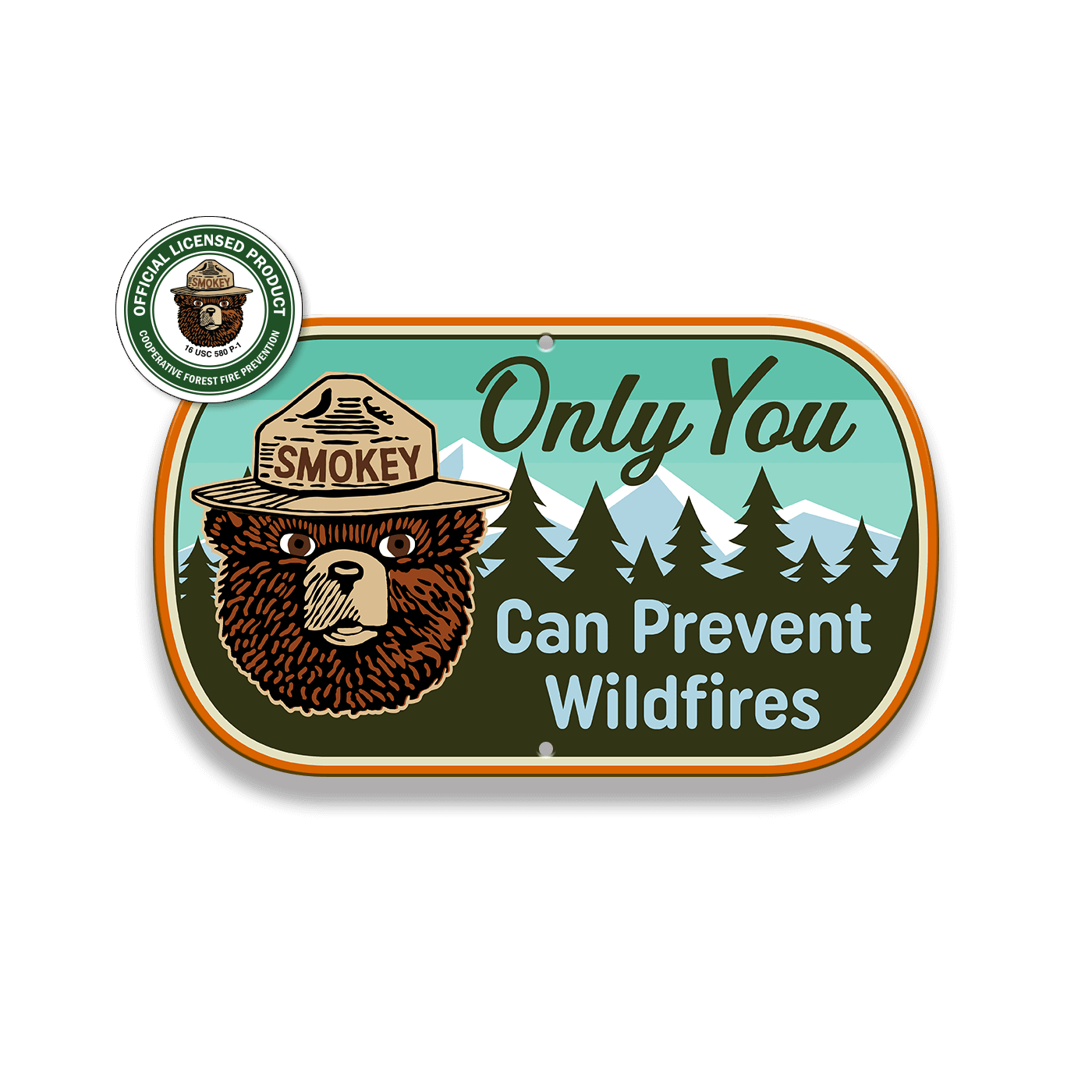 Bring Smokey Bear’s enduring message to life with this forest-themed sign. Featuring Smokey’s classic portrait framed by tall evergreens and distant mountains, the design reminds everyone that only you can prevent wildfires. Simple and direct, this piece reinforces a message that never goes out of style. A great addition to park offices, visitor centers, fire stations, or any space dedicated to wildfire prevention.