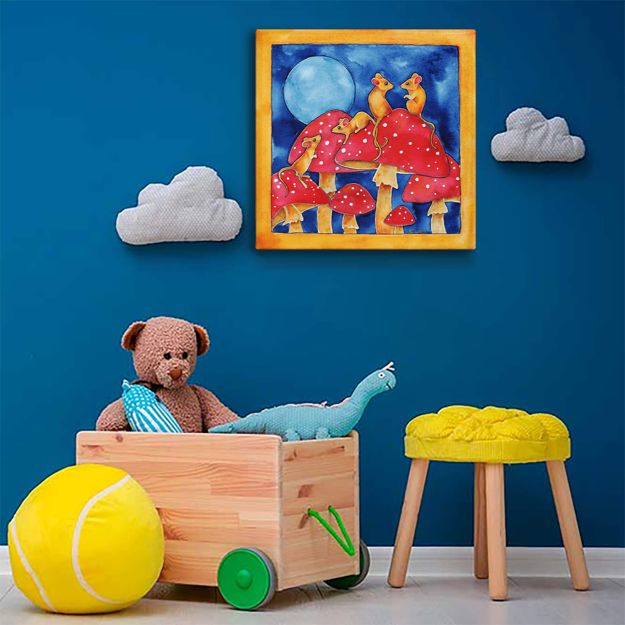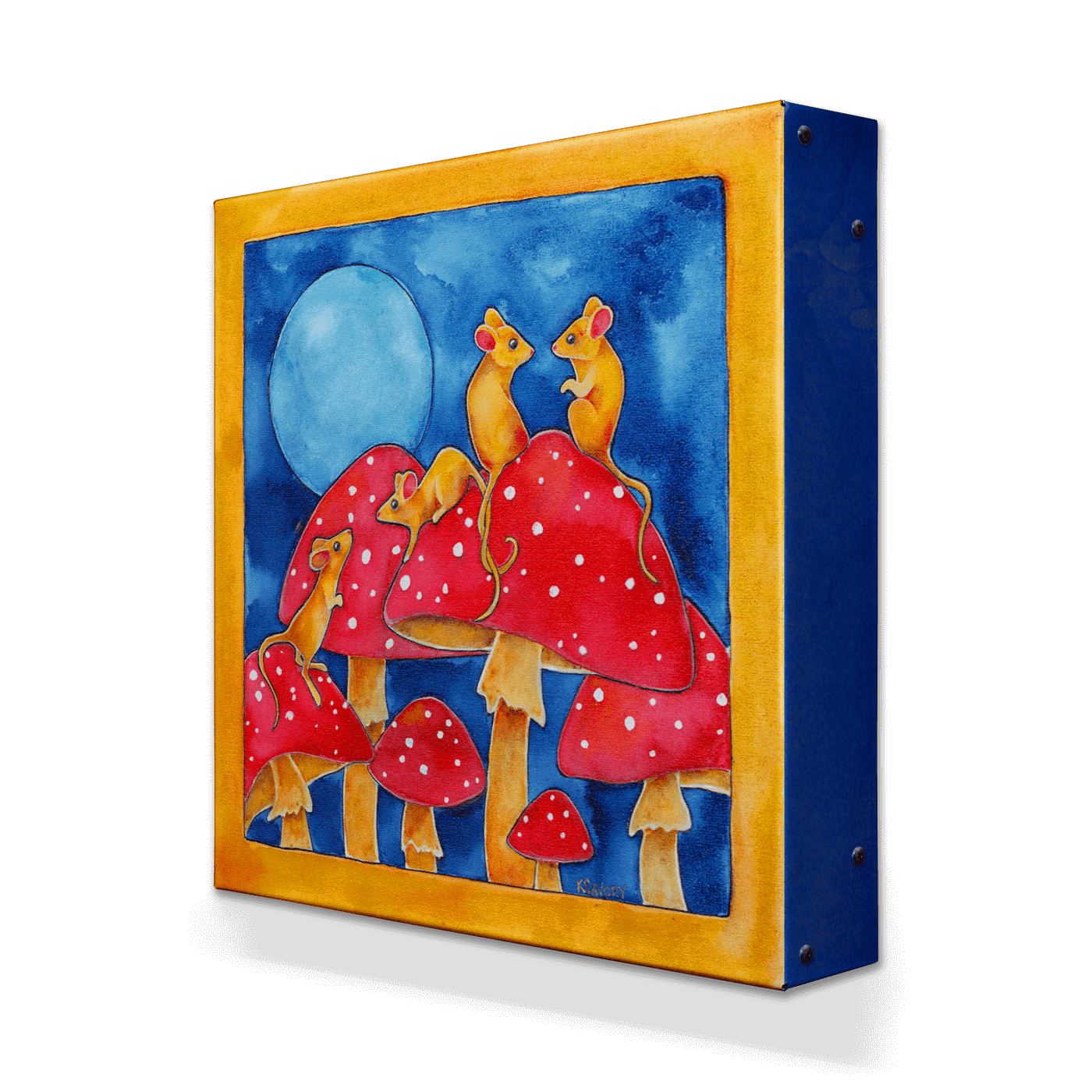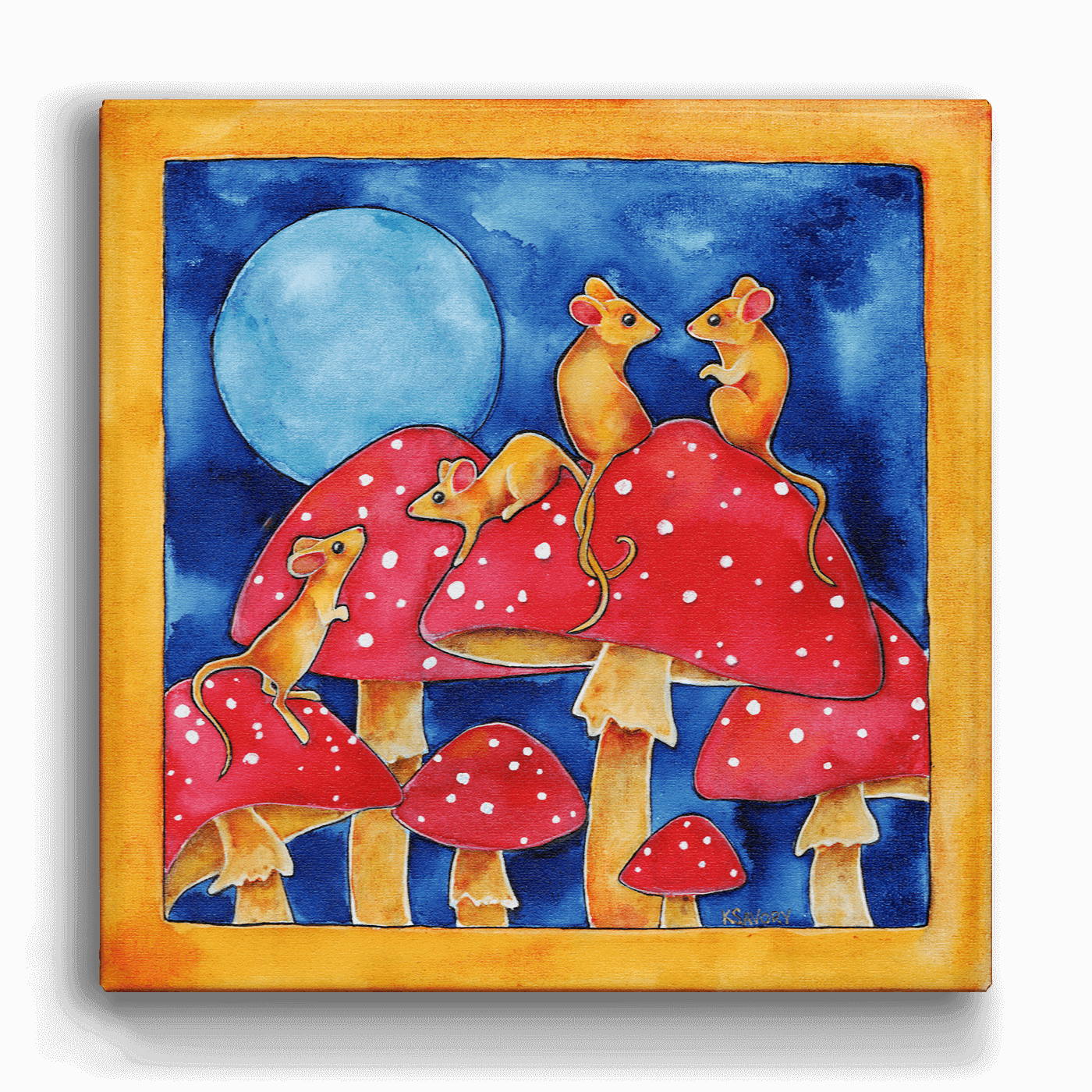 "Double Date" is a captivating artwork that showcases four mice on an adventurous outing atop striking red mushrooms under a glowing full moon. This charming piece, with its vivid colors and delightful details, offers a perfect blend of whimsy and enchantment. Ideal for those who appreciate imaginative themes, this painting adds a playful and cheerful touch to any space, inviting viewers to explore a world brimming with curiosity and joy.