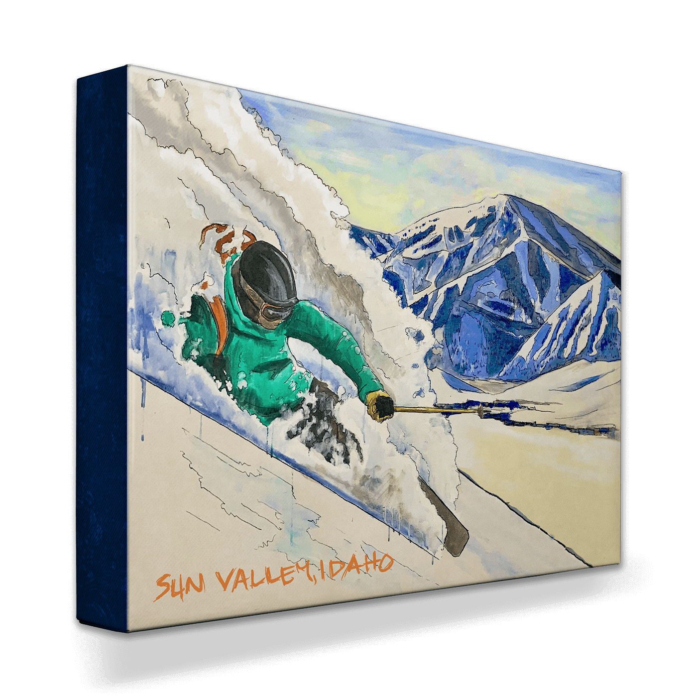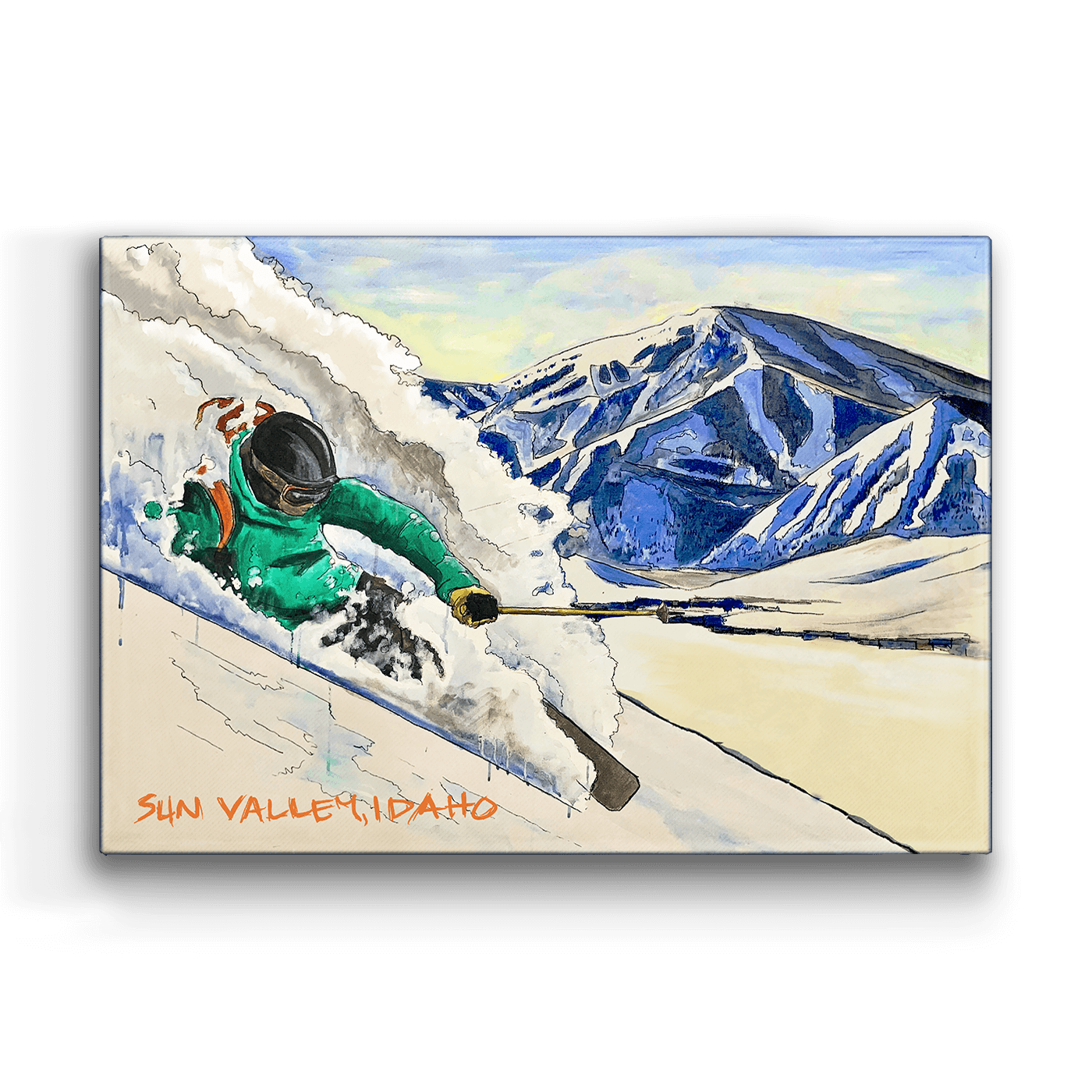 Experience the rush of carving down Bald Mountain in Sun Valley, Idaho, with this vivid depiction of a skier cutting through fresh powder. The bold color and energetic brushwork capture the thrill and freedom of a perfect downhill run. A dynamic homage to one of the West’s most legendary ski mountains, it’s ideal for anyone who lives for adventure on the slopes.