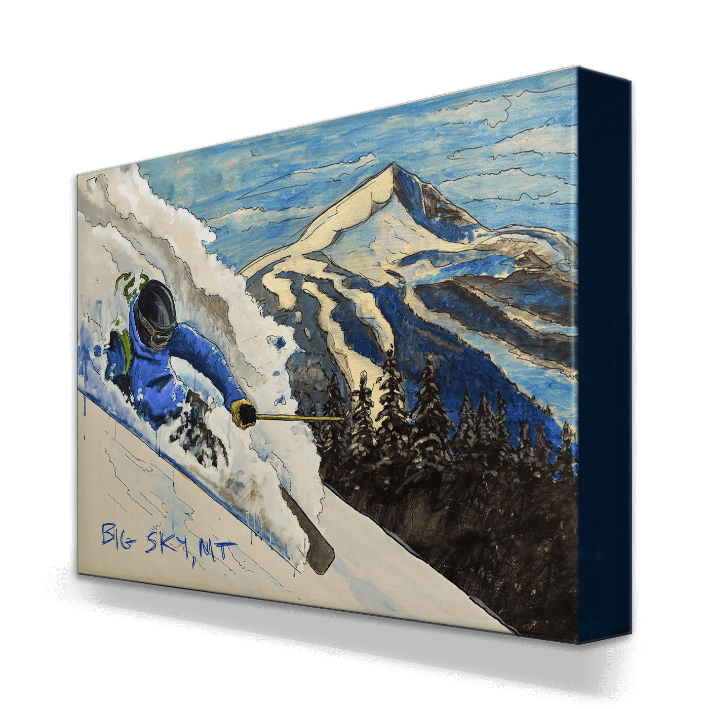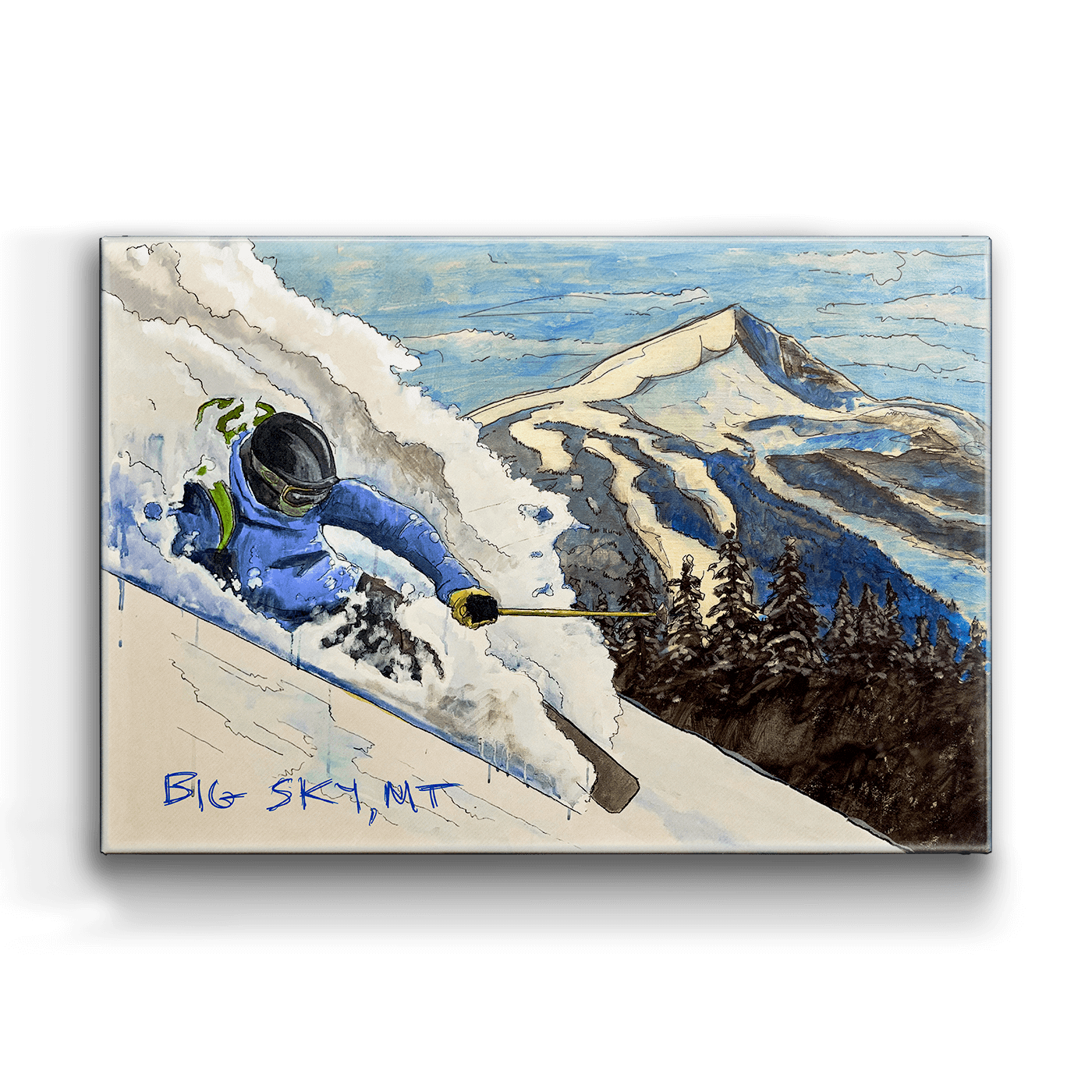 Feel the rush of powder and speed with this bold portrayal of a skier descending Lone Mountain in Big Sky, Montana. The vibrant colors and dynamic movement bring to life the thrill of a perfect day on the slopes. A vivid tribute to adventure, freedom, and the legendary terrain that makes Big Sky a world-class skiing destination.