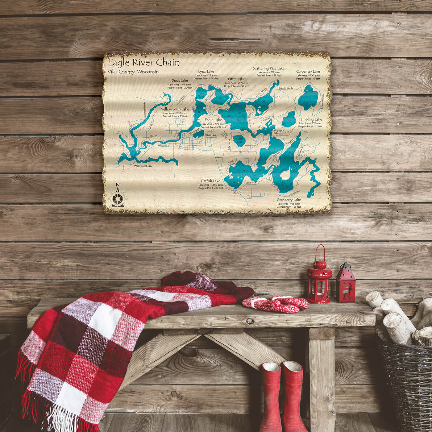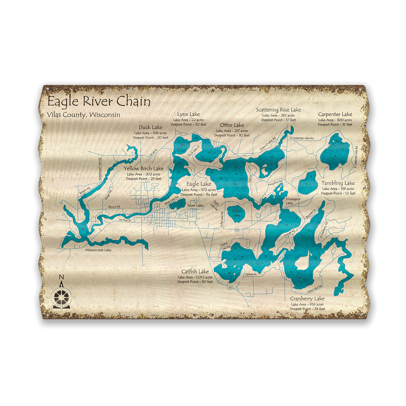 Introducing our exquisite decorative vintage map of the Eagle River Chain Lakes in Wisconsin - a stunning portrayal of the area's natural beauty, wildlife, and history. Made up of over a dozen lakes, including Yellow Birch Lake, Duck Lake, Lynx Lake, Otter Lake, Catfish Lake, Cranberry Lake, Tambling Lake, Carpenter Lake, and Scattering Rice Lake, the Eagle River Chain Lakes are home to a diverse range of wildlife, this map is a tribute to the richness of the natural world. Crafted with care and attention to detail, this vintage map is a piece that's sure to spark conversation and inspire awe.