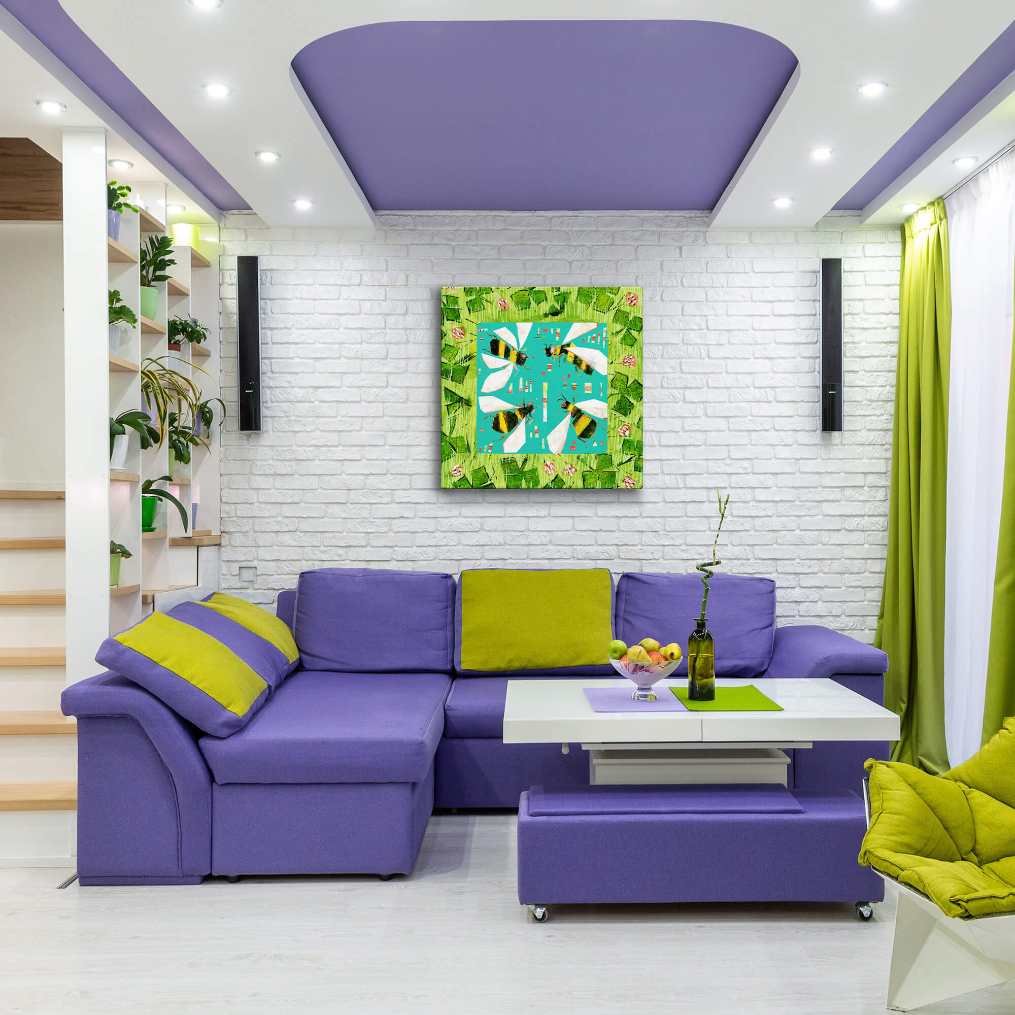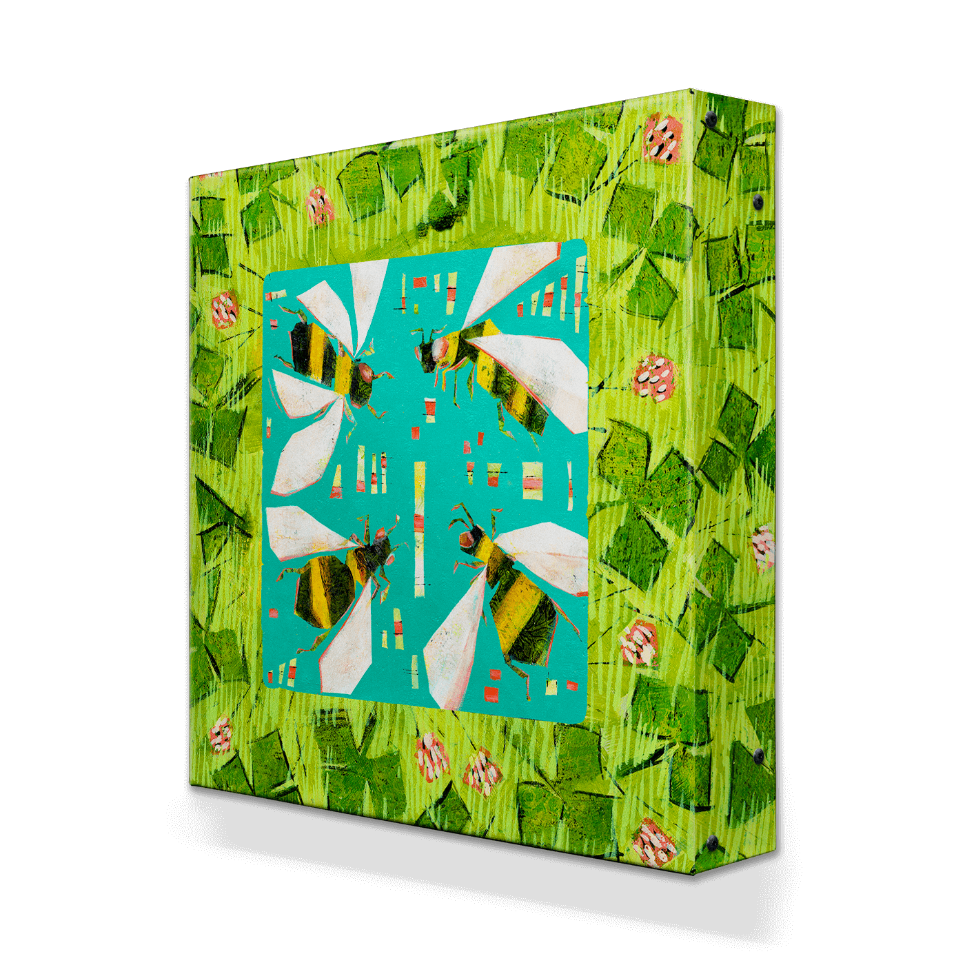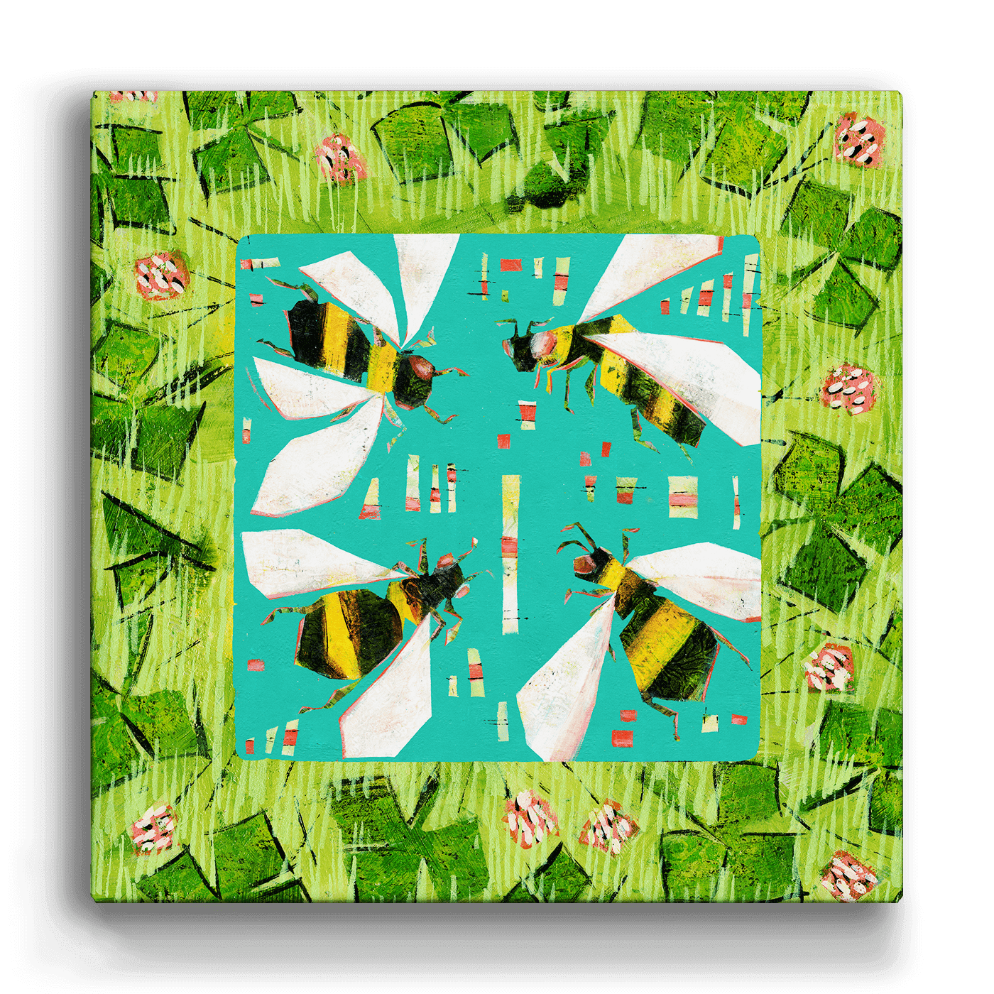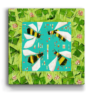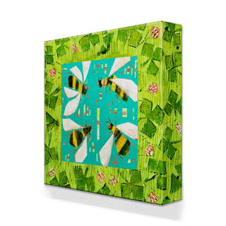 This vibrant artwork captures the dynamic energy of buzzing bees against a striking turquoise background, surrounded by a lush, textured green border of clover. The intricate details and vivid colors celebrate the vital role of pollinators in our ecosystem. Blending nature's charm with artistic expression, this piece is perfect for nature enthusiasts and eco-conscious art lovers.