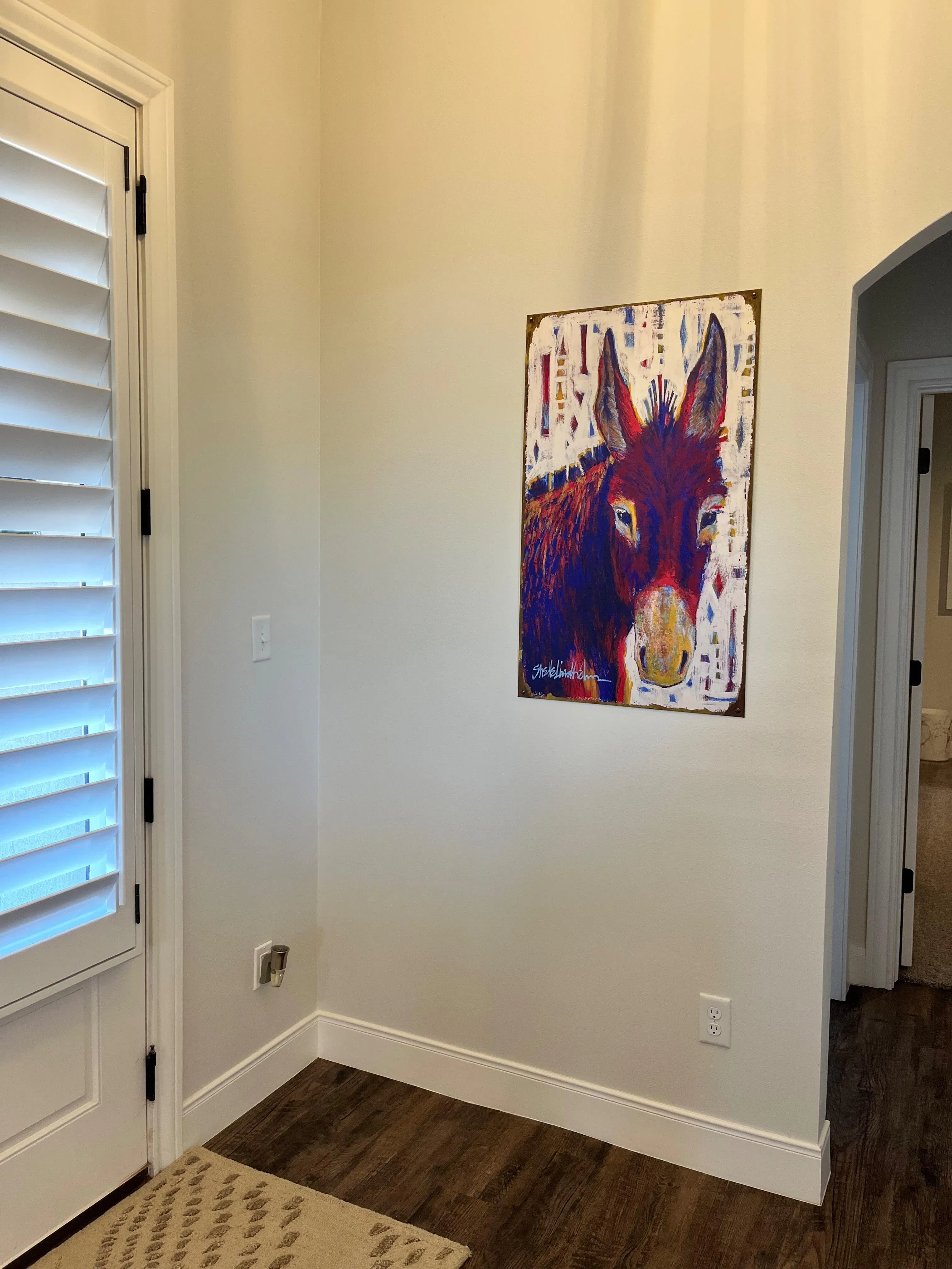 "Jack of All Trades" presents a vibrant and textured portrait of a donkey, brilliantly captured against a backdrop of abstract shapes and symbols. The artwork utilizes a rich palette of blues, reds, and whites, emphasizing the spirited nature of its subject. This piece blends rustic charm with a contemporary edge, making it an exceptional choice for those who appreciate art that combines animal imagery with modern abstract elements. Perfect for adding a touch of whimsy and color to any home or office space.
