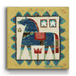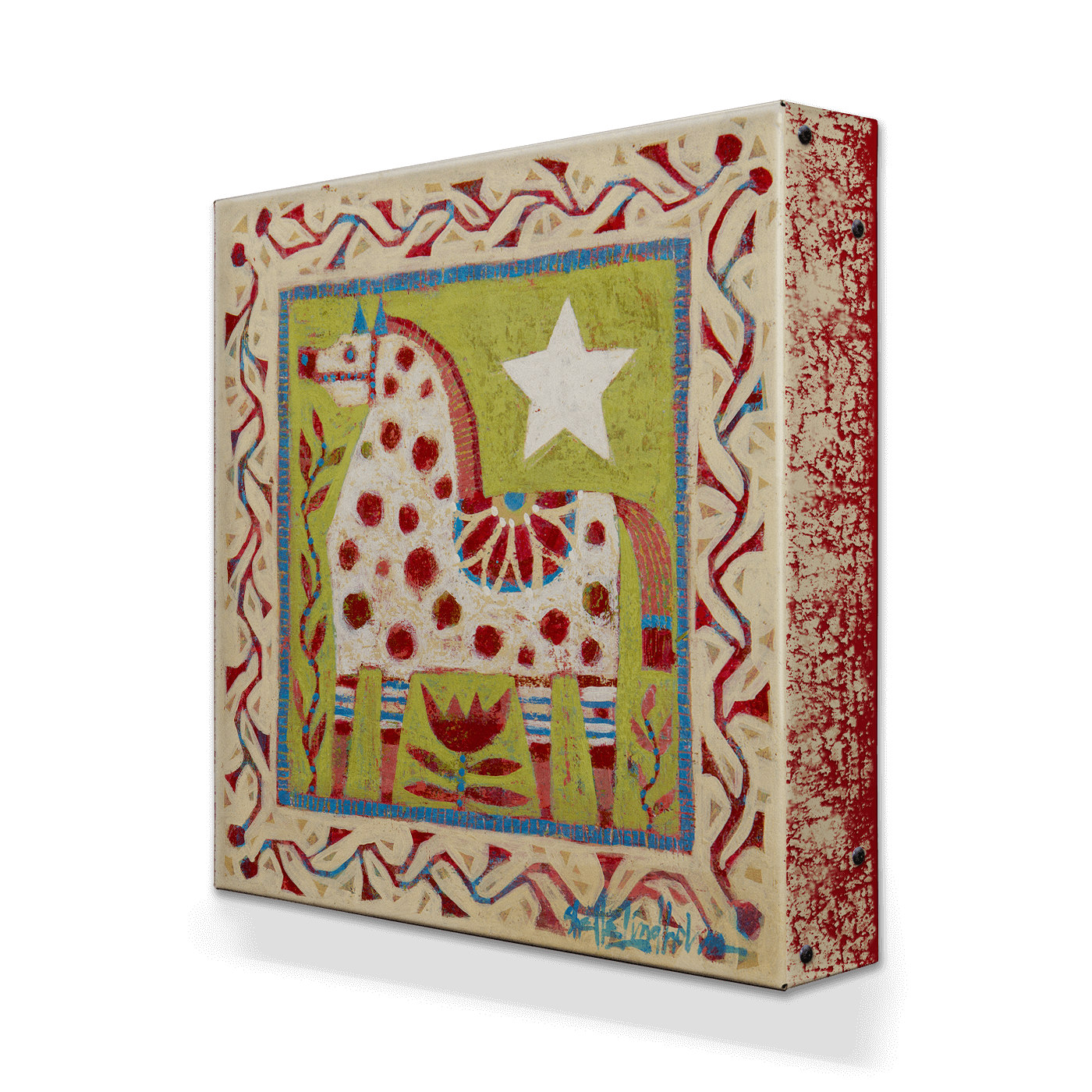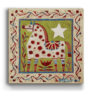 Part of our collection of four Swedish Dala horse-inspired paintings, this delightful artwork features a red-spotted horse and delicate folkloric patterns, set against a rich green background. A bold white star and a blooming tulip add symbolic touches, while the decorative border enhances the piece's natural charm. Full of texture and whimsical detail, this composition celebrates heritage with a playful and timeless touch, perfect for brightening any space.