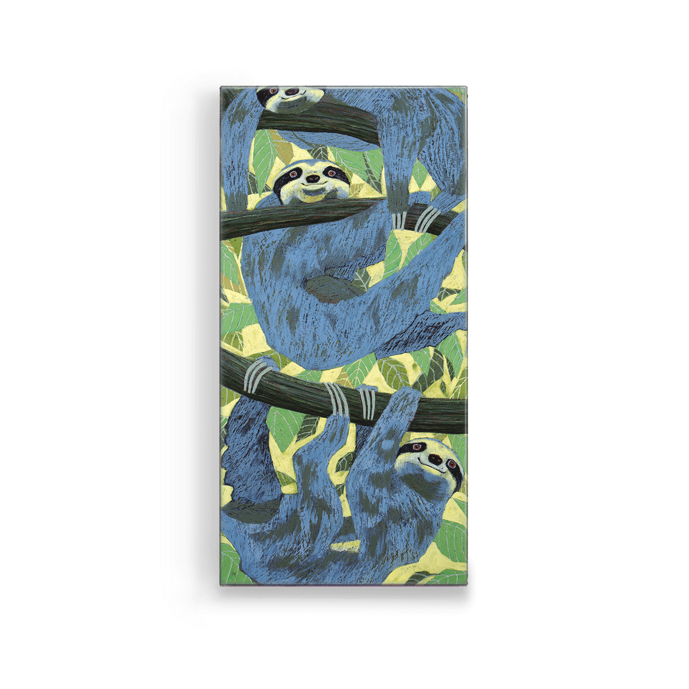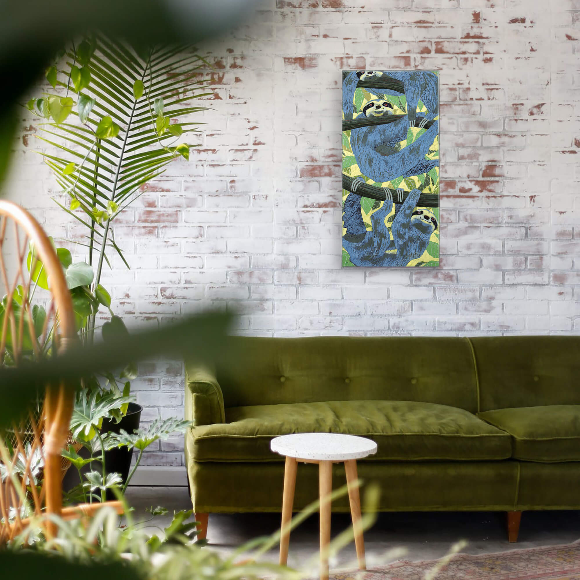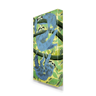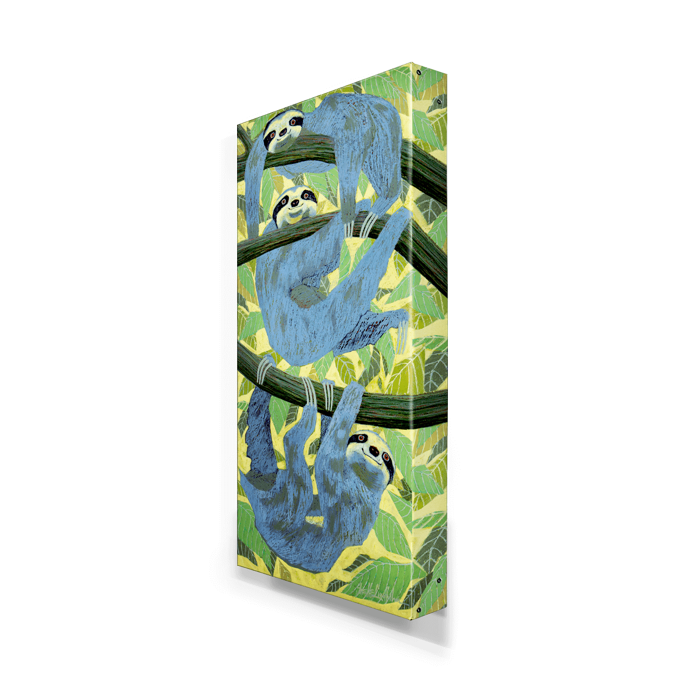 This playful artwork brings the charm of a family of sloths hanging on lush green branches. The intricate textures and soothing palette capture the essence of tranquility and nature's simplicity, perfect for any space in need of a calm and whimsical vibe. Ideal for animal and nature lovers, this artwork radiates warmth and joy, making it a delightful addition to your decor.