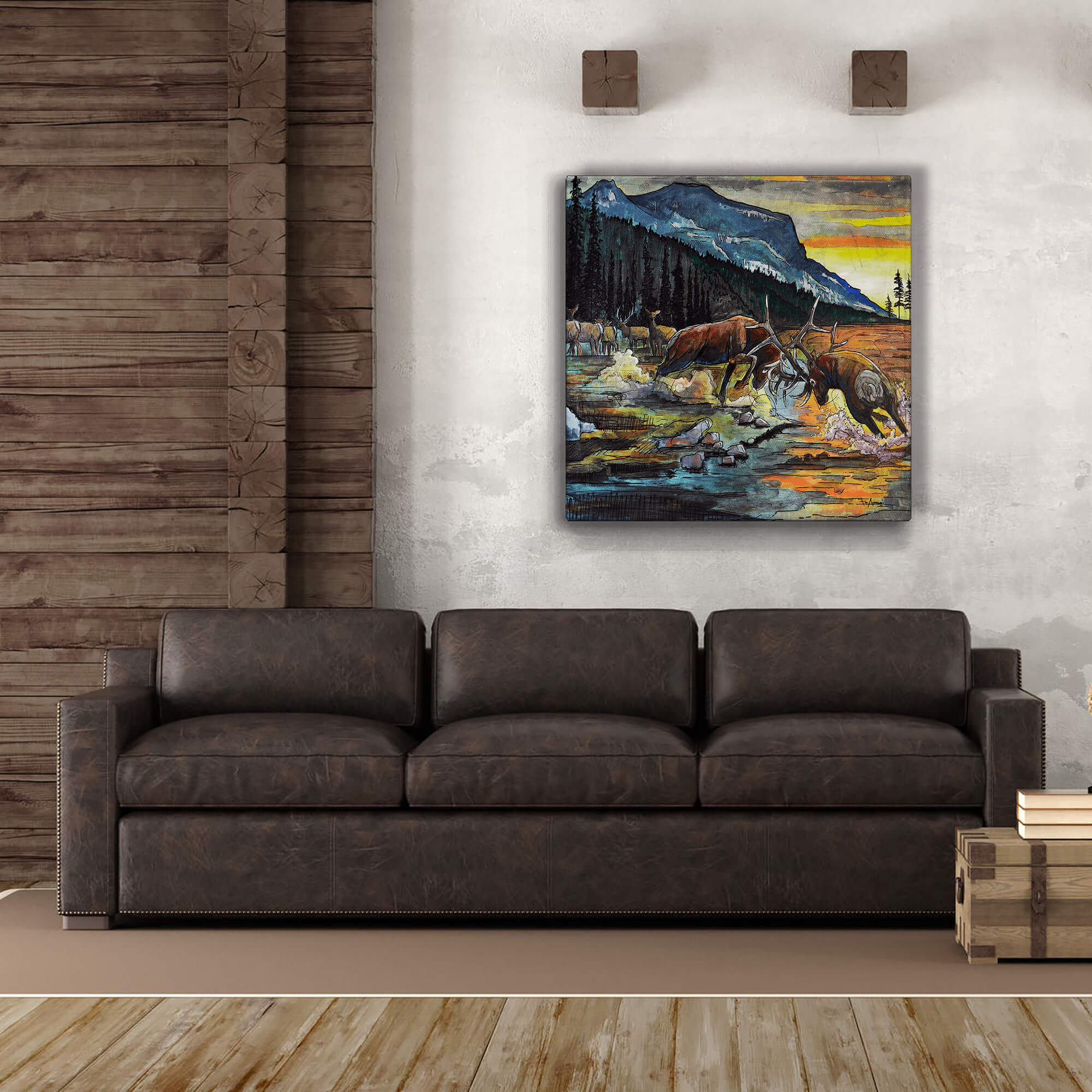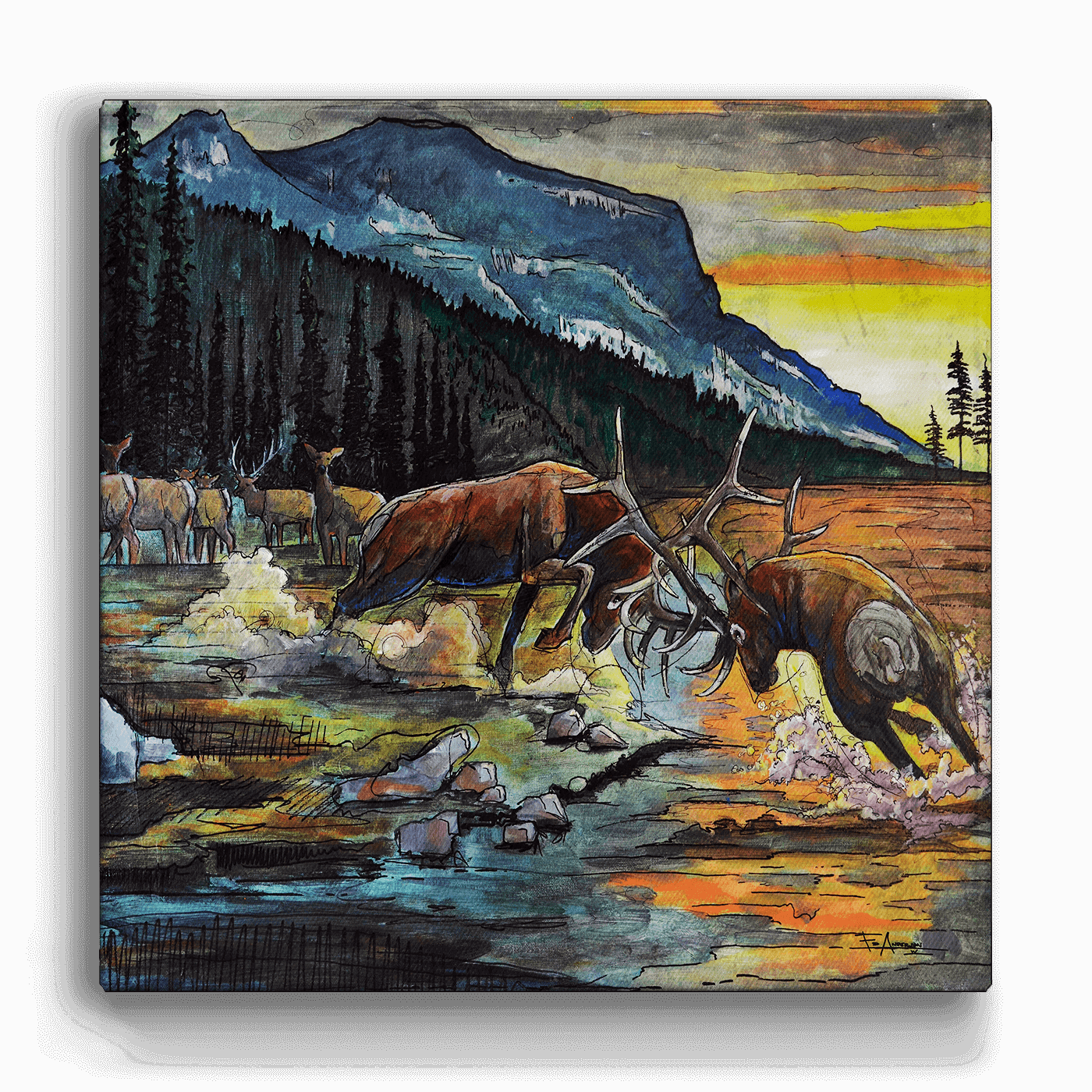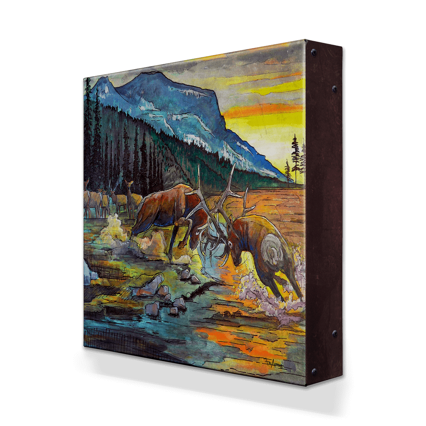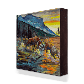 Experience the raw power and beauty of the wild with our Bull Fight metal box art. Featuring two majestic bull elk in a heated competition over who gets to court the ladies, this piece captures the essence of nature with stunning detail. Perfect for any outdoor enthusiast or art lover, this piece will add a touch of rugged elegance to any room.