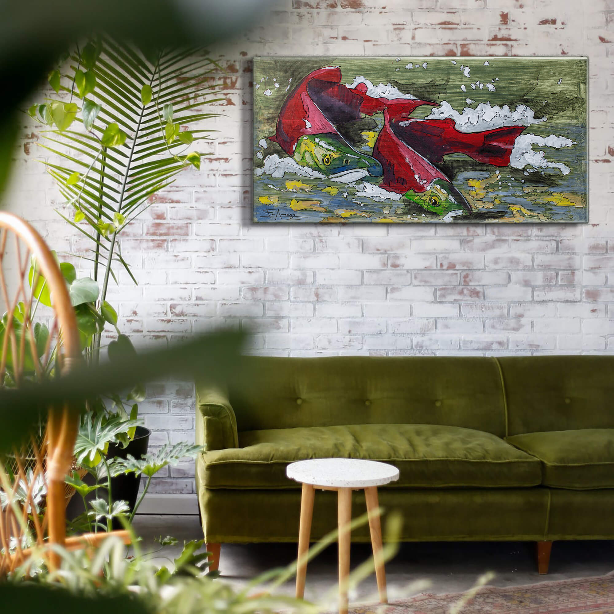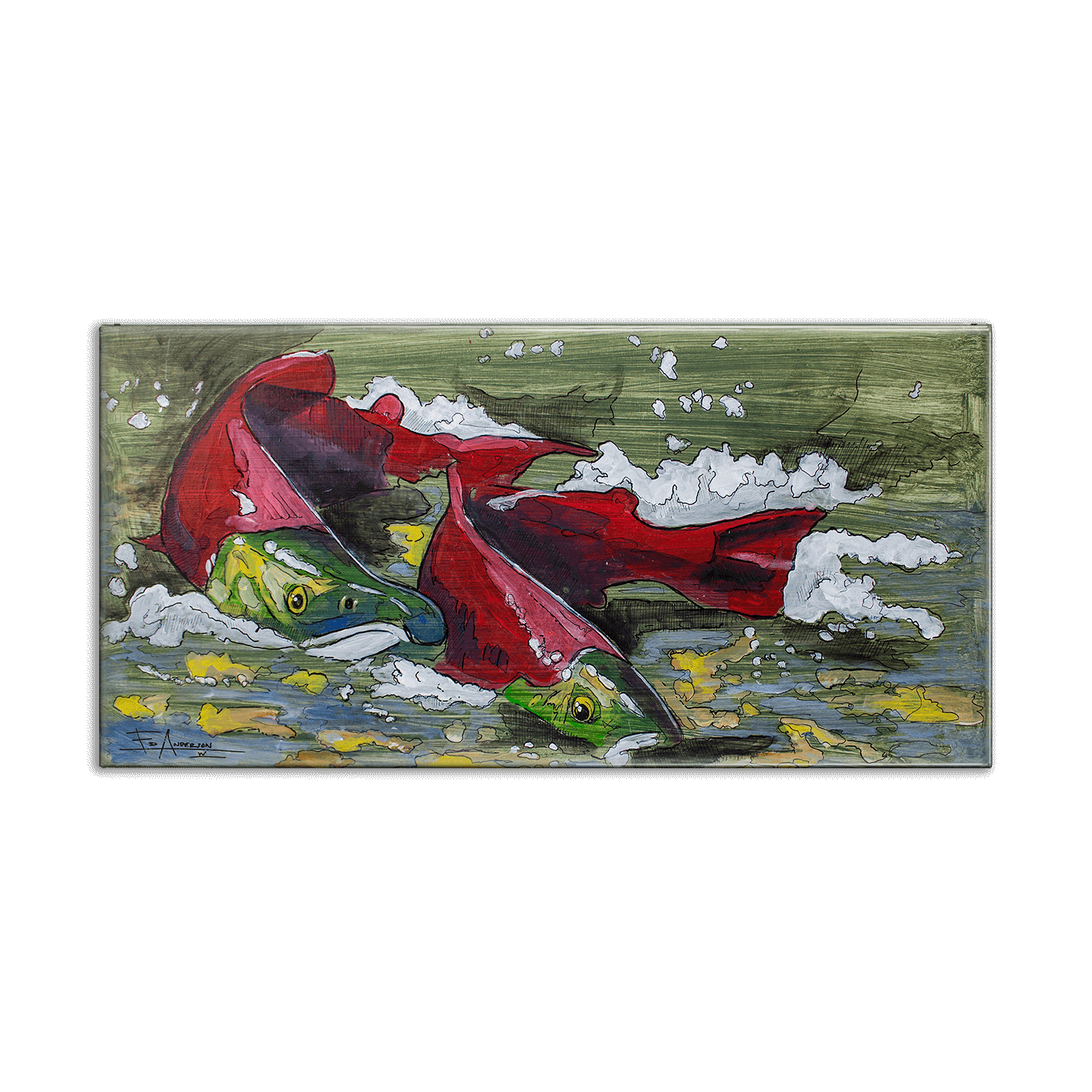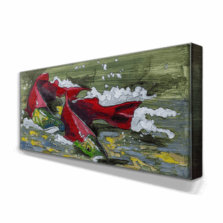 This vivid artwork captures two sockeye salmon battling their way up a river, showcasing the raw determination and resilience of these remarkable fish. The artist skillfully uses a vibrant color palette and dynamic brushstrokes to depict the swirling water and the fish's vigorous movement, capturing the intensity of their upstream journey. This compelling piece is a tribute to the enduring spirit of nature, perfect for those who appreciate the beauty of aquatic life.