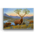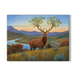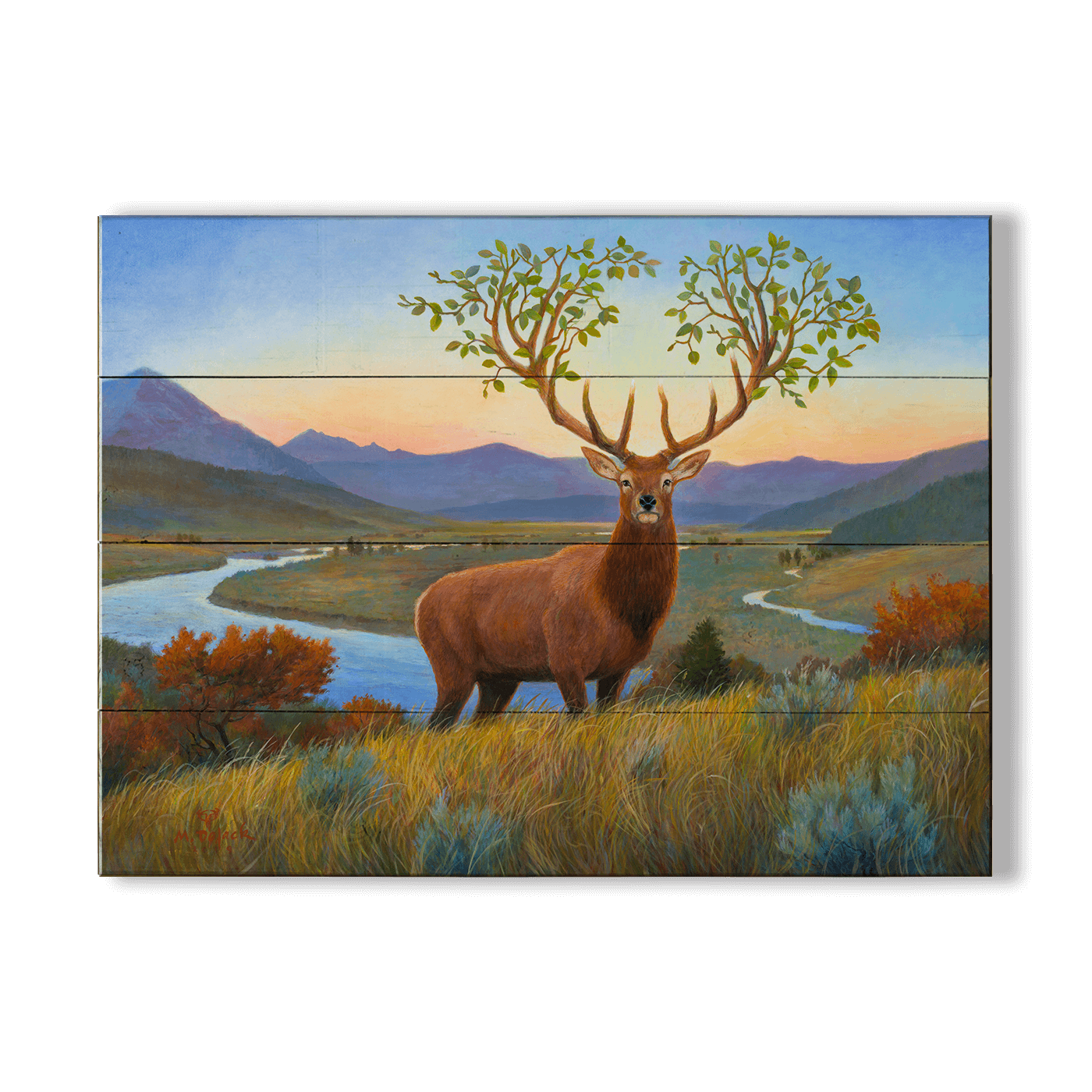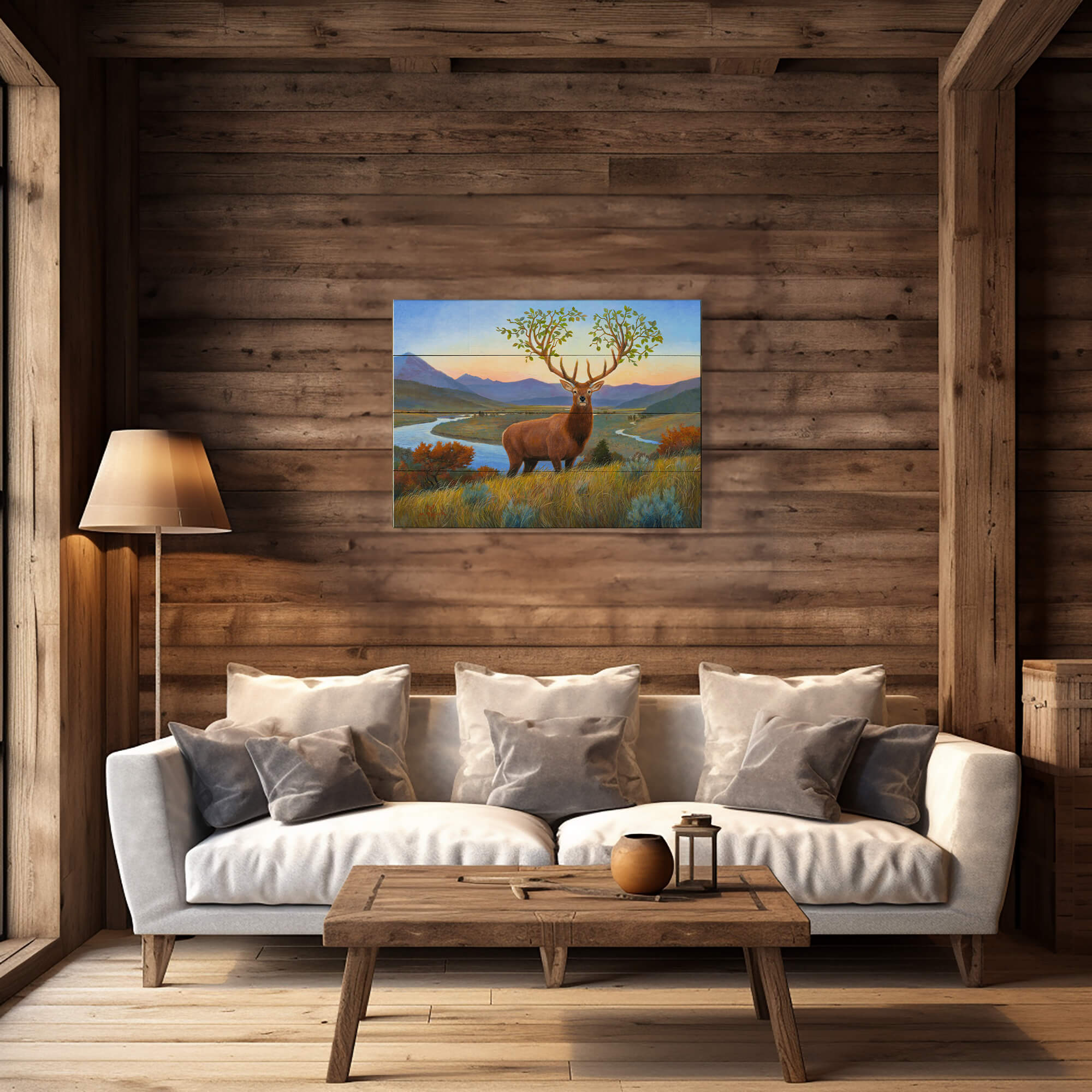 This enchanting artwork captures a majestic stag standing amidst a serene, gold-tinted landscape at twilight. The rolling hills and meandering river provide a tranquil backdrop, but it’s the extraordinary antlers adorned with flourishing green leaves that steal the show, blending nature and fantasy in perfect harmony. With soft hues of dawn or dusk bathing the scene in warmth, this piece symbolizes the connection between wildlife and the life-giving essence of nature. Perfect for lovers of whimsical art and scenic vistas, this unique masterpiece is a celebration of imagination, wilderness, and serene beauty.