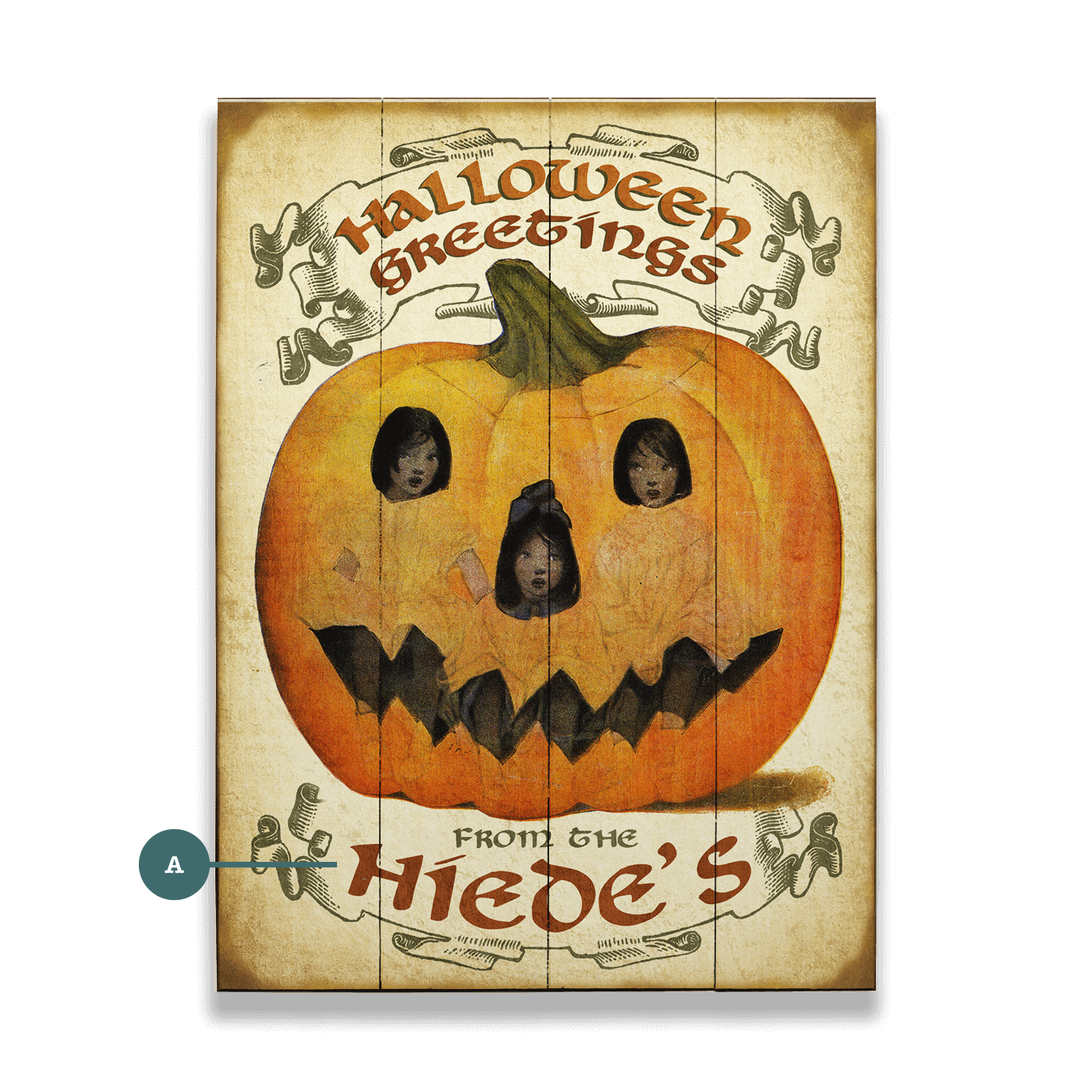 A playful blend of charm and curiosity, this Halloween sign features a grinning jack-o'-lantern with the heads of three children peeking through as its eyes and nose, creating a whimsical and surreal autumn scene. The parchment-style background, aged edges, and vintage lettering evoke a bygone era of Halloween traditions, while the warm tones of orange and cream add nostalgic flair. A delightful addition to entryways, seasonal displays, or festive gatherings, this piece extends the invitation to embrace the fun of fall with a personalized touch.