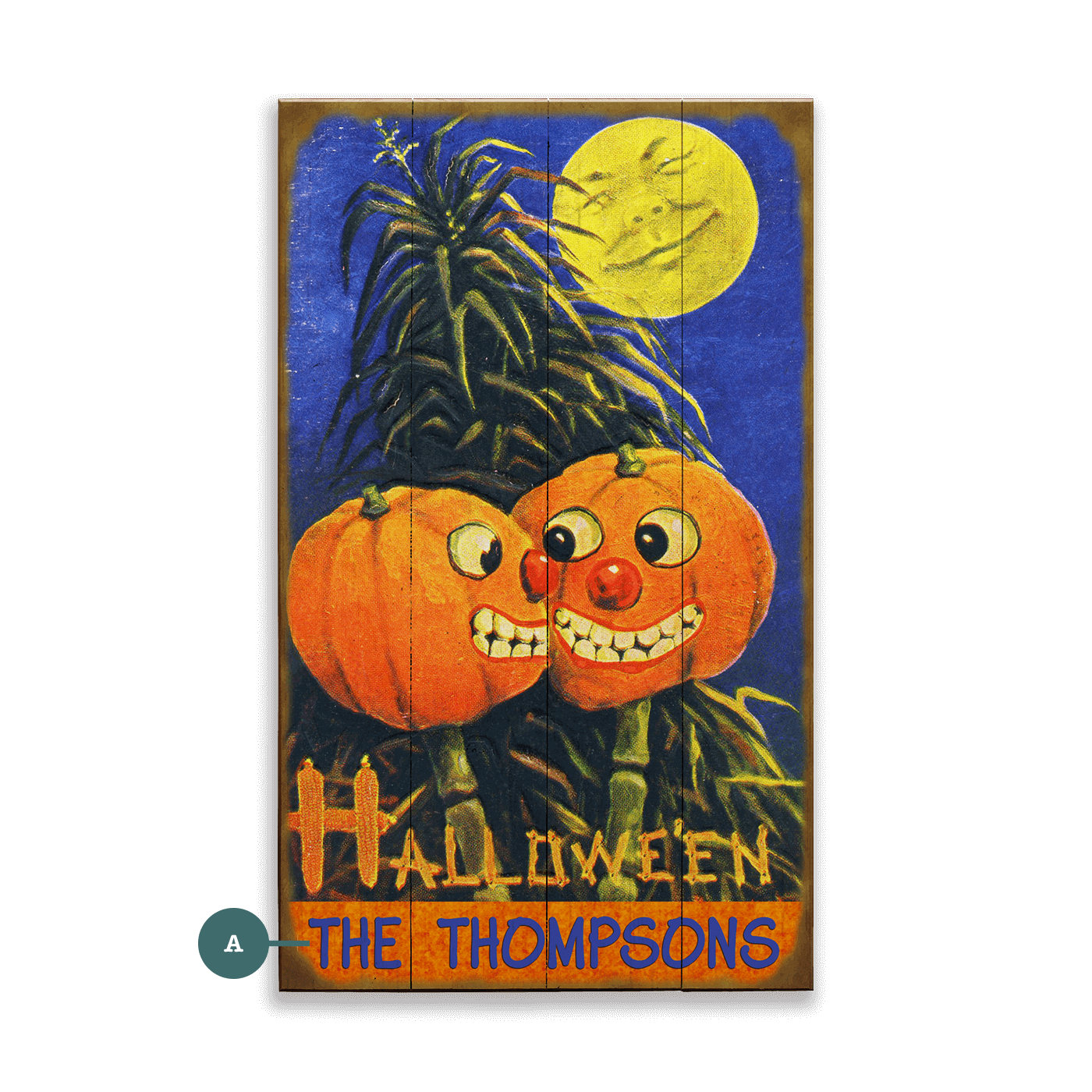 Bring a playful dose of vintage Halloween charm to your decor with this delightfully spooky artwork. Featuring two grinning jack-o’-lanterns perched atop cornstalks under a glowing, whimsical moon, the design captures the nostalgic spirit of old-fashioned Halloween fun. The richly colored background and expressive faces give it the look of a classic postcard illustration, making it a standout piece for autumn displays. Perfect for seasonal decorating, this retro-inspired sign adds a touch of humor and personality to any Halloween celebration.