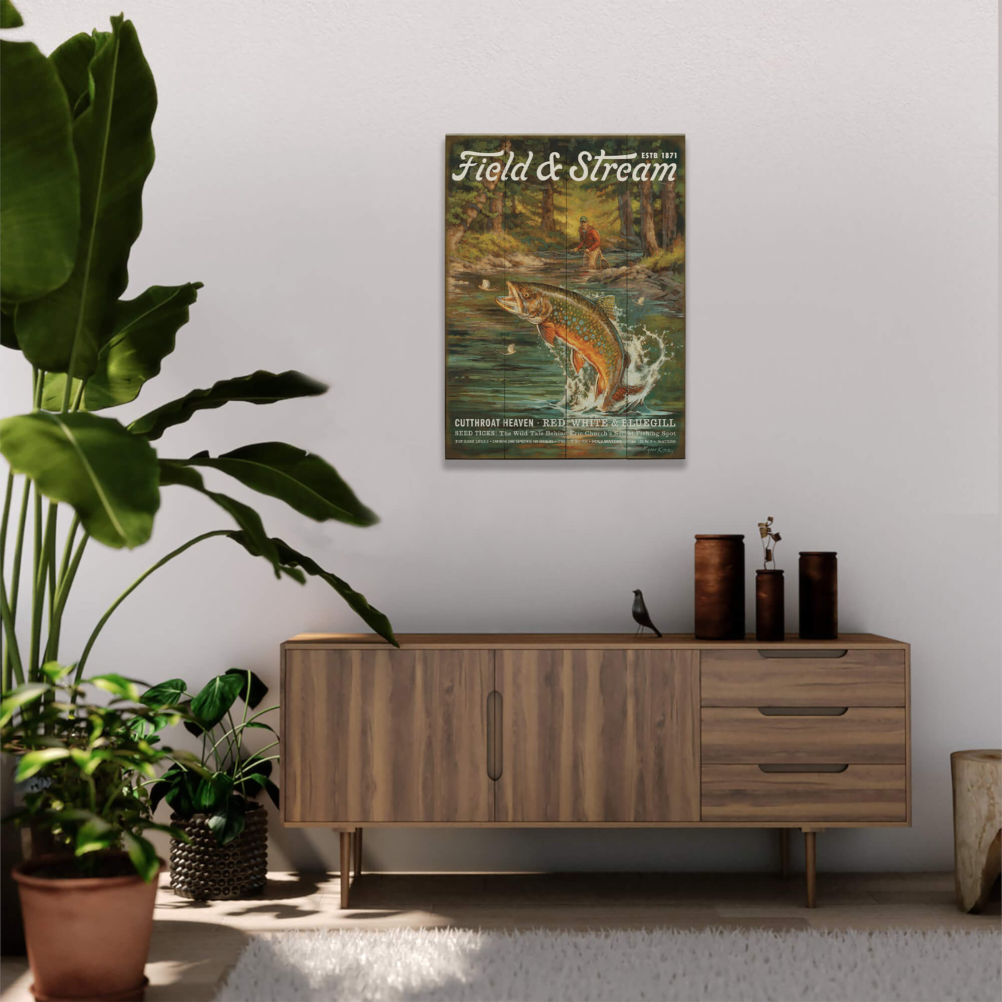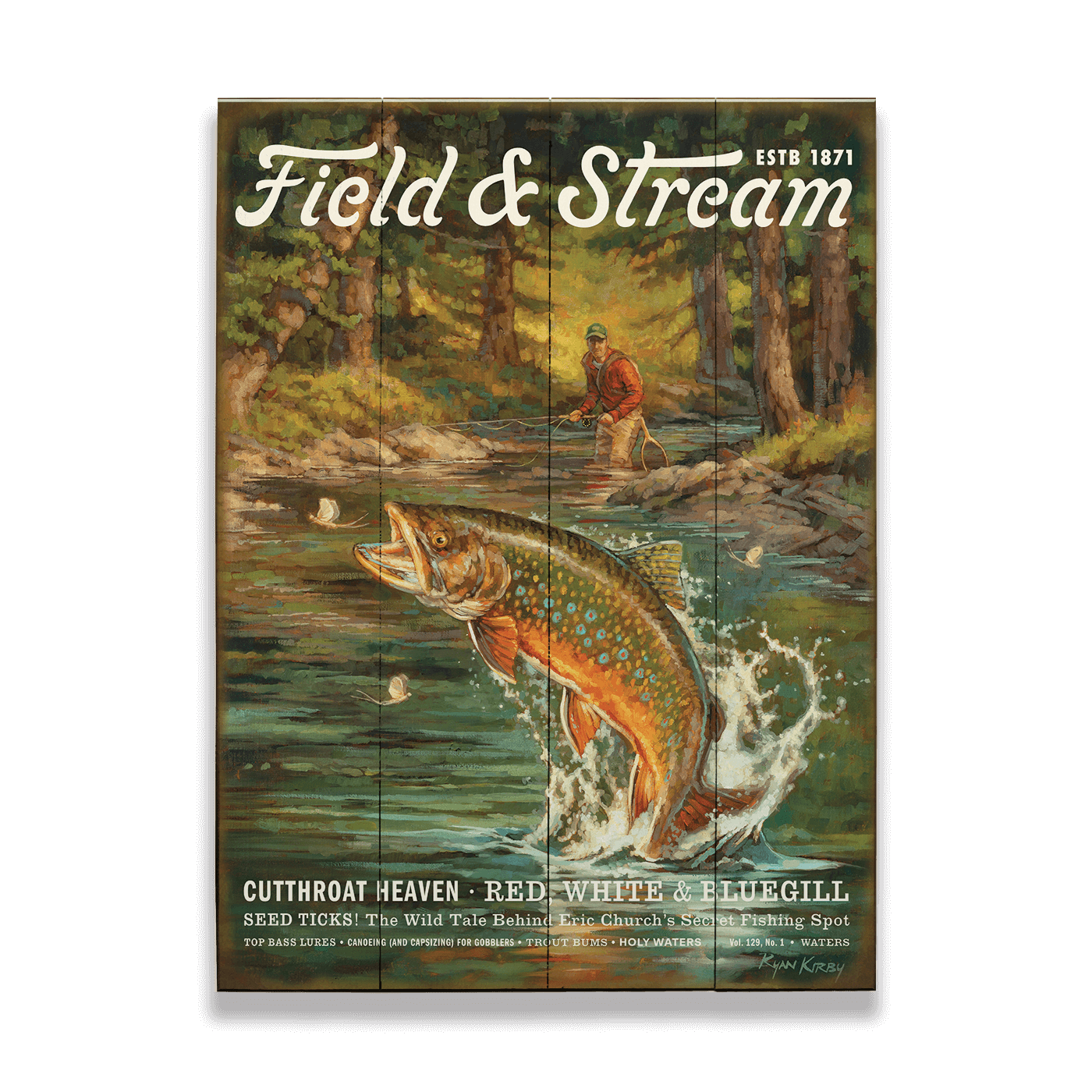 Capture the split-second harmony of instinct and intention with this dynamic Field and Stream cover. A trout bursts from the water in pursuit of tantalizing mayflies, its leap frozen in a moment of raw power, while the angler stands upstream, eyes locked and ready to cast. Framed by quiet forest and rippling current, this scene reflects the timeless dance between fish and fisherman—where patience, precision, and wild instinct meet. Ideal for rustic spaces, fly fishing enthusiasts, or collectors of classic sporting art.