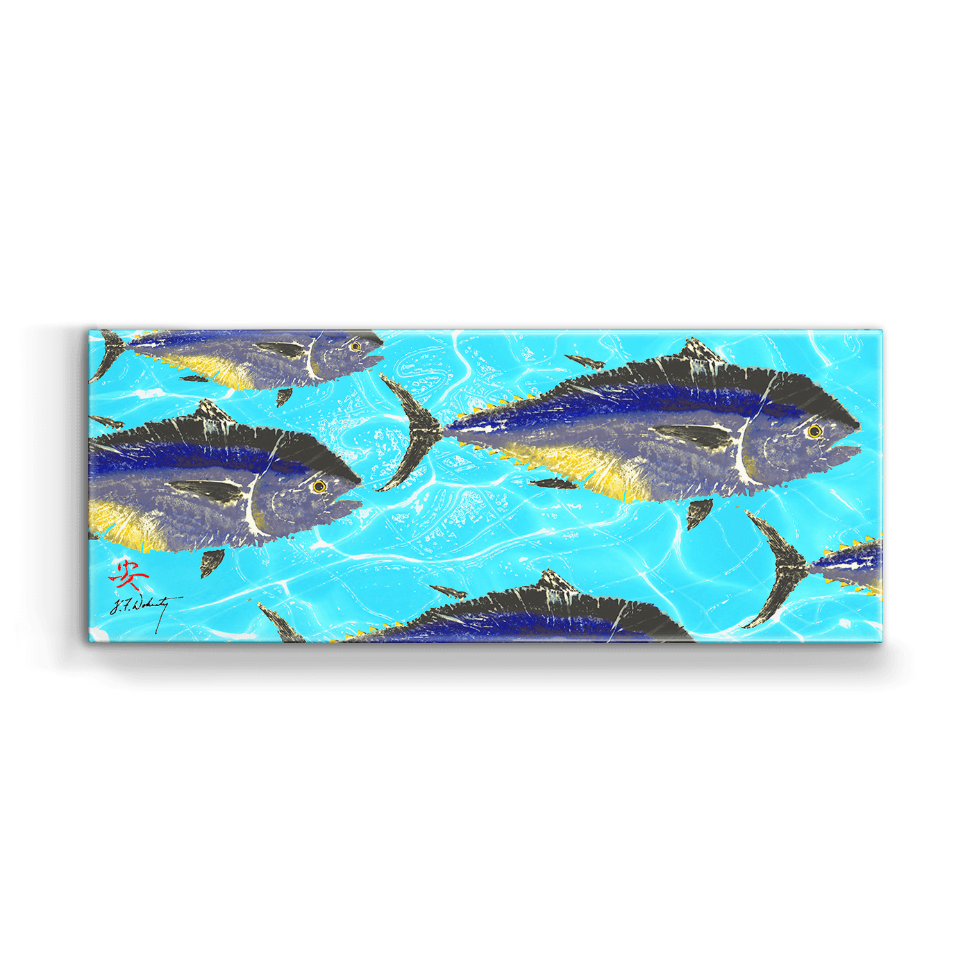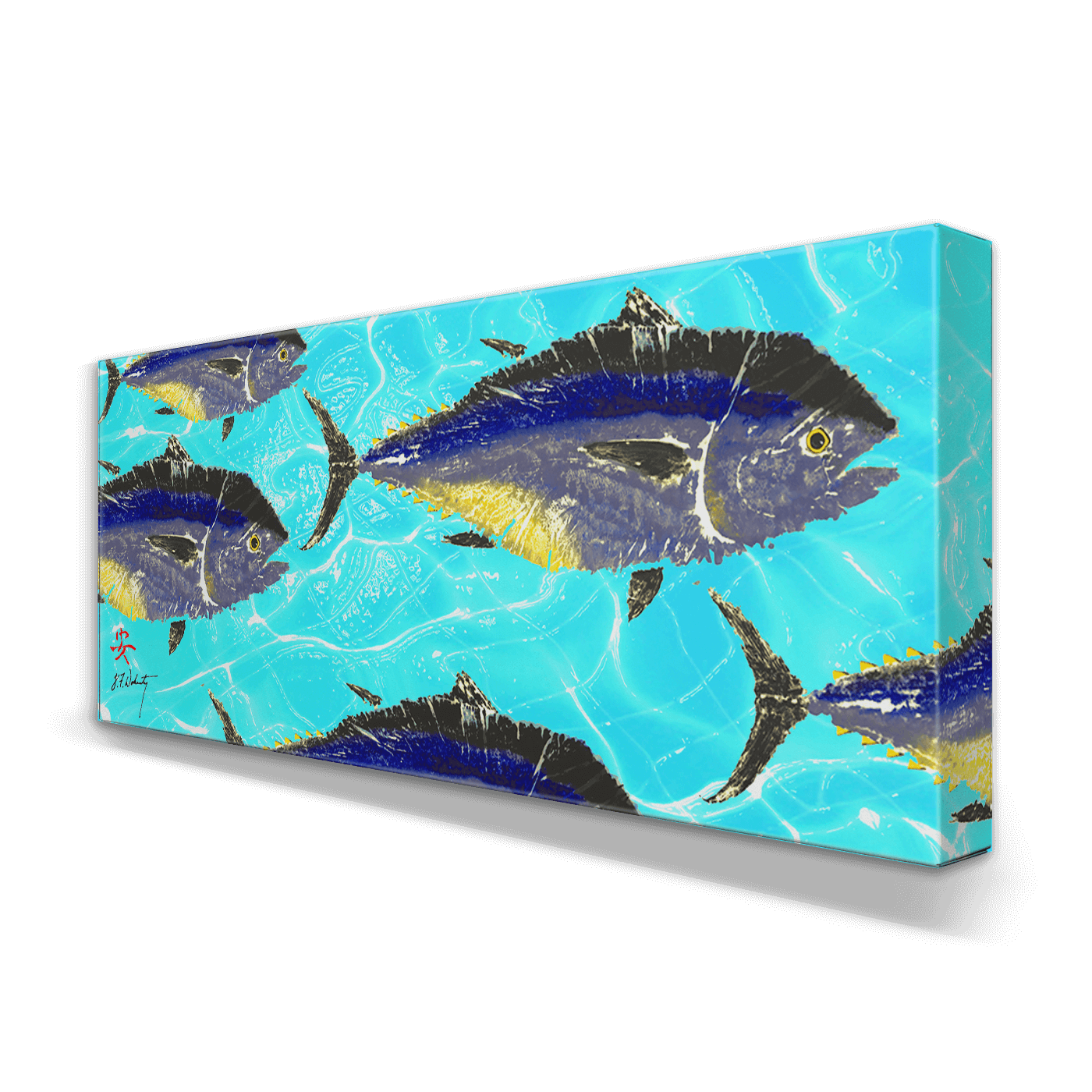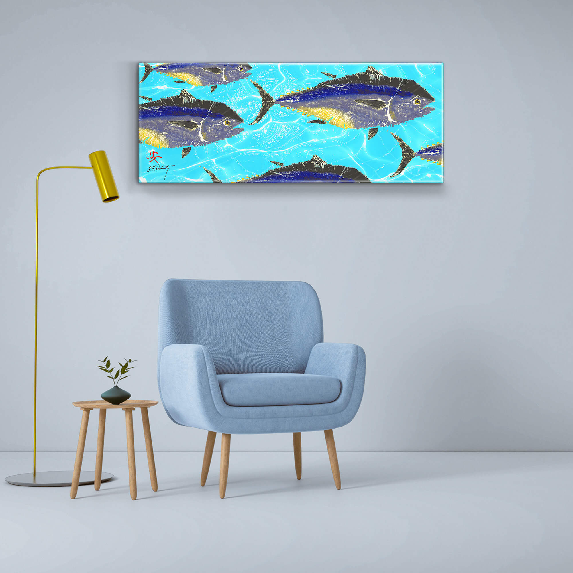 Experience the fluid dance of the sea with school of Bluefin - a captivating scene of bluefin tuna in motion. The remarkable liquid finish printing process infuses the water around the fish with a glossy, moving quality, creating the illusion of an underwater spectacle frozen in time, ready to animate any space with the essence of the ocean's depths.