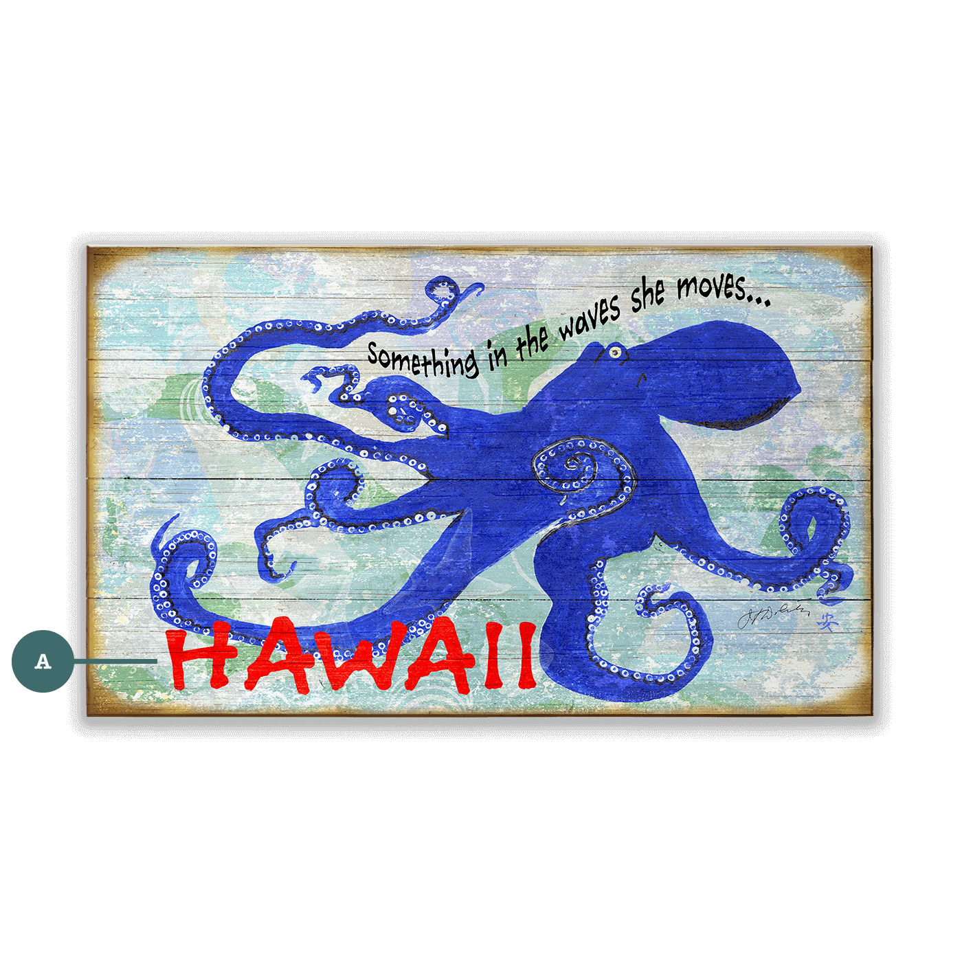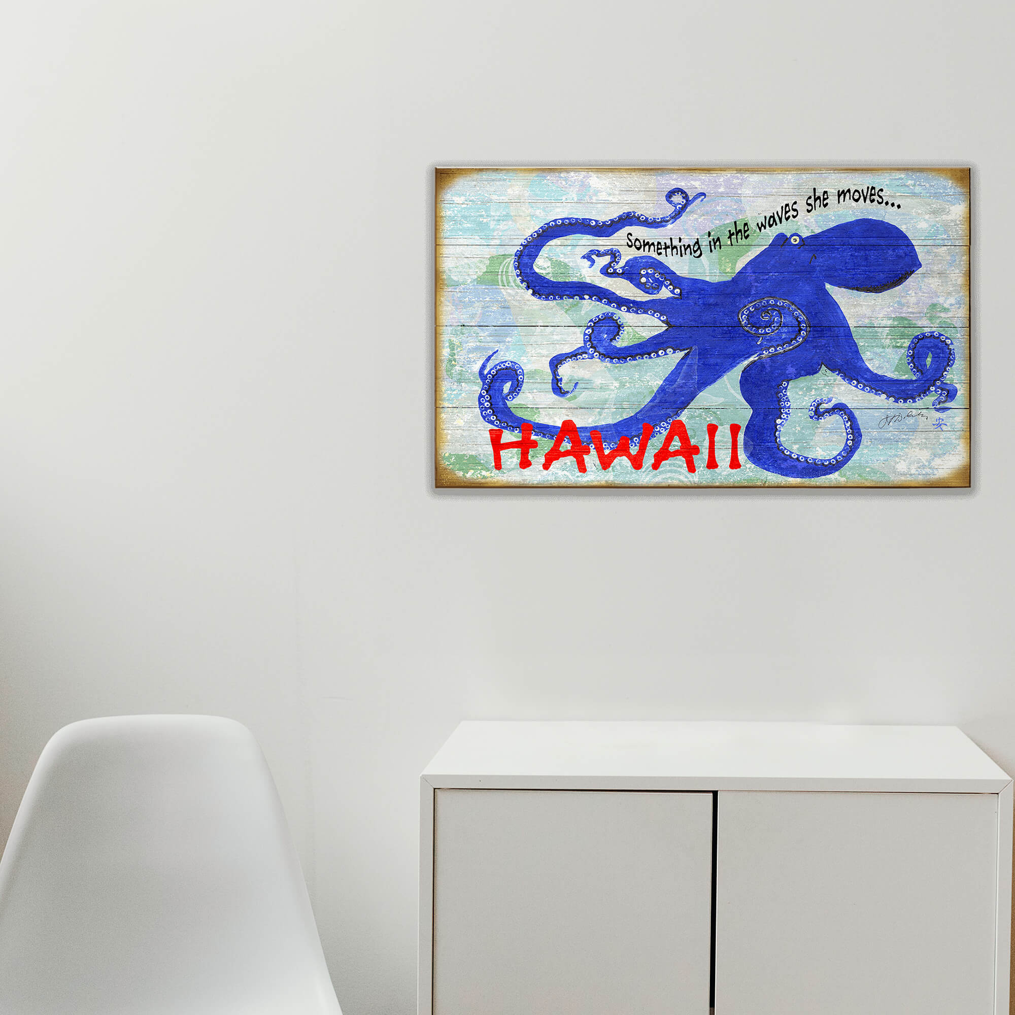 Dive into the enchanting deep blue with this captivating artwork, a true treasure from the vast ocean of creativity. The bold, cobalt octopus stretches its tentacles across the canvas, encircled by whimsical, pearl-like textures that echo the mysteries of the sea. A subtle nod to the fluidity and grace of marine life, the phrase "Something in the waves she moves..." dances above, adding a lyrical touch to the piece. Highlighted against the backdrop of a serene, wave-kissed texture, the red-lettered and customizable "HAWAII" anchors the work, calling to mind the vibrant spirit of the islands.