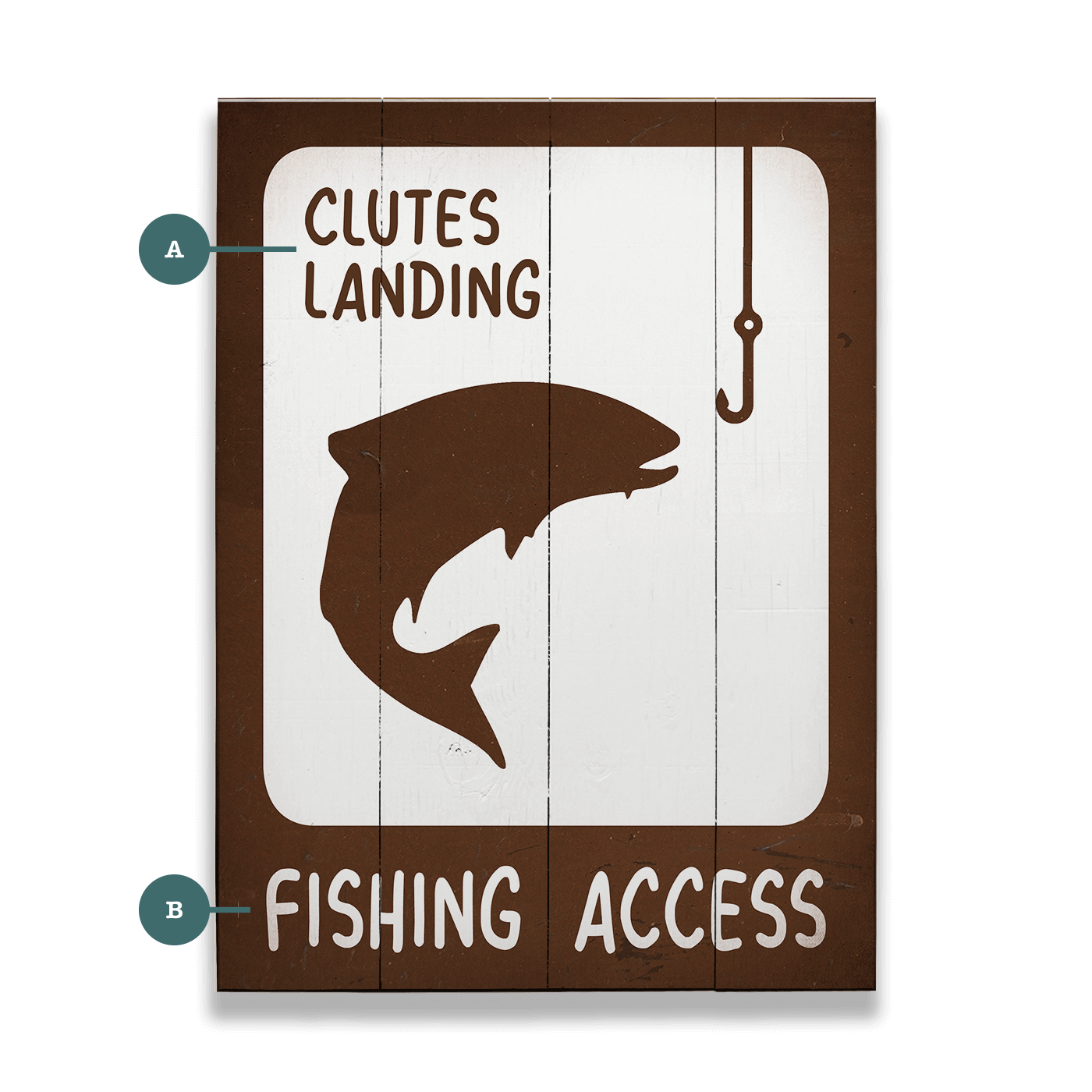 This rustic, trail-style fishing access sign blends classic outdoor iconography with timeless charm. Featuring a bold silhouette of a fish and a dangling hook, the clean, high-contrast design echoes familiar wayfinding signs found near rivers, lakes, and forest preserves. A fitting piece for cabins, lodges, bait shops, or any space with an angling spirit, it brings a touch of the backcountry to wherever it's displayed.