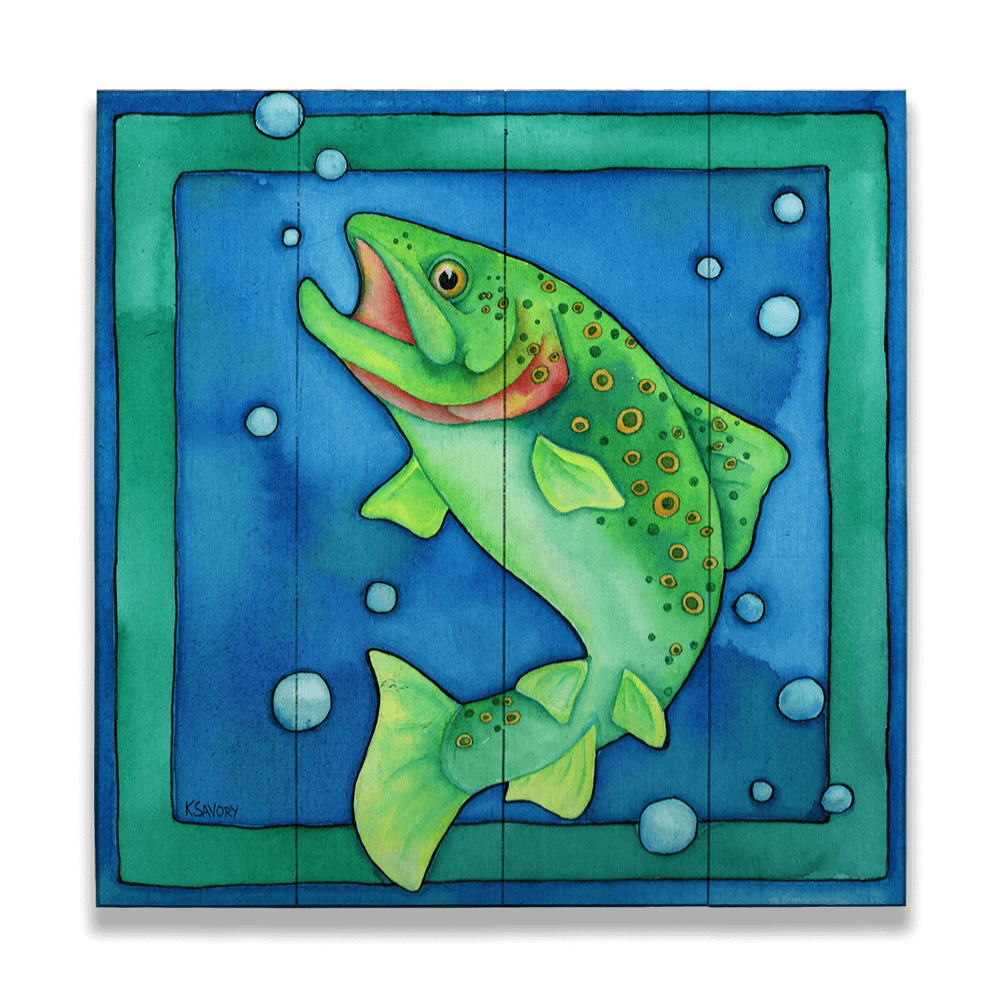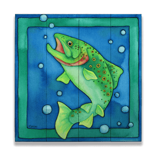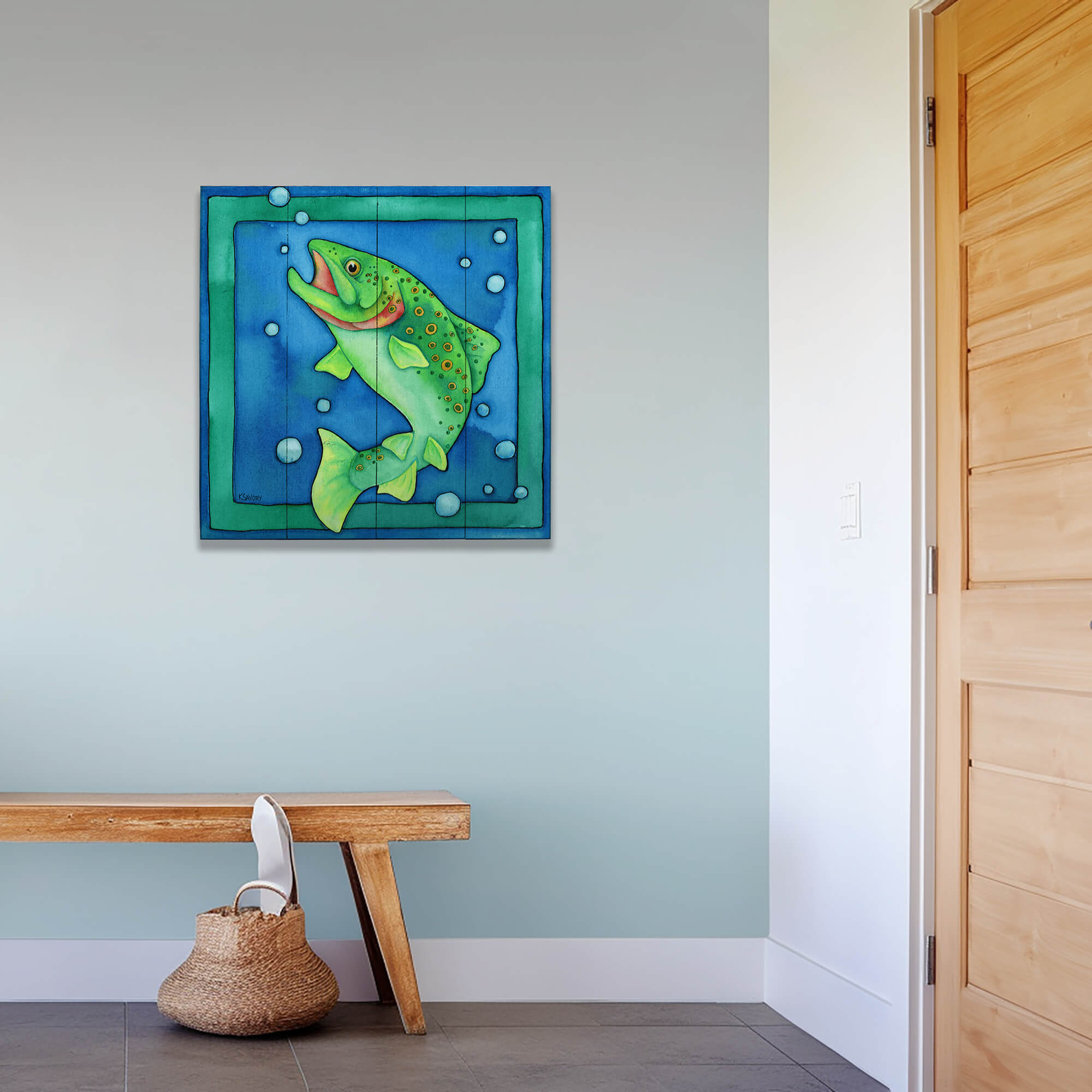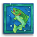This vibrant artwork features a lively, stylized fish swimming in an underwater scene, set against a bold blue background. The green and yellow hues bring the fish to life, capturing its natural patterns and textures with a whimsical charm. The design is framed by a contrasting green border, adding depth and highlighting the playful bubbles surrounding the fish. Perfect for nature enthusiasts or aquatic-themed decor, this piece adds a splash of color and energy to any space.