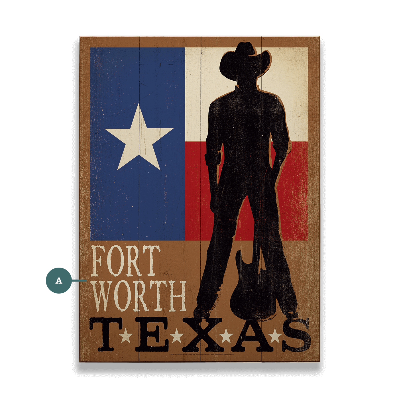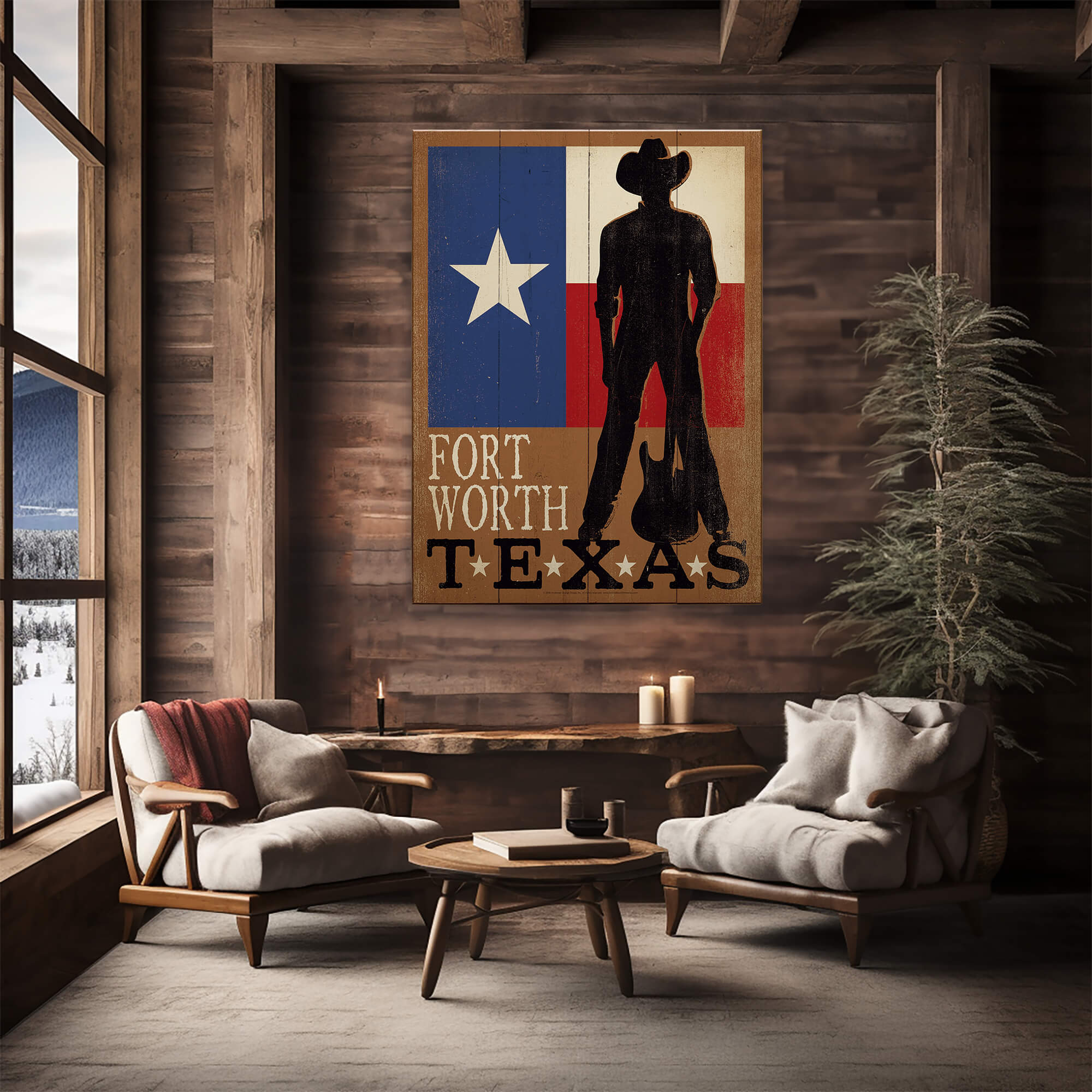 Embrace the true Texan spirit with this striking Fort Worth, Texas-themed poster, featuring the bold colors of the state flag and the confident silhouette of a cowboy. This piece is a nod to Fort Worth's rich Western heritage and its status as a city steeped in cowboy culture and history. Perfect for adding a touch of Texas pride to any room, this poster is ideal for fans of the Old West, Texas enthusiasts, and anyone who appreciates the rugged charm of Fort Worth. Let the "Where the West Begins" attitude shine in your space with this distinctive and customizable piece of art.