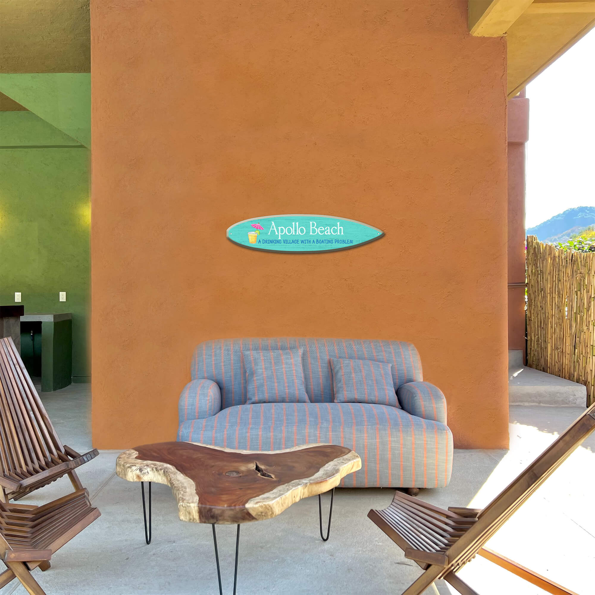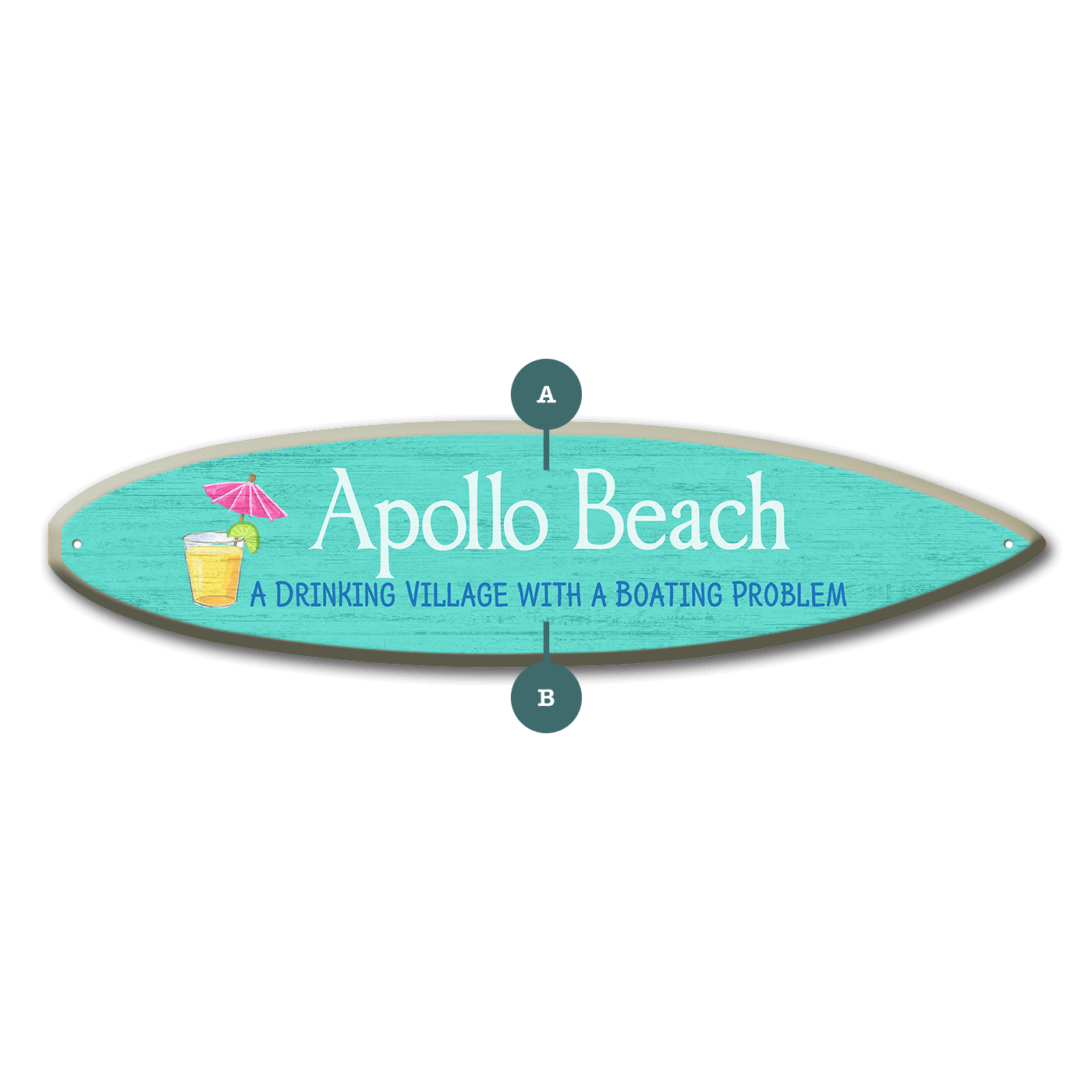 Bring a playful coastal vibe to any space with this bright, beach-inspired surfboard-shaped artwork. Featuring a tropical drink illustration and lively pastel colors, it sets the tone for laid-back good times and easygoing charm. The text can be fully customized, making it perfect for personalizing a home bar, patio, lake house, or beach retreat. Whether you want a cheeky saying or a heartfelt message, this piece offers a relaxed, vacation-ready touch to your décor.