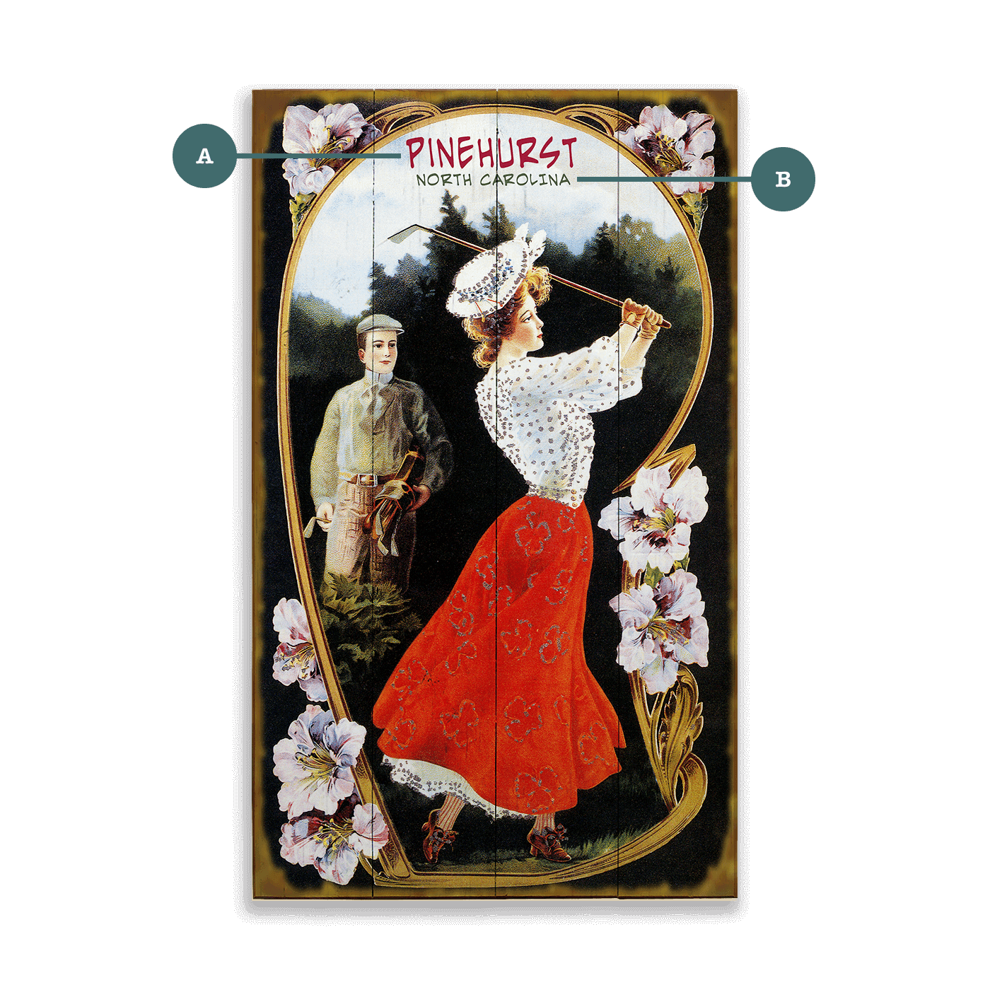 This enchanting vintage artwork features an elegantly dressed couple immersed in a round of golf, surrounded by a lush floral motif. The lady, in her striking red skirt and stylish hat, takes a graceful swing, while the gentleman observes in classic attire. This piece elegantly captures the timeless appeal of the sport, blending fashion and leisure in a nostalgic setting. Ideal for decorating a personal library, study, or living space, this artwork brings a touch of refined elegance and historical charm.