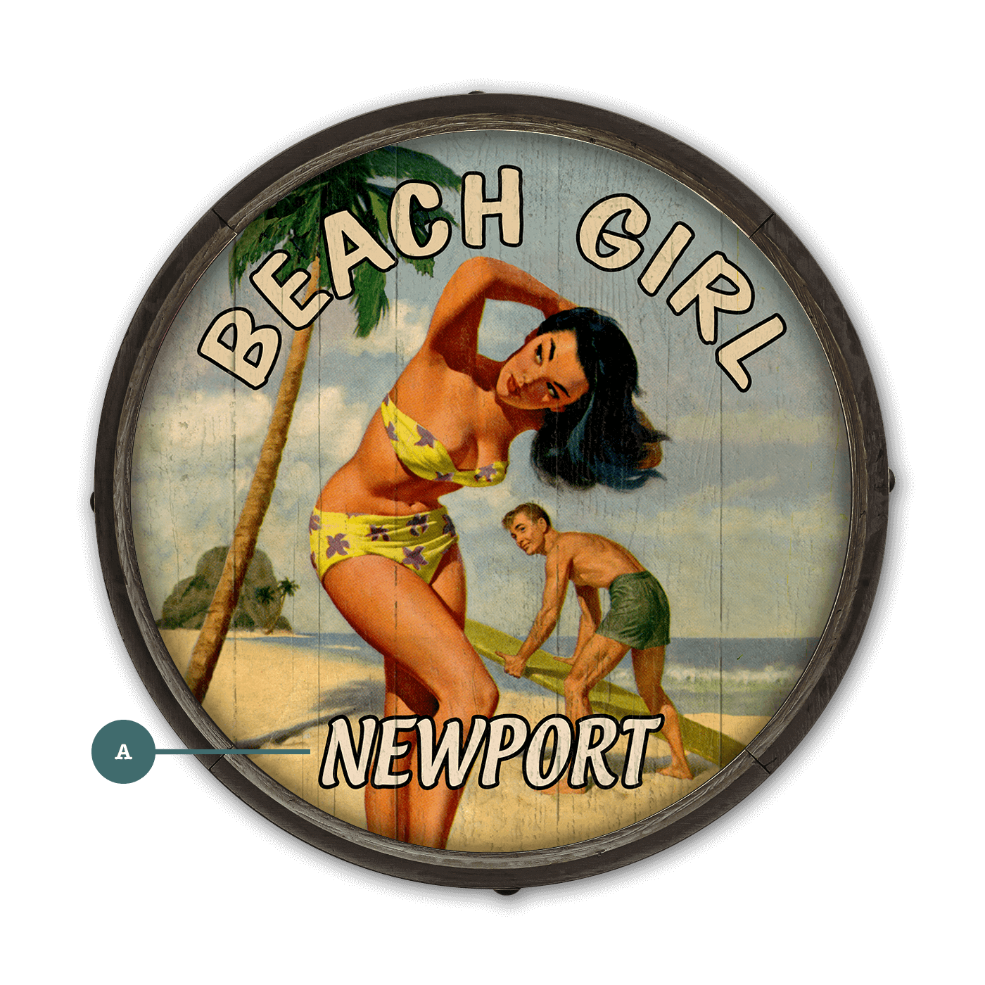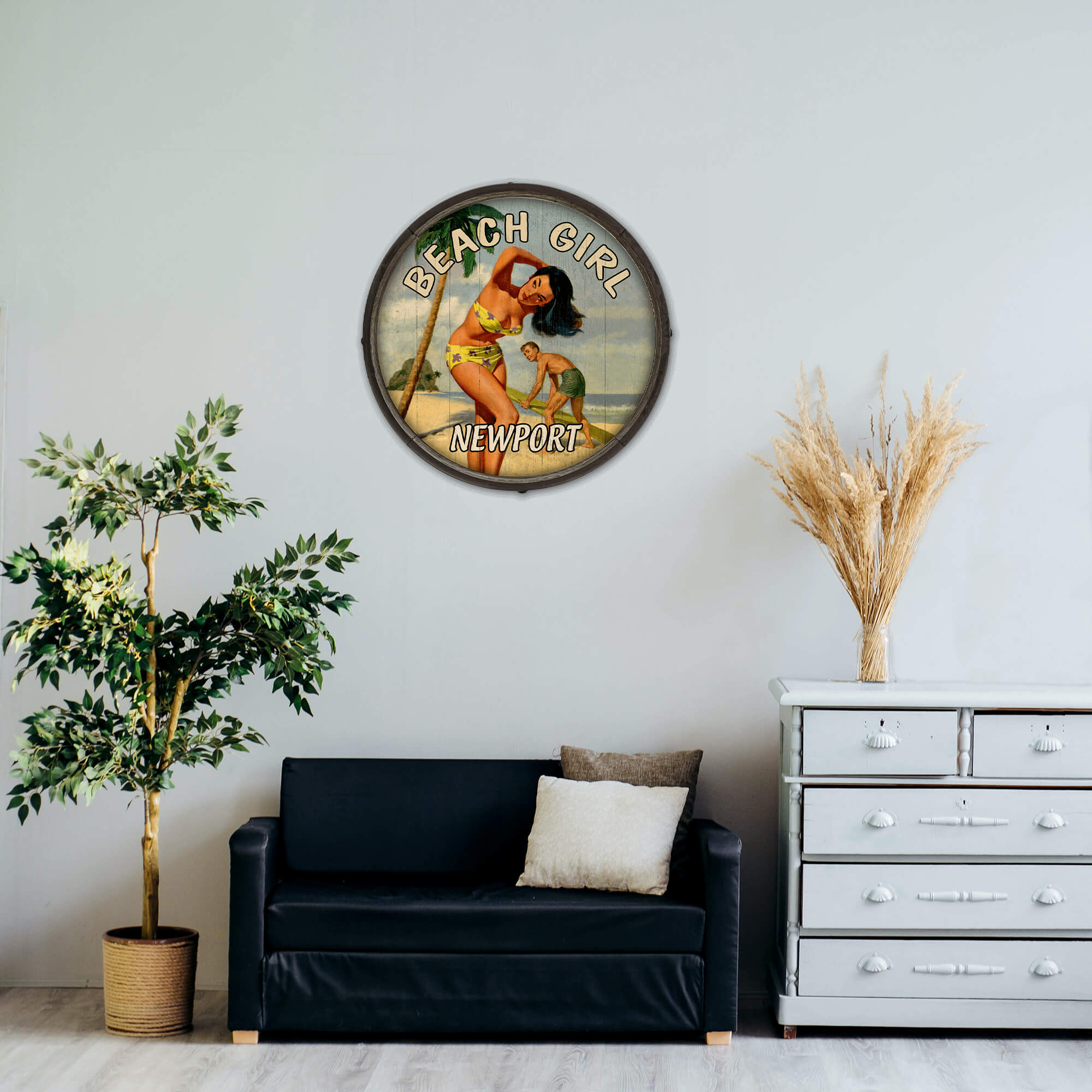 Add a touch of retro charm to your decor with this nostalgic barrel end wall art. Capturing the classic allure of 1950s beach culture, this artwork features a vibrant illustration of a beach scene with a stylish woman in a vintage bikini, evoking the carefree spirit and timeless beauty of Newport Beach. Perfect for enthusiasts of vintage Americana and coastal aesthetics, this sign is ideal for hanging in beach houses, sunrooms, or any space that celebrates the sun-soaked days of summer.