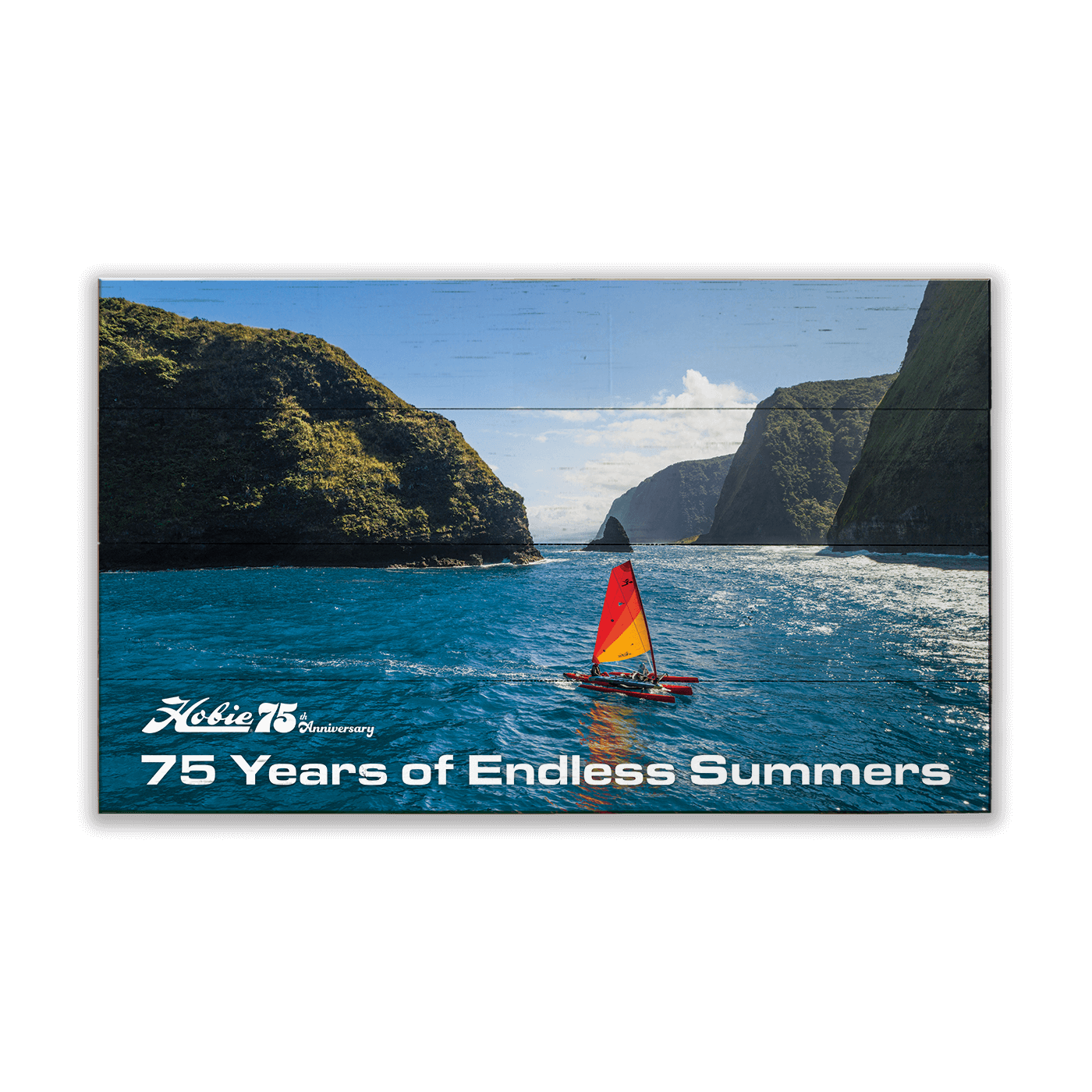 This scenic artwork features a colorful Hobie catamaran gliding through deep blue waters, framed by dramatic coastal cliffs and sunlit skies. The vivid sail and expansive seascape evoke a sense of freedom, adventure, and connection to nature. Perfect for sailors, outdoor enthusiasts, and fans of coastal living, this special edition tribute to 75 years of Hobie’s legacy adds a breezy, inspirational touch to beach homes, lake cabins, boat houses, or any space that celebrates life on the water.