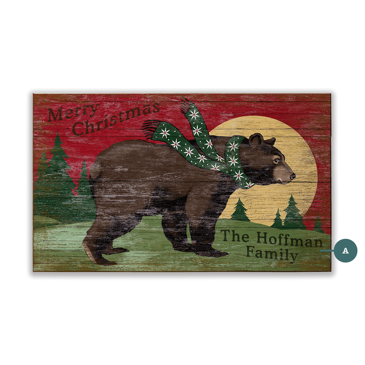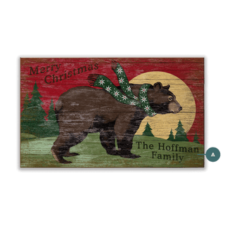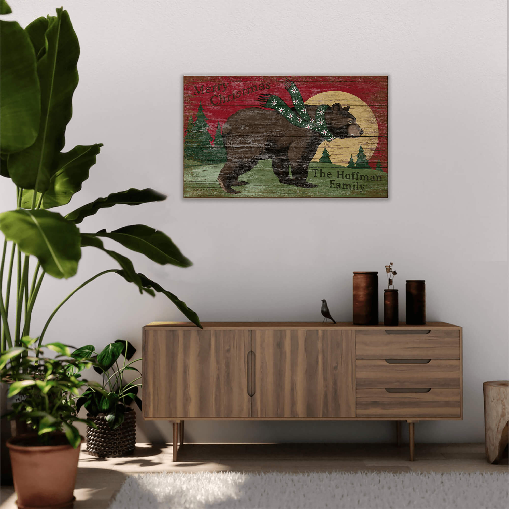 This festive holiday artwork features a bear wearing a cozy scarf, walking through a wintery forest scene. The rustic, hand-painted style and warm color palette create a charming and nostalgic feel, perfect for adding a personal touch to your Christmas decor. With its playful woodland theme and vintage-inspired design, this piece brings the joy and warmth of the holiday season into any home, making it an ideal addition for those who love nature-inspired or farmhouse holiday decorations.
