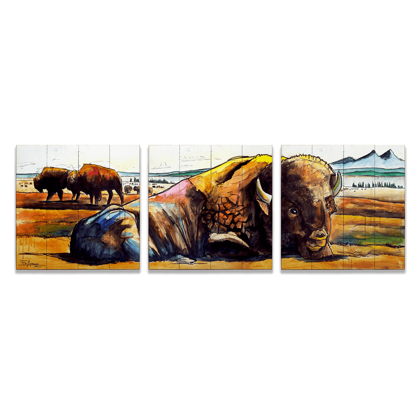 This striking triptych celebrates the majesty of the American bison in a vivid three-panel display. The artist captures the imposing presence of the bison, often referred to as the American buffalo, in stunning detail, highlighting its rugged form and resilient spirit. The warm, earthy tones and expansive landscape in the background transport the viewer to the vast plains of North America, where these magnificent creatures roam freely. The artwork's dynamic composition and rich colors make it a powerful tribute to this iconic symbol of the American wilderness.