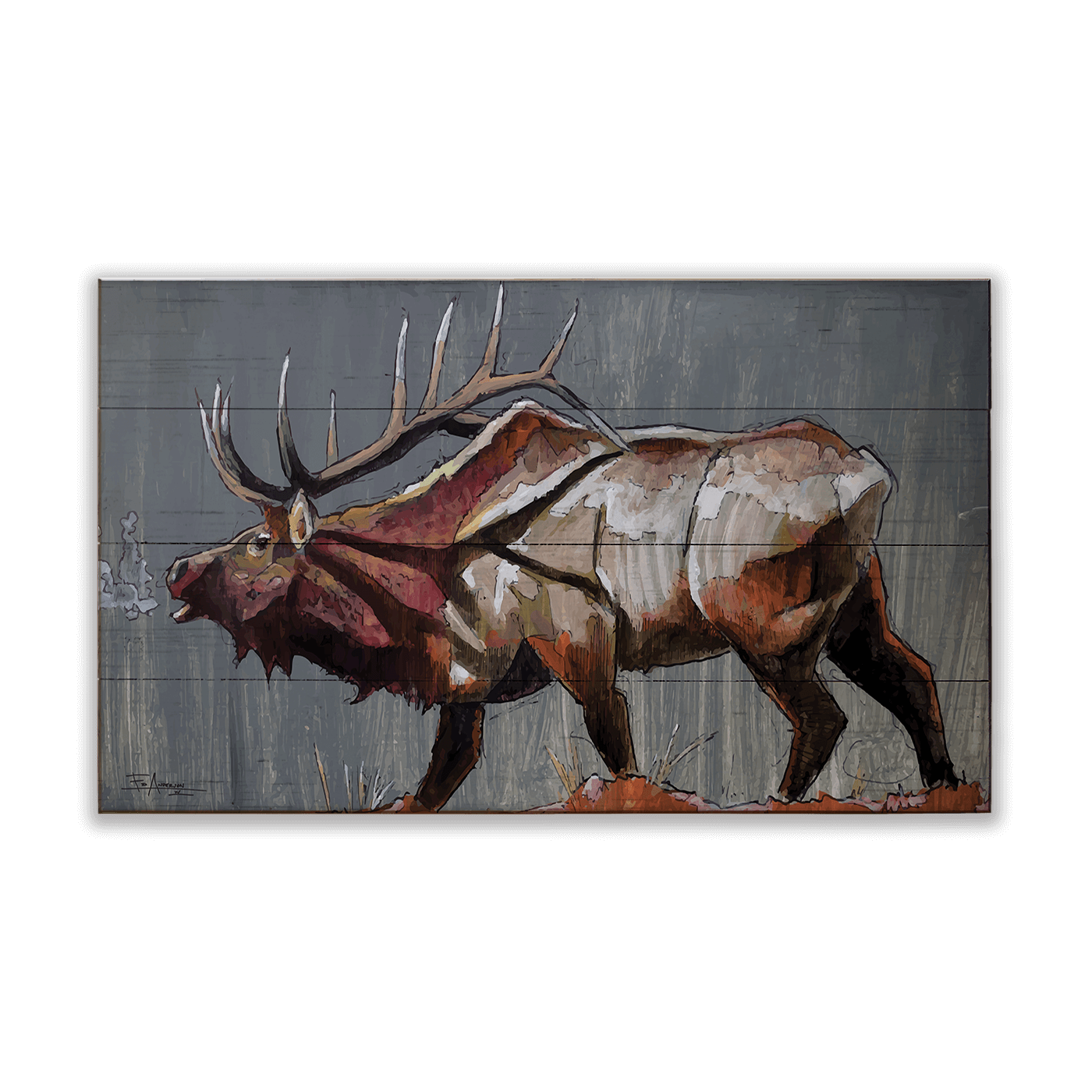 This captivating artwork depicts a majestic bull elk bugling in the early morning, with steam visibly rising from its mouth. The artist skillfully captures this iconic display of nature's power using rich colors and expressive brushstrokes to evoke the elk's intense call and presence. The background sets a vivid stage for the elk's commanding stance, embodying the beauty and majesty of wildlife at dawn. This piece is a perfect addition for anyone captivated by the raw splendor of the wild.