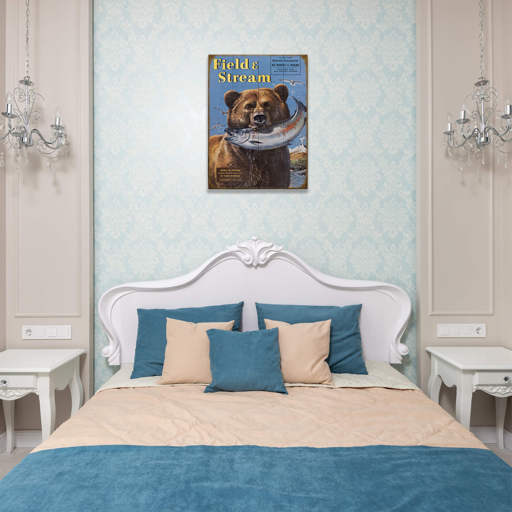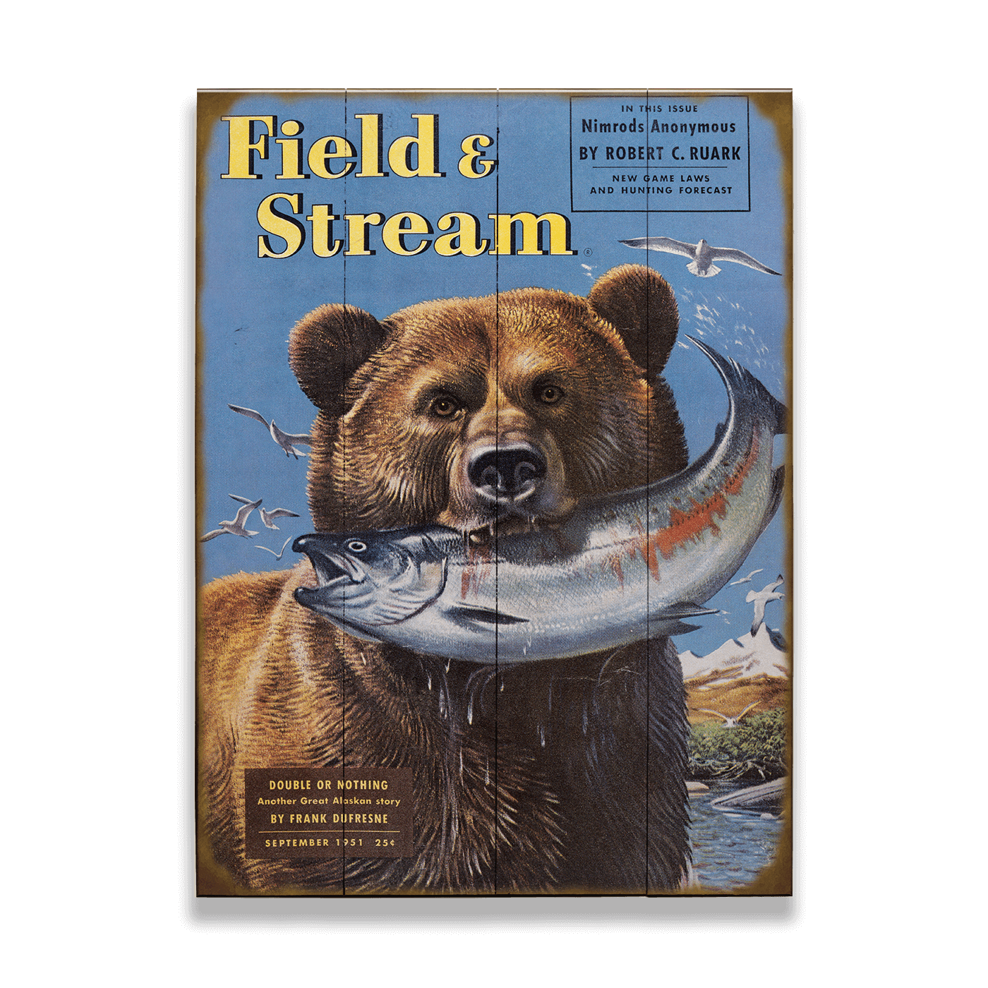 Experience the raw power of nature in any space with this Field and Stream cover from September 1951. A massive grizzly bear locks eyes with the viewer, a salmon gripped firmly in its jaws, water still dripping from the fresh catch. The backdrop of swirling gulls and rugged wilderness captures energetic instinct, unmatched strength, and the pulse of the north. Perfect for cabins, lodges, or outfitter spaces, this piece is a tribute to the untamed spirit of the great outdoors, the fall run, and the predators who fish without tackle.